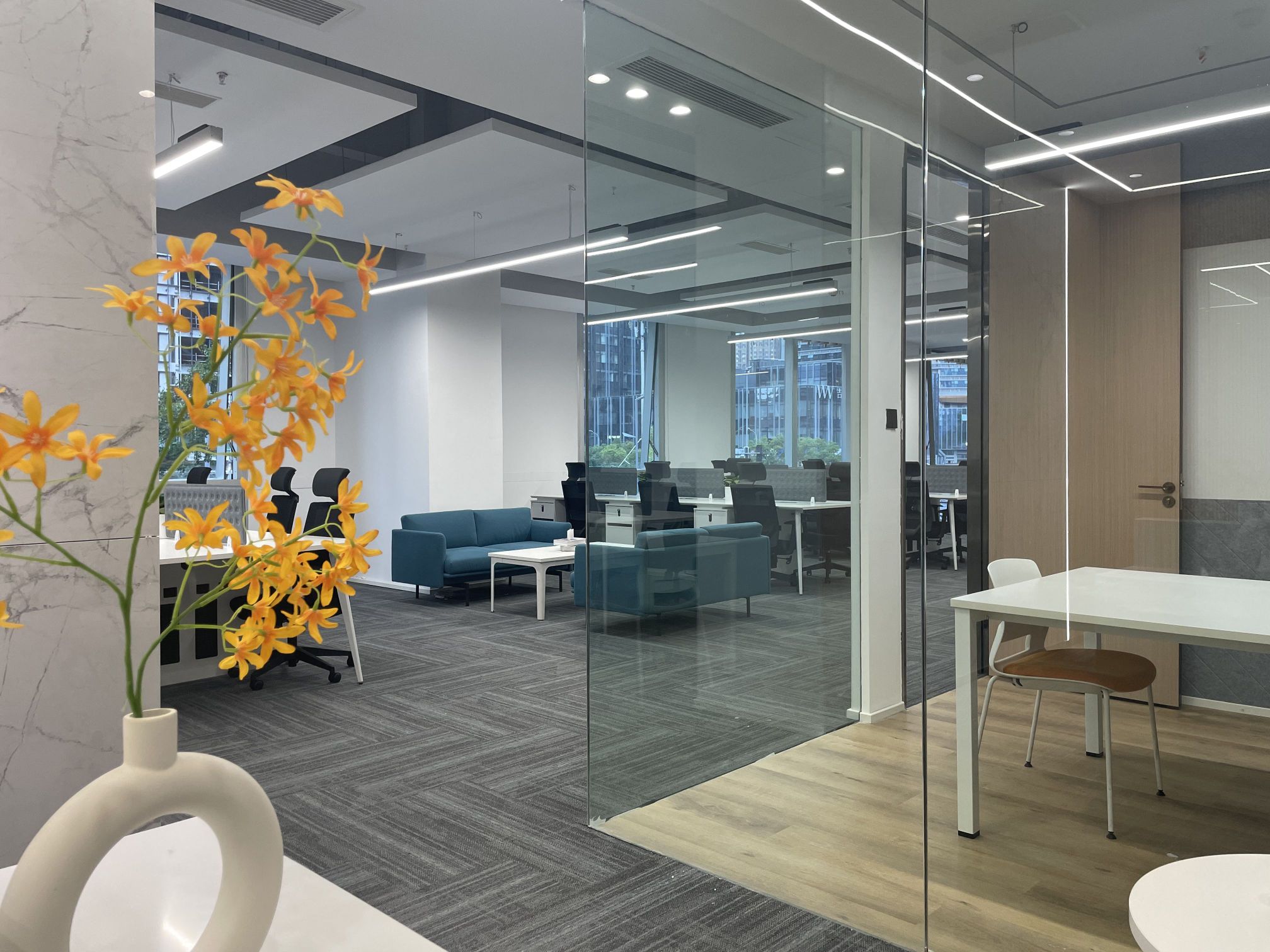 会议与协作区:配备多功能会议室和协作空间,满足不同规模的会议和讨论需求。