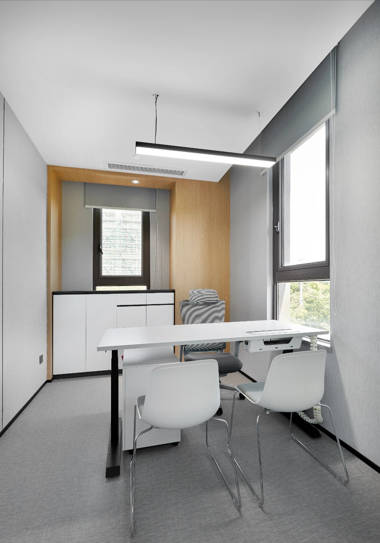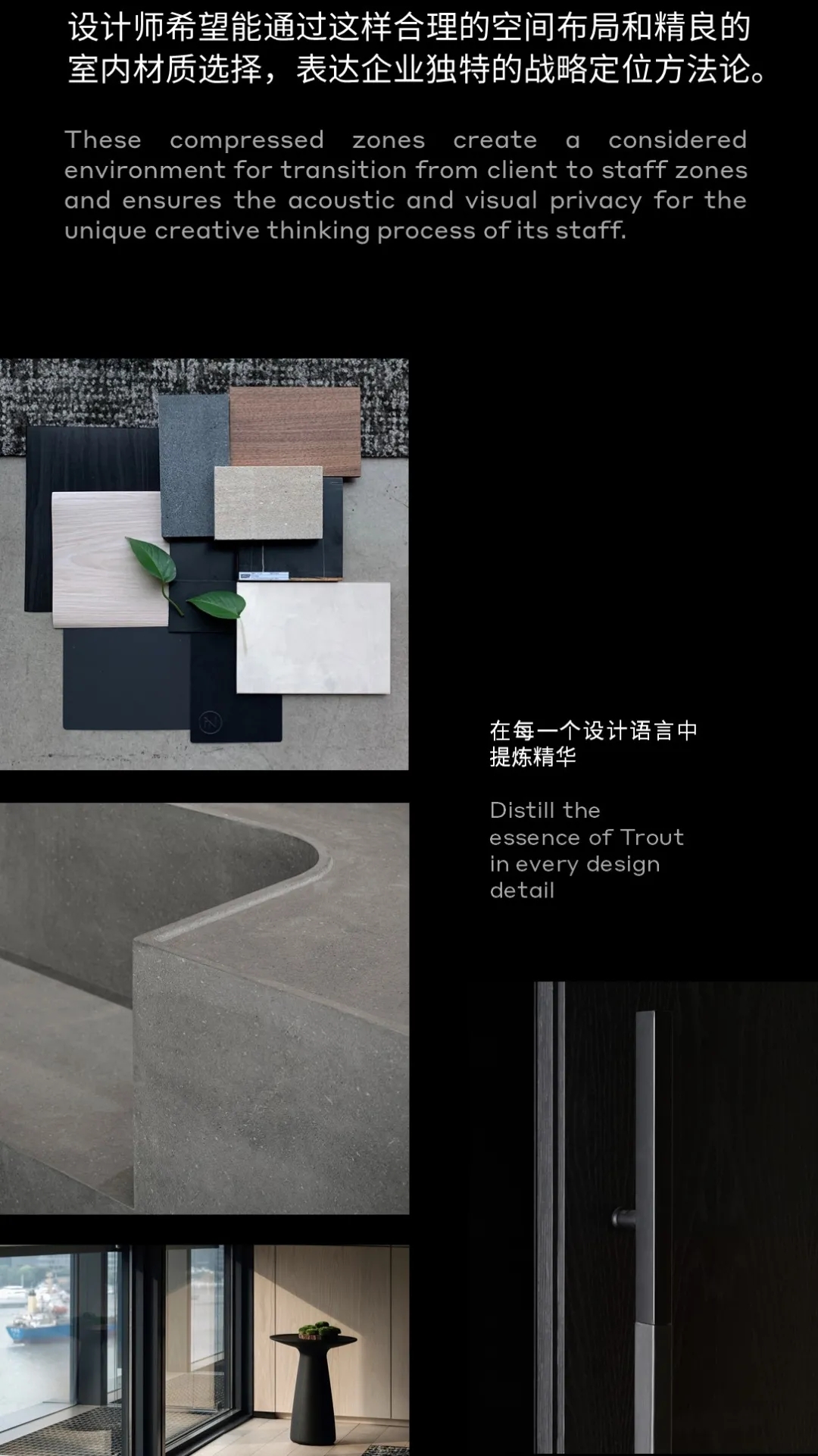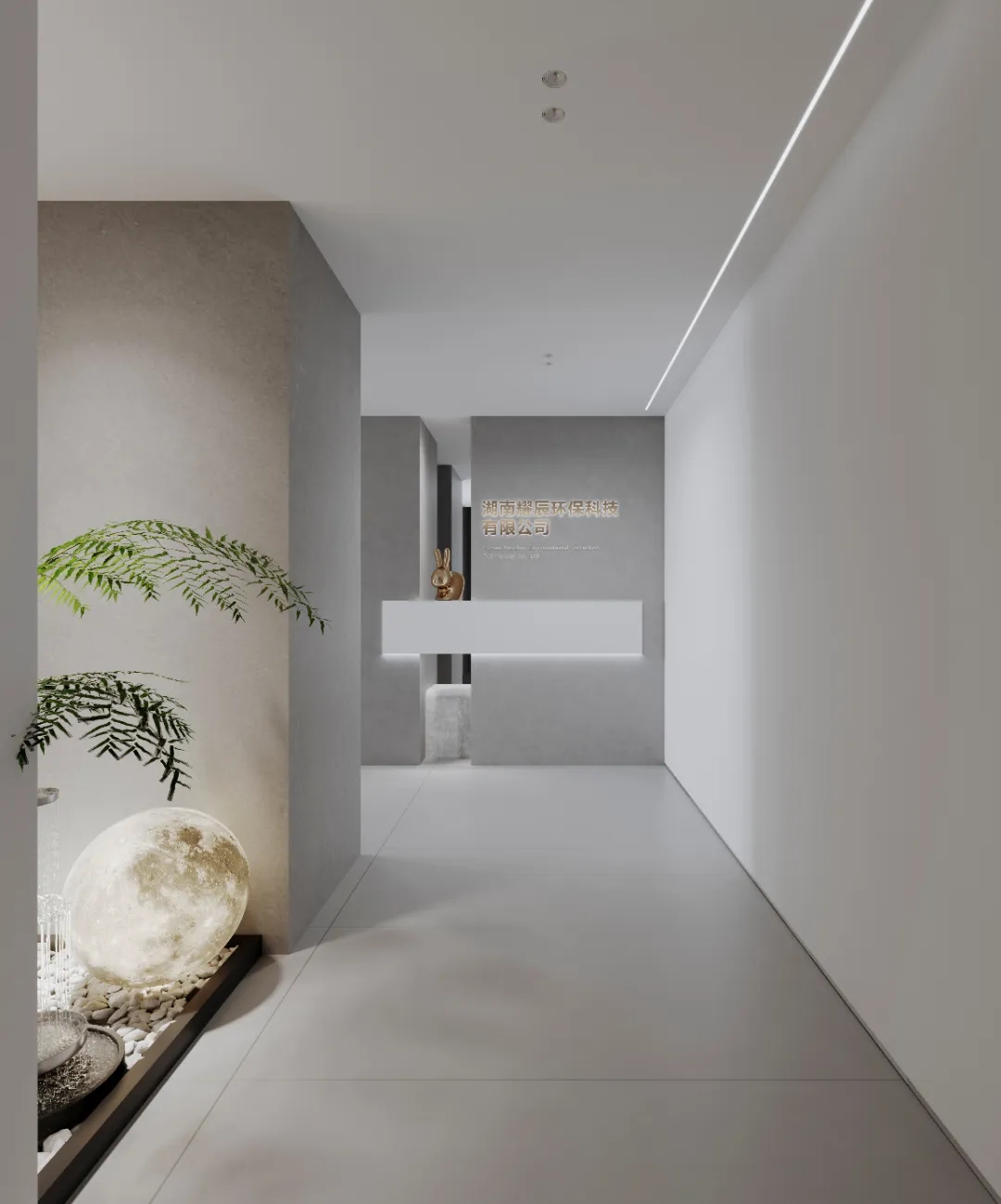 门厅材质选用微水泥,纹理细腻,增强墙面肌理质感,完美地呈现出现代极简主义的写意之美。素色空间中绿植的点缀犹如点睛之笔,赋予美的同时,仿若一抹流动的绿意,为空间加持生机与活力。会议室同样以“简静”为主题,局部以企业文化宣传墙调和空间气质,展示品牌实力,多媒体影视装置加强了墙面空间的信息辐射作用,为参会者提供高效舒适的视觉体验。总经理办公空间并没有过多的繁杂的装饰,品质,时尚,舒适与艺术,对于私人办公空间尤为重要。地毯、木质、皮质等温润材料的选择柔化了室内空间,创造了温暖的的质感,可以畅快地感受空间尺度感与自由。