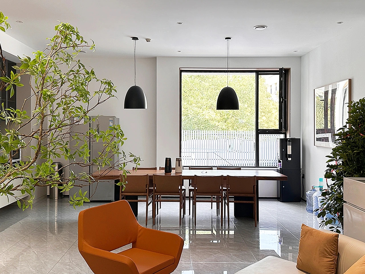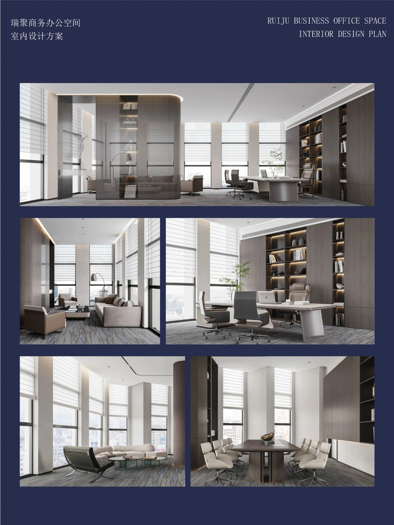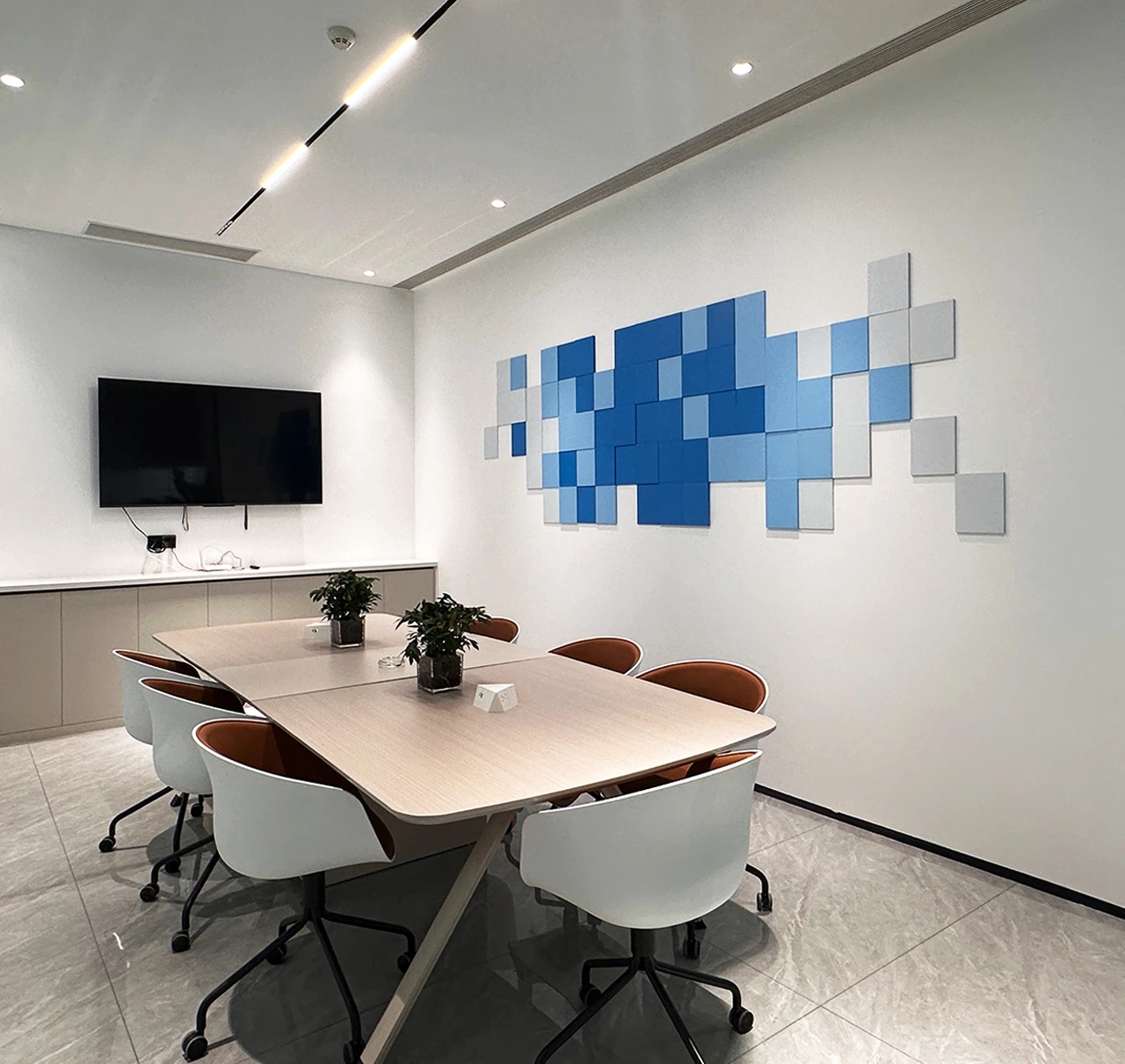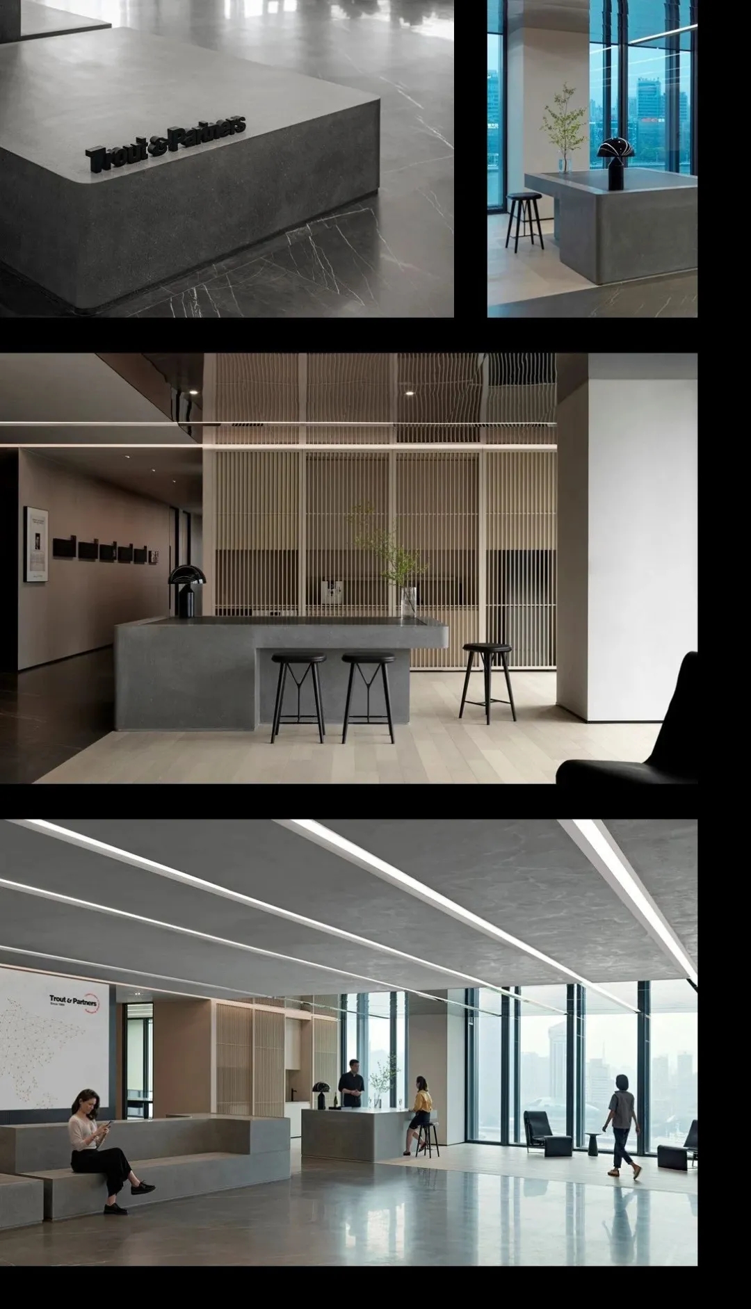 门厅材质选用微水泥,纹理细腻,增强墙面肌理质感,完美地呈现出现代极简主义的写意之美。素色空间中绿植的点缀犹如点睛之笔,赋予美的同时,仿若一抹流动的绿意,为空间加持生机与活力。会议室同样以“简静”为主题,局部以企业文化宣传墙调和空间气质,展示品牌实力,多媒体影视装置加强了墙面空间的信息辐射作用,为参会者提供高效舒适的视觉体验。总经理办公空间并没有过多的繁杂的装饰,品质,时尚,舒适与艺术,对于私人办公空间尤为重要。地毯、木质、皮质等温润材料的选择柔化了室内空间,创造了温暖的的质感,可以畅快地感受空间尺度感与自由。