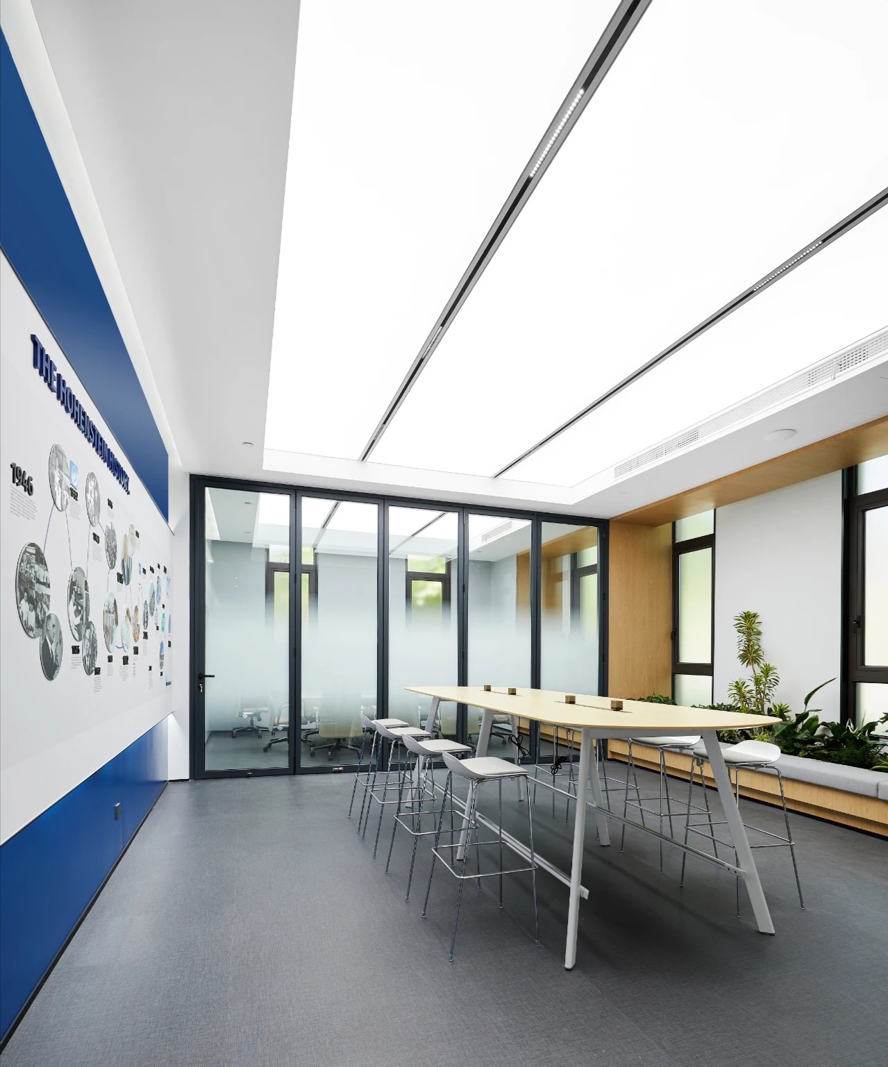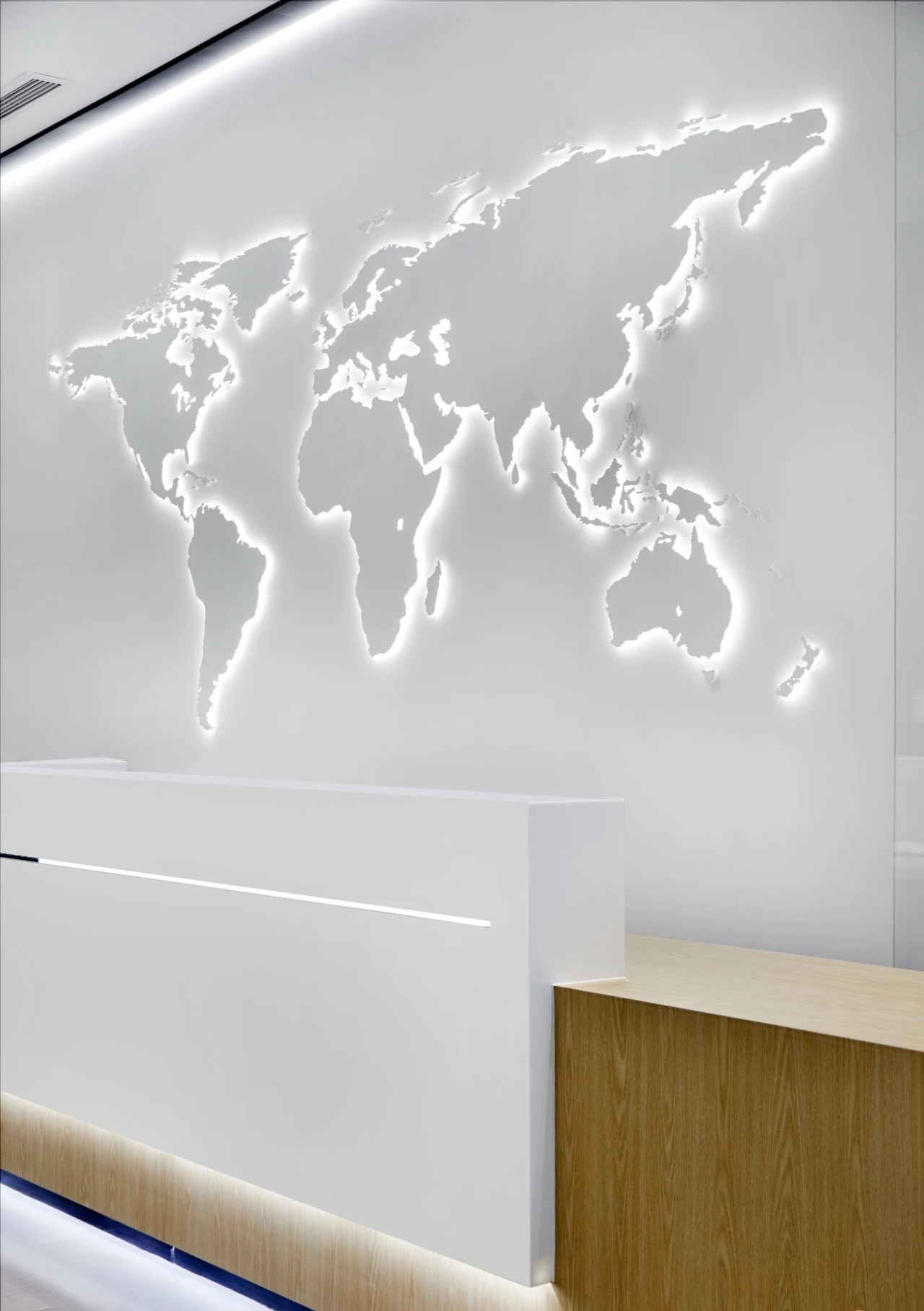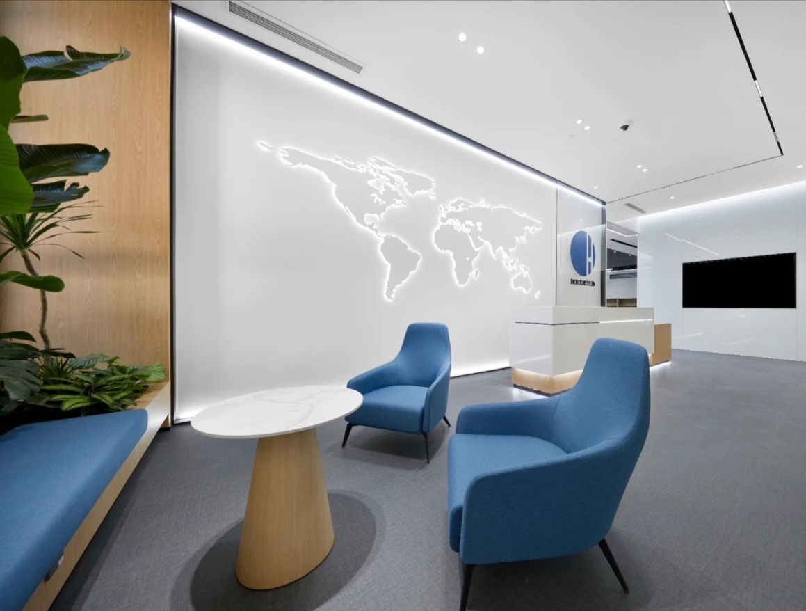 空间设计中,结合海恩斯坦的品牌企业色将不同空间层次串联起来,实现品牌力的流淌。前厅以简约基调表达高级的视觉效果,舒适的色调烘托出平静的空间氛围。发光背景墙递进空间层次。世界地图的出现构成了空间中微妙的波动,透露出独特的视觉信息。高品质的材质和高标准的施工细节成为了项目的一大亮点。减法,让空间更丰富。顶部细长的灯带增加纵深感,与挑高围合成干净通透的多功能空间。多样化的环境可以使员工自然选择,以便根据不同工作需求,进行灵活整合,开展团队协作。