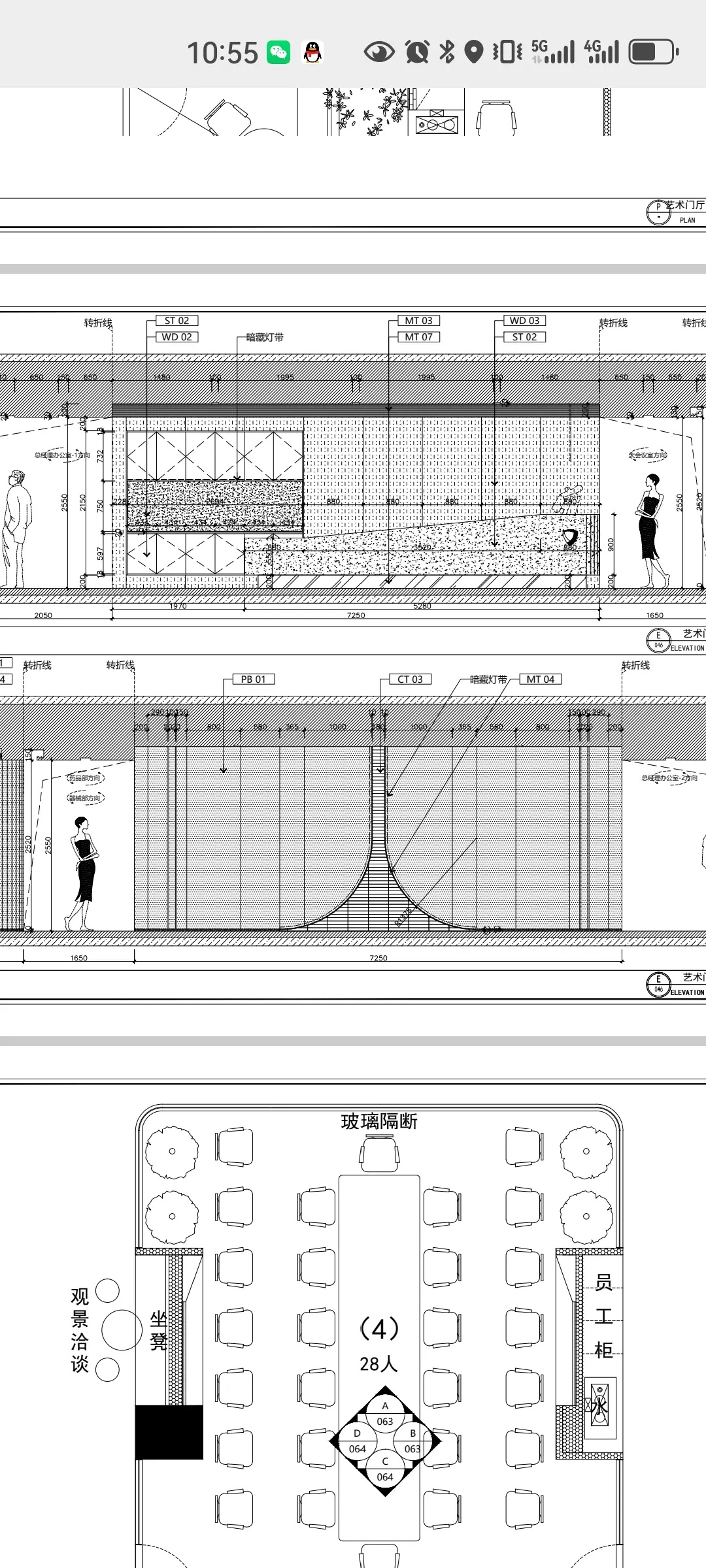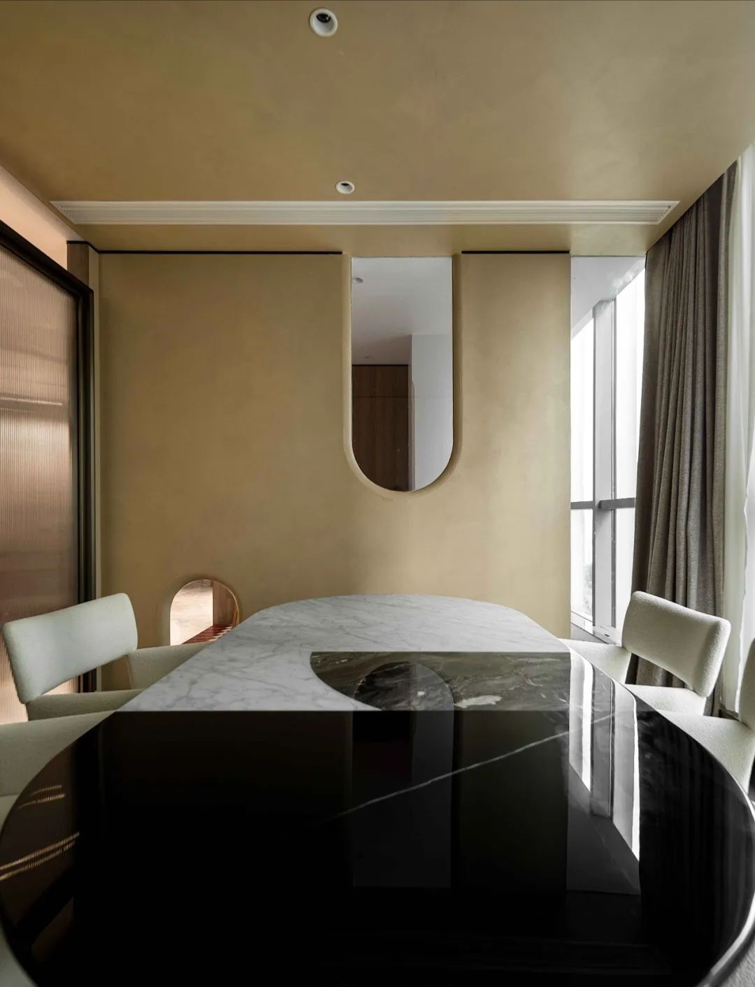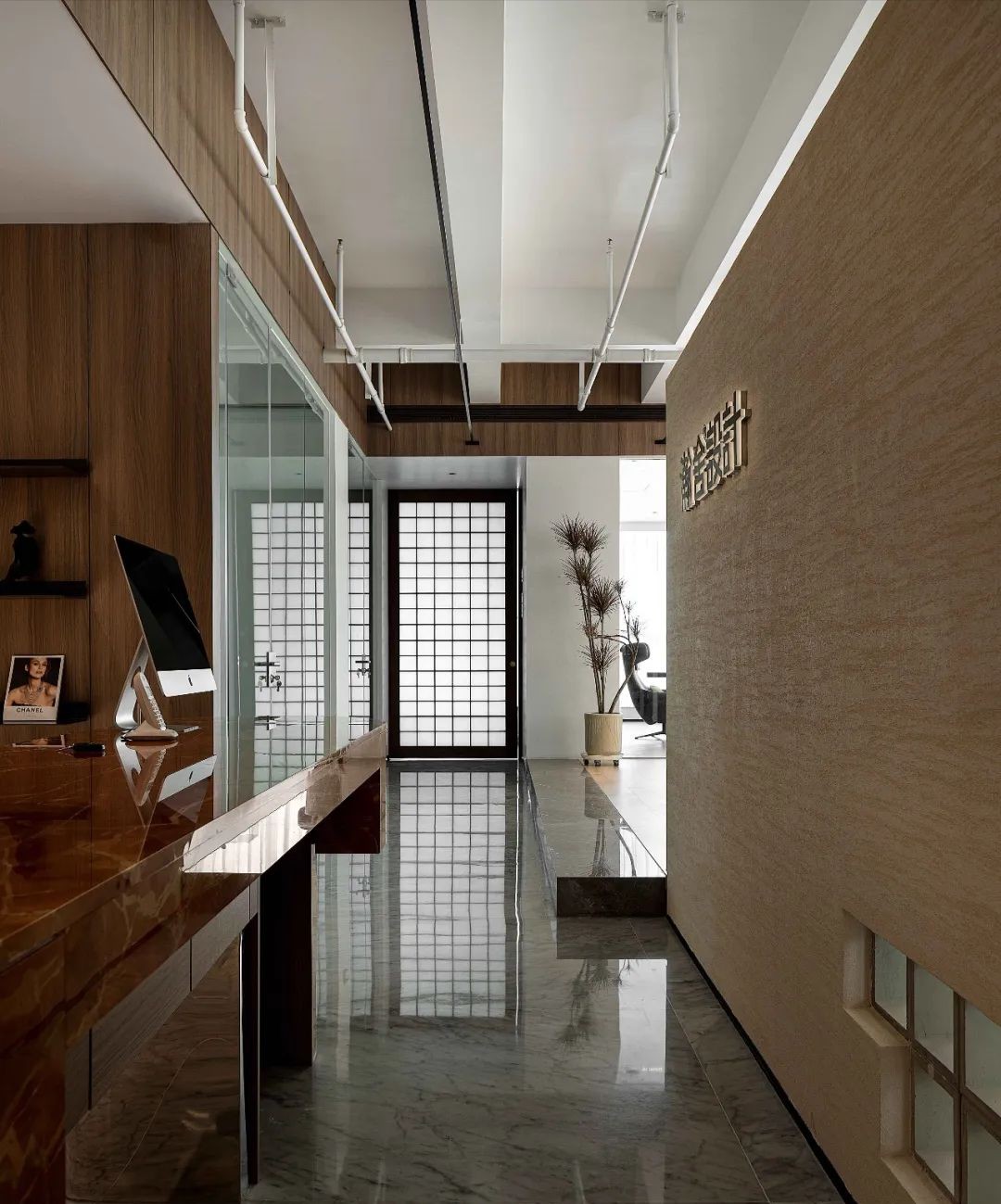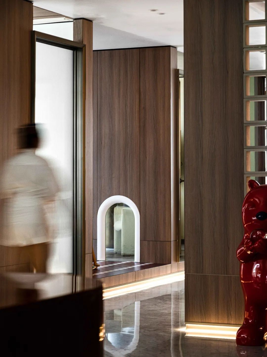 开敞前厅+卡通雕塑活泼并不影响办公;圆弧悬挑吧台增加空间的灵动性,超长天际线灯 构筑如同城市上空的画面感;最爱的中花白+珊瑚红大理石和不锈钢之间的映射,柔和与硬朗相得益彰;
