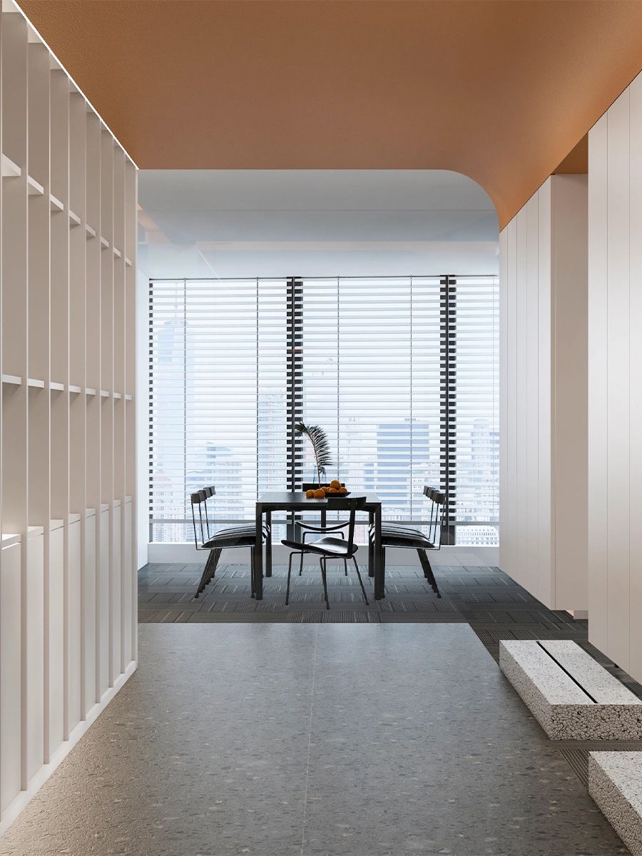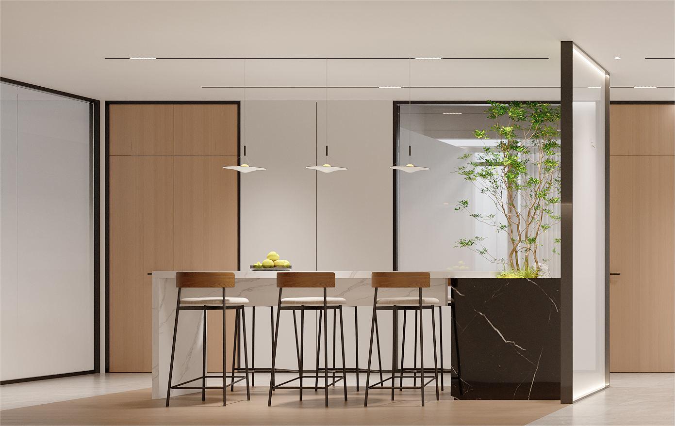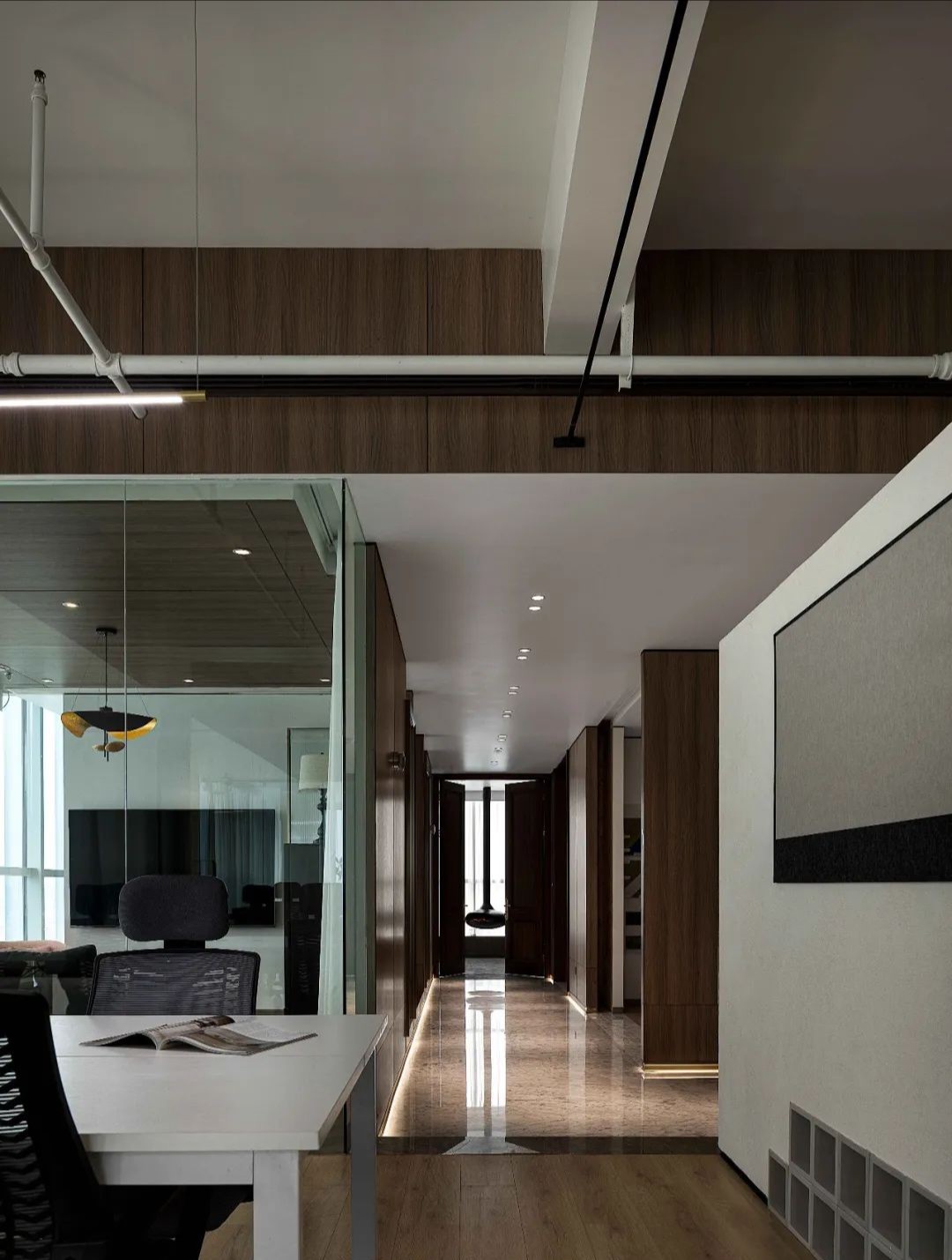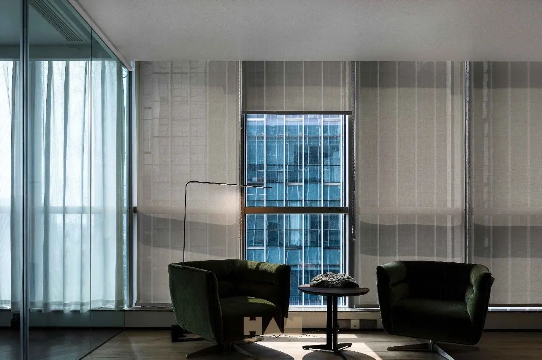 办公区两处吧台的其中一处;隐藏式冰箱+蝴蝶门的水吧操作台,加班时,总有一丝无聊和疲惫,来一杯Whiskey,让加班不那么无聊;隐藏式冰箱,外观更统一,蝴蝶门的柜门,让水吧台即使杂乱,也可以一秒钟变整洁。