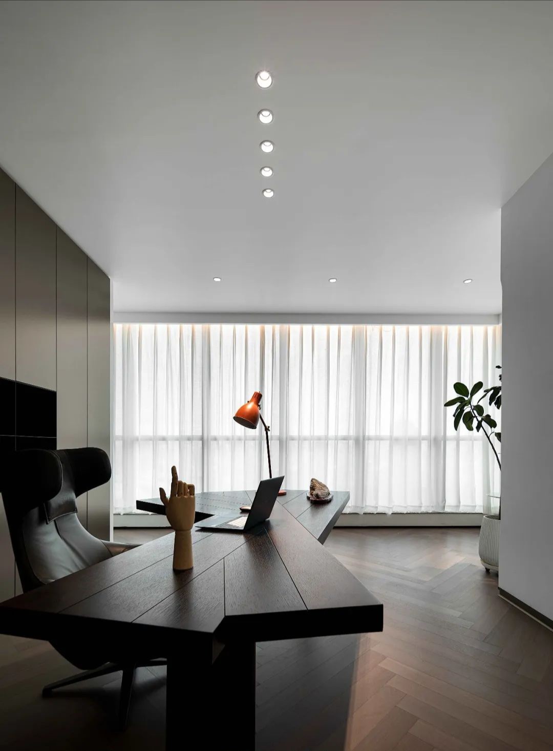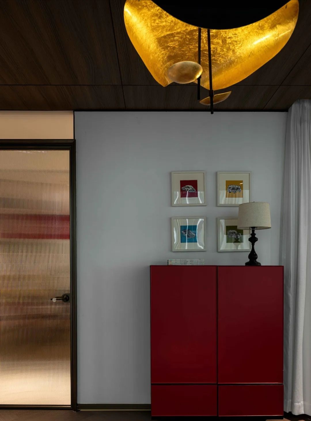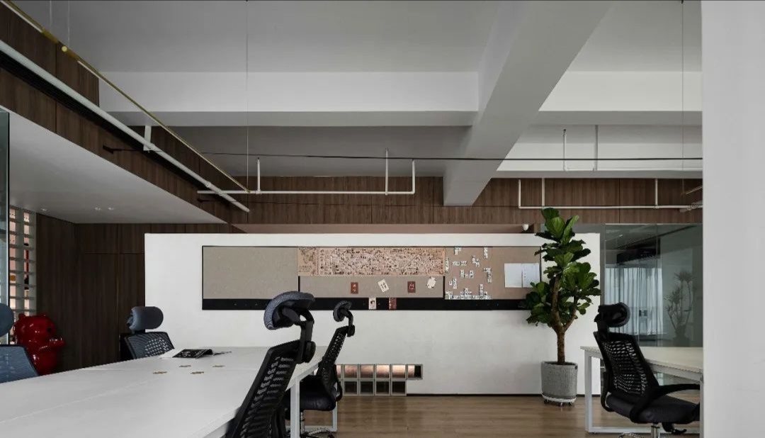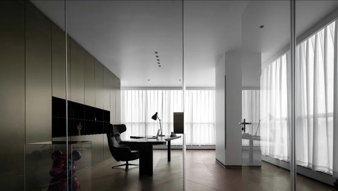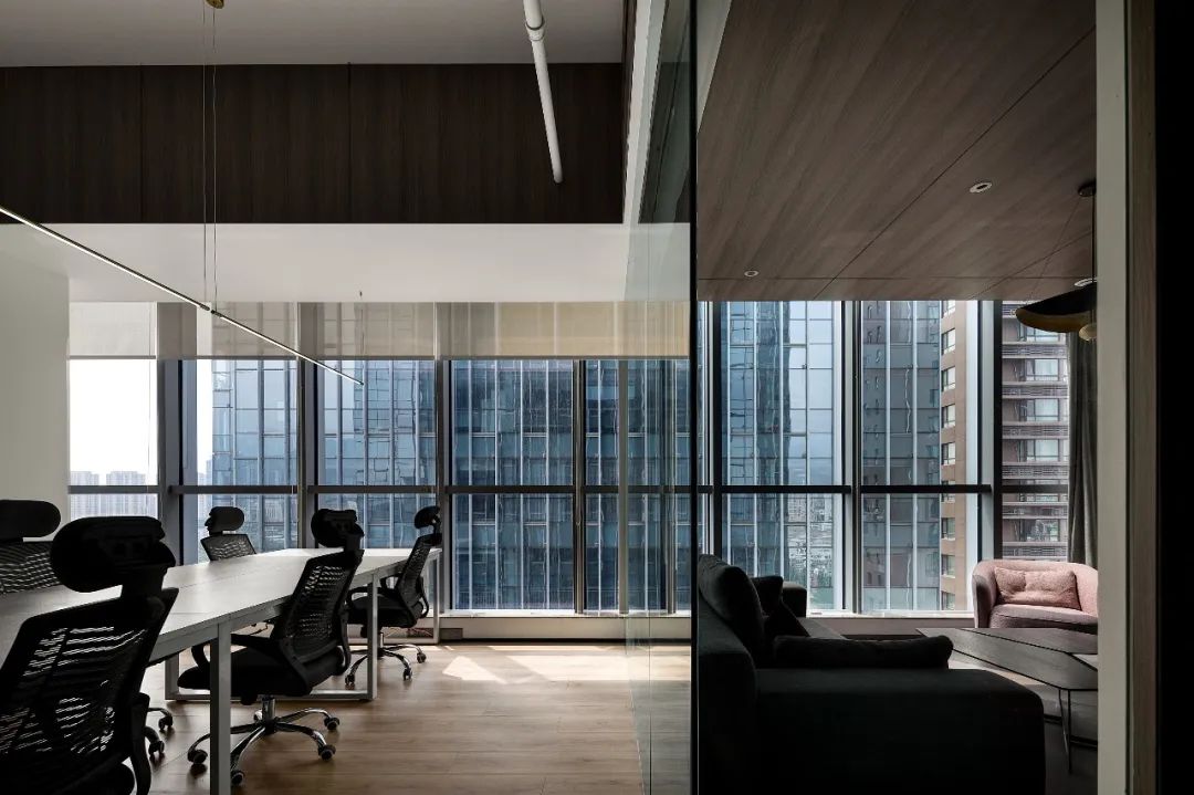 办公区两处吧台的其中一处;隐藏式冰箱+蝴蝶门的水吧操作台,加班时,总有一丝无聊和疲惫,来一杯Whiskey,让加班不那么无聊;隐藏式冰箱,外观更统一,蝴蝶门的柜门,让水吧台即使杂乱,也可以一秒钟变整洁。