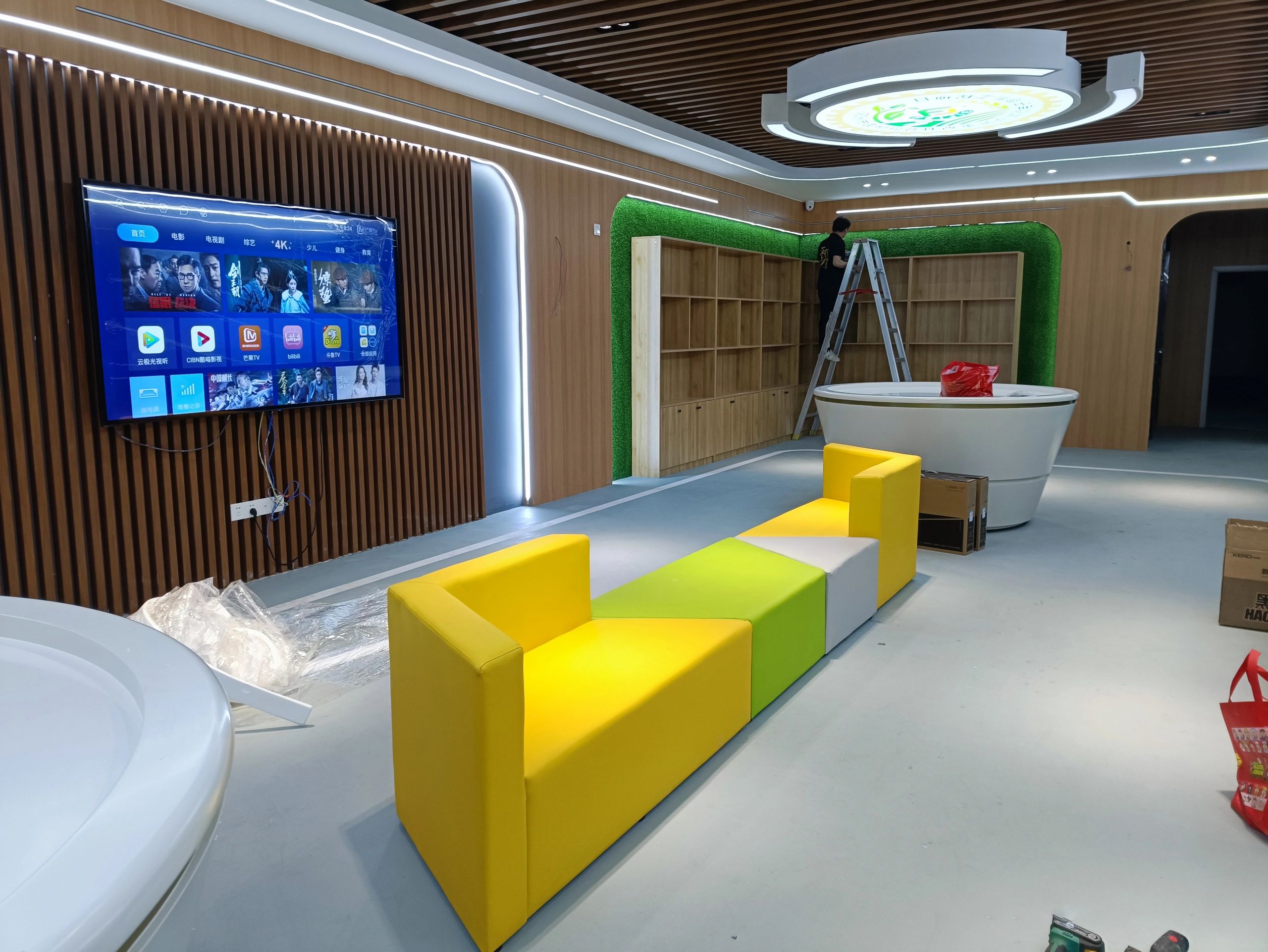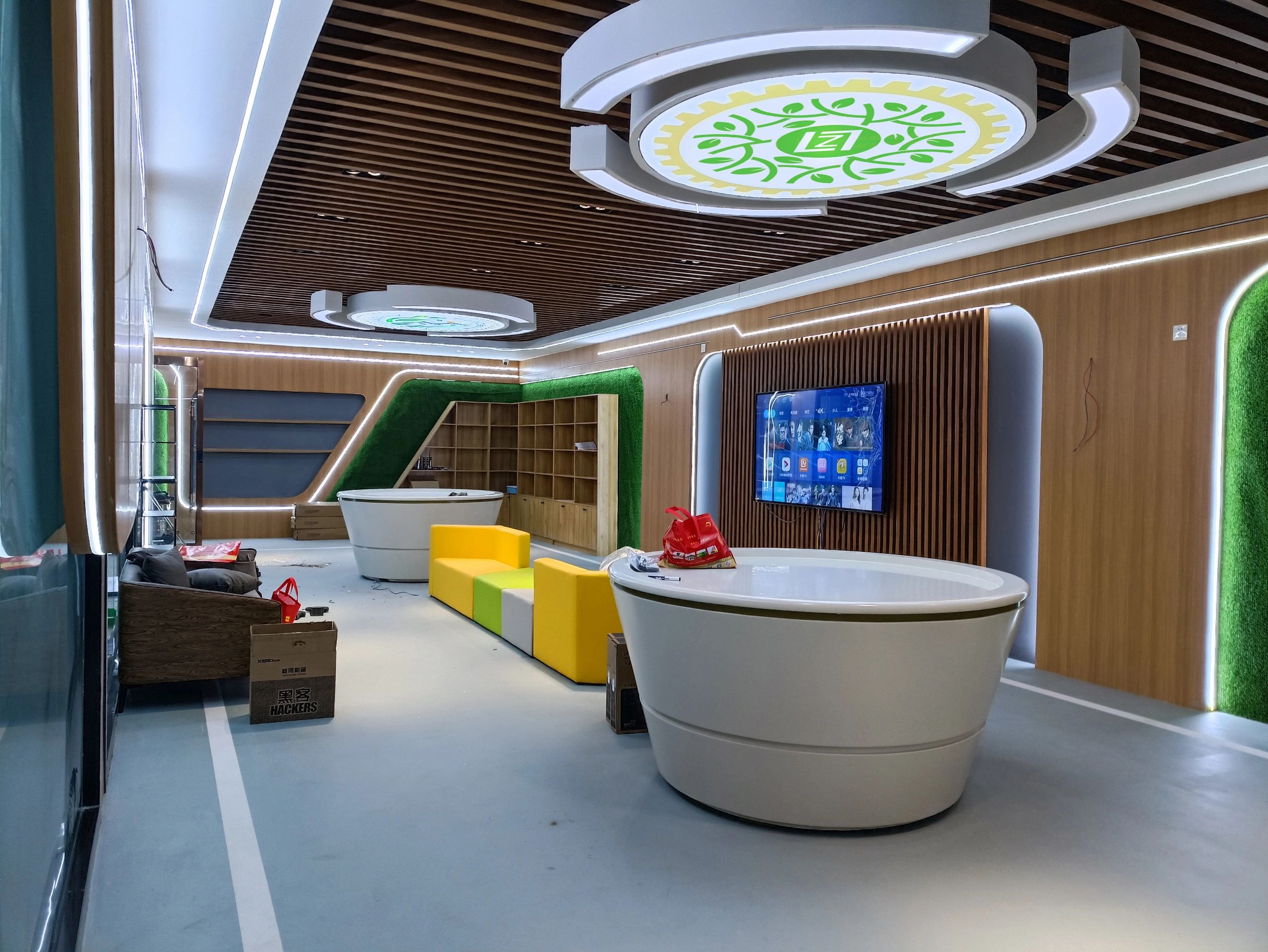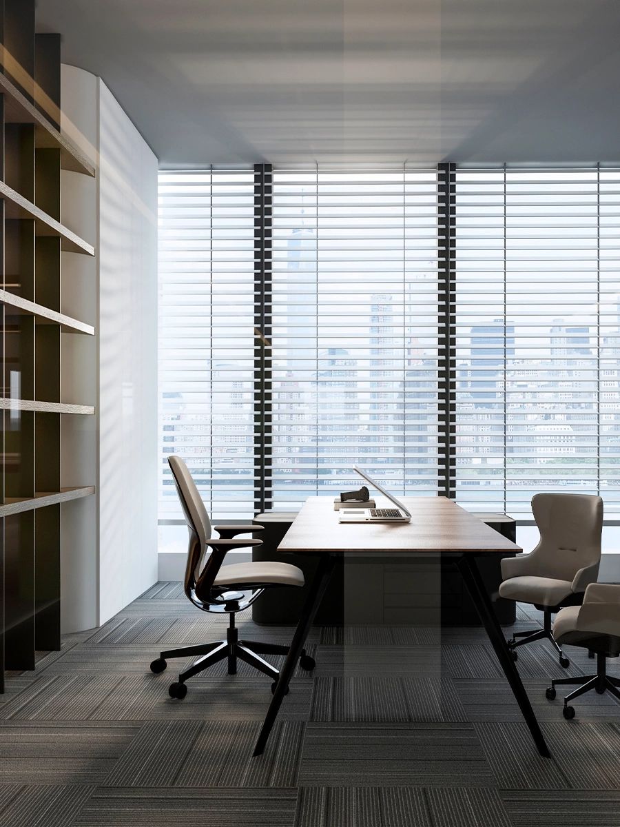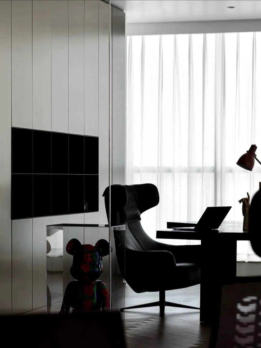 办公区两处吧台的其中一处;隐藏式冰箱+蝴蝶门的水吧操作台,加班时,总有一丝无聊和疲惫,来一杯Whiskey,让加班不那么无聊;隐藏式冰箱,外观更统一,蝴蝶门的柜门,让水吧台即使杂乱,也可以一秒钟变整洁。