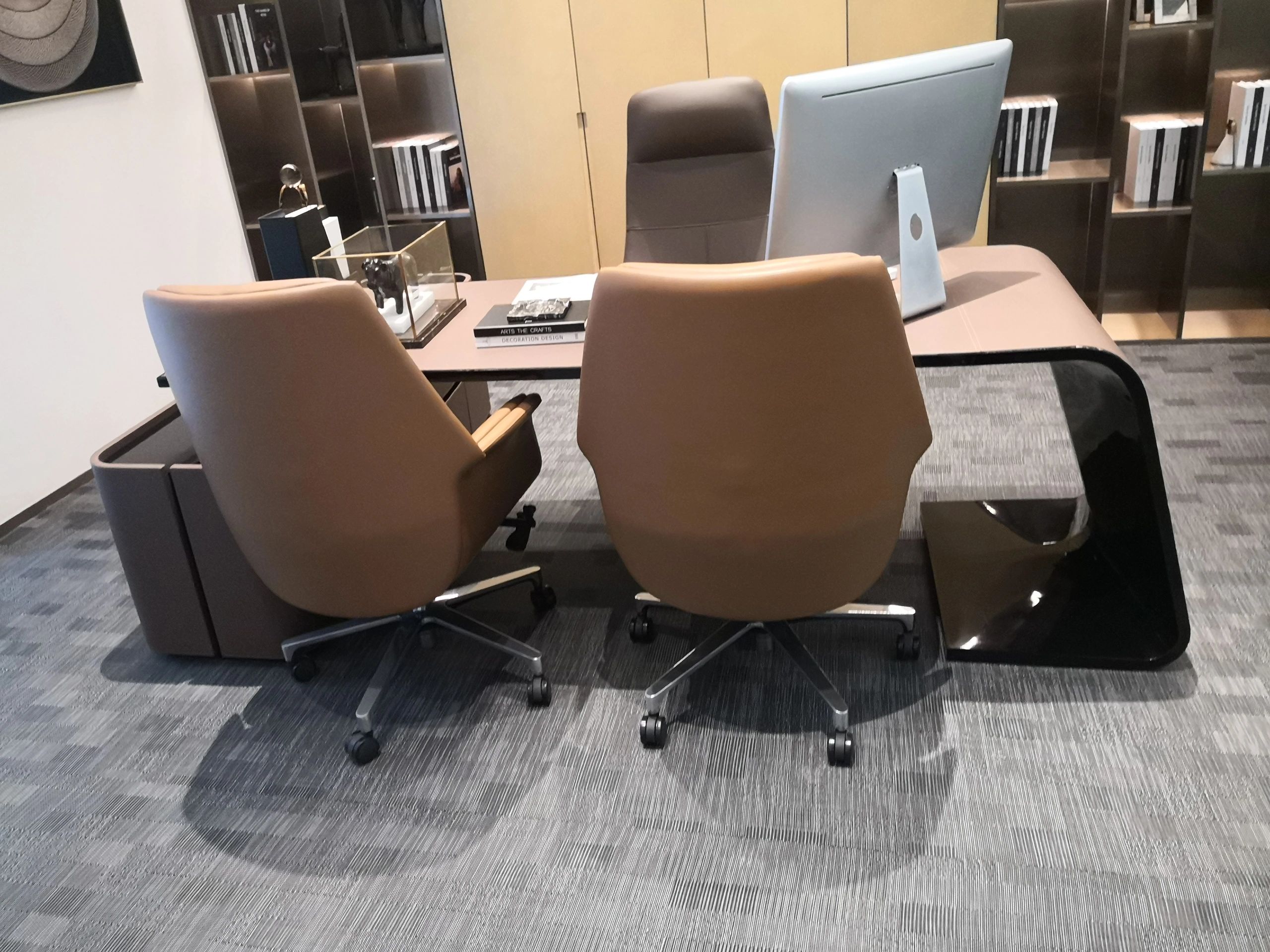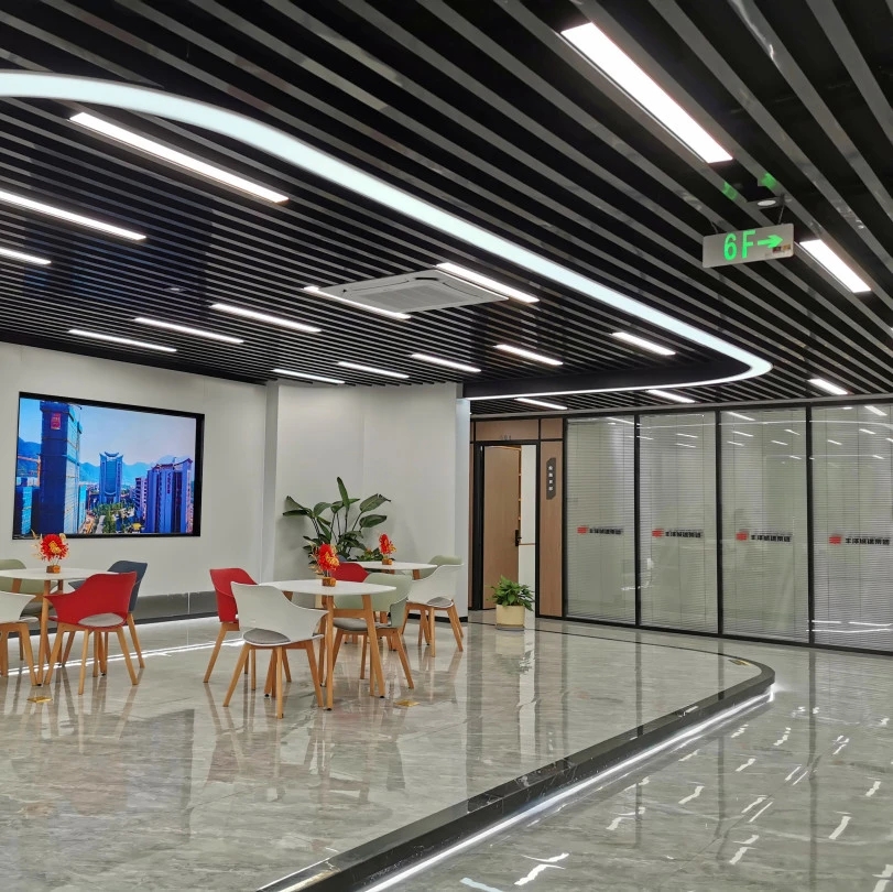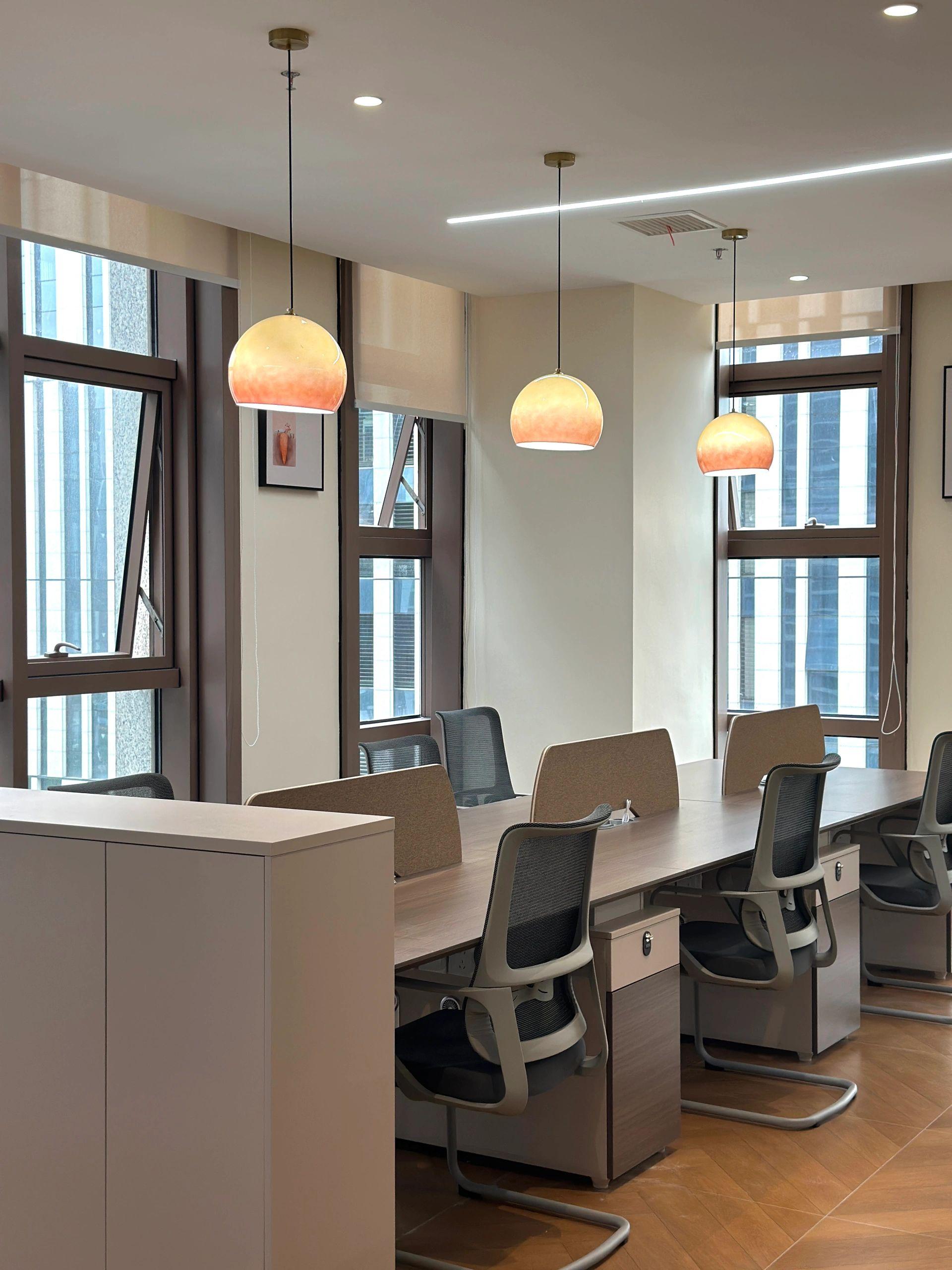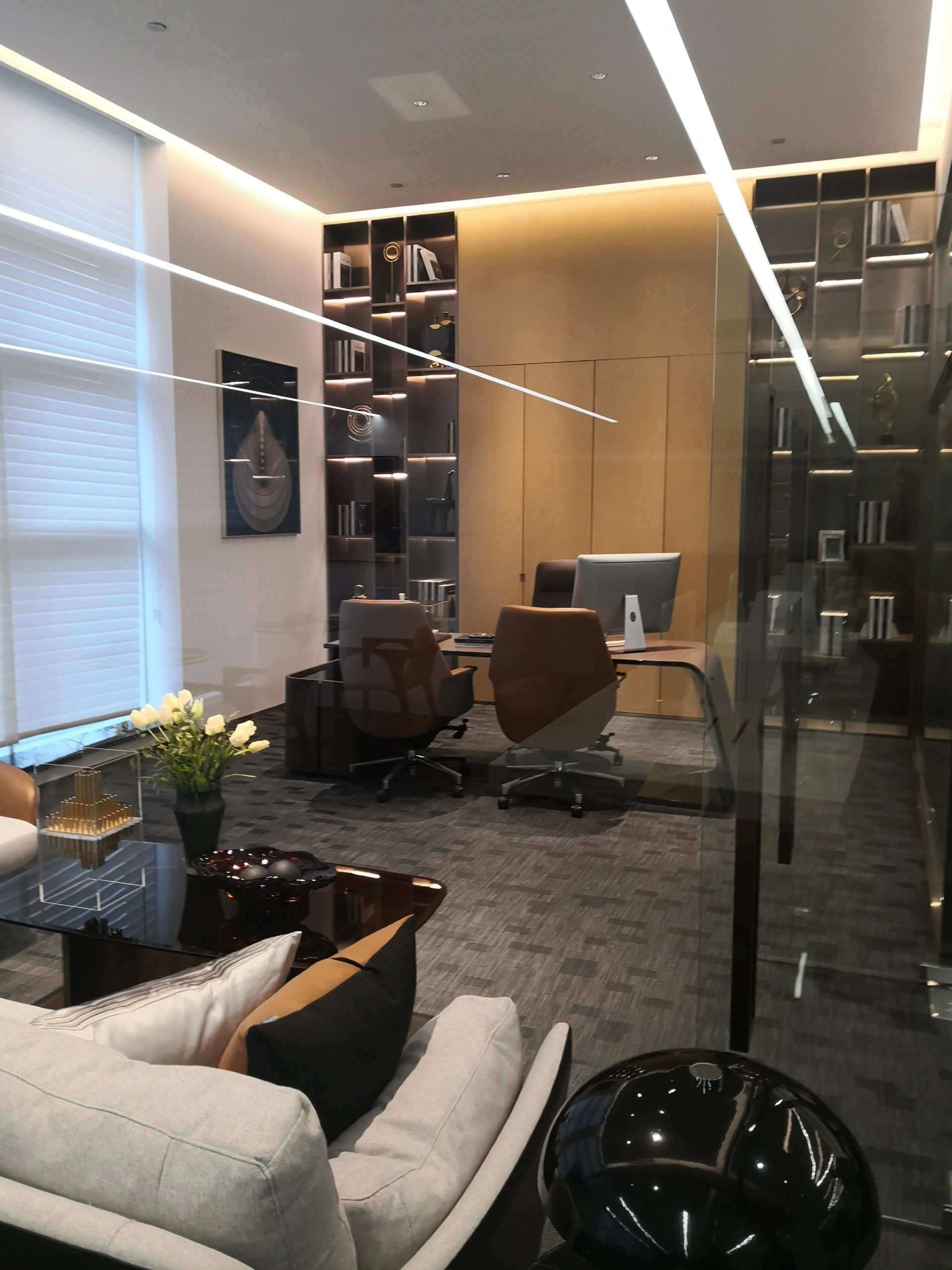 接待区色彩主要以暖色为主,加以墙面的挂画作为点缀,茂绿的盆栽更加使得空间具有生机感。在空间内加入绿植,在自然和光影变幻之间找到对心灵的冲击,为员工提供了一个轻松舒适的工作环境。开放办公区采取玻璃隔断的形式,采光好,为促进室内多样性,整体空间设计通过使用颜色、纹理、挂饰和几何形状,统一了色彩和线条,在形式与功能、风格与舒适、休闲与专业之间创造了完美平衡。董事长办公室设计现代感十足,装饰陈设上色调简洁统一,为办公区域提供了一个美观、实用的空间。超大落地窗保障了区域采光,低饱和度的灰色摆件、抱枕以及桌面相互协调,一扫大面积的沉闷。