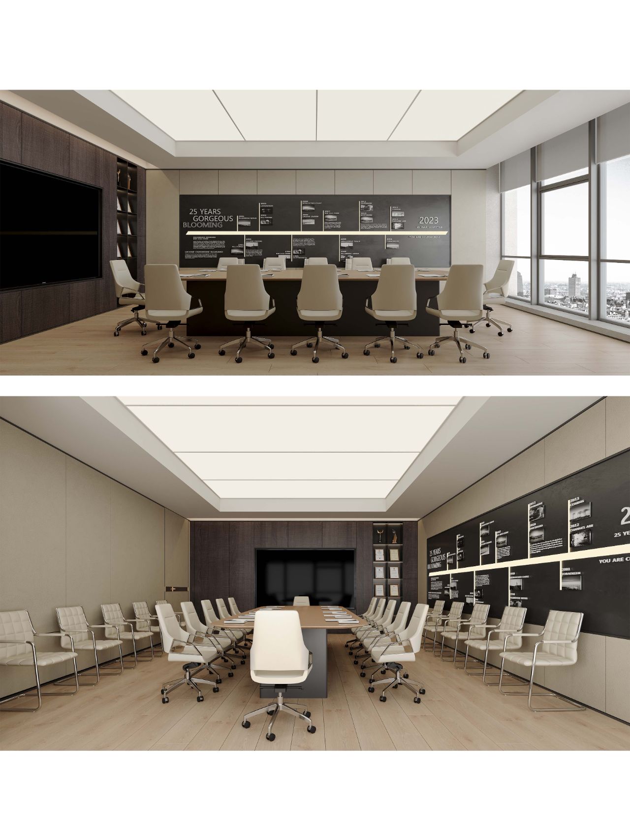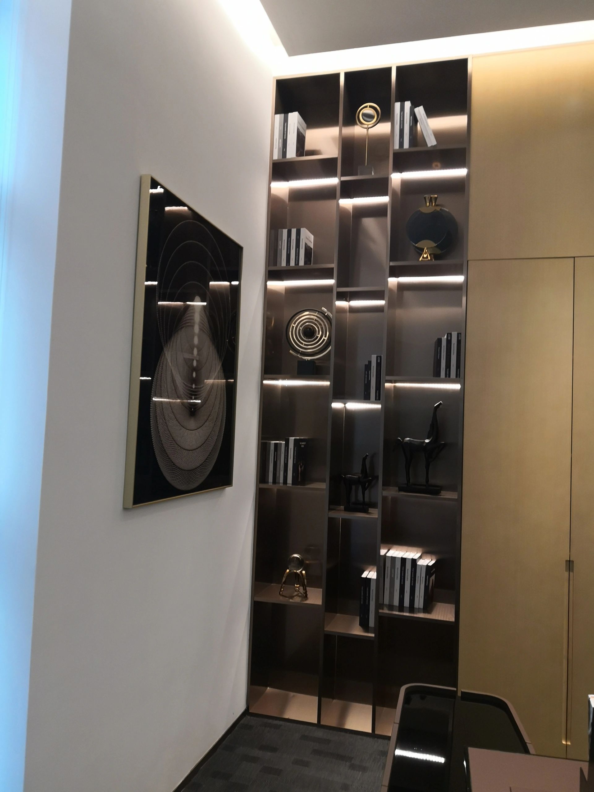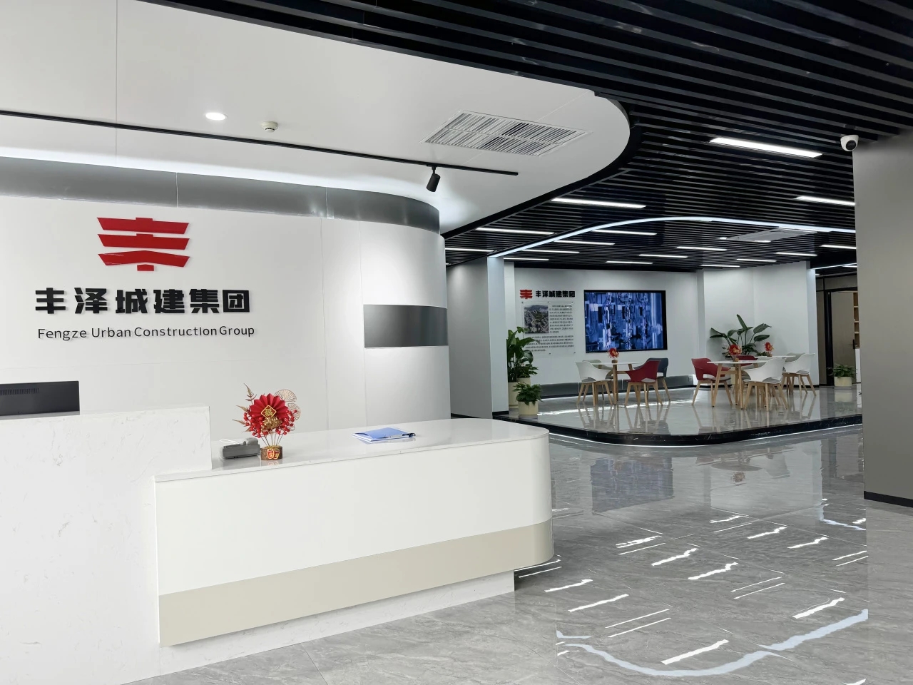 接待区色彩主要以暖色为主,加以墙面的挂画作为点缀,茂绿的盆栽更加使得空间具有生机感。在空间内加入绿植,在自然和光影变幻之间找到对心灵的冲击,为员工提供了一个轻松舒适的工作环境。开放办公区采取玻璃隔断的形式,采光好,为促进室内多样性,整体空间设计通过使用颜色、纹理、挂饰和几何形状,统一了色彩和线条,在形式与功能、风格与舒适、休闲与专业之间创造了完美平衡。董事长办公室设计现代感十足,装饰陈设上色调简洁统一,为办公区域提供了一个美观、实用的空间。超大落地窗保障了区域采光,低饱和度的灰色摆件、抱枕以及桌面相互协调,一扫大面积的沉闷。