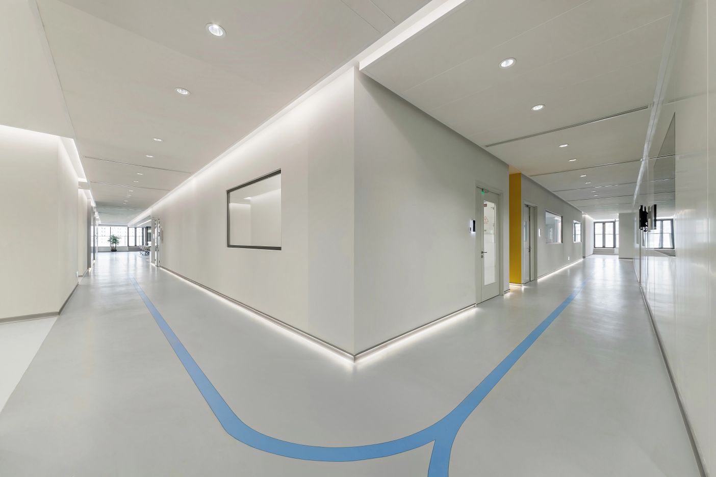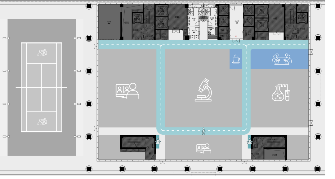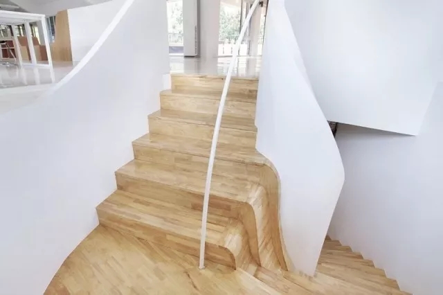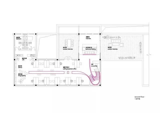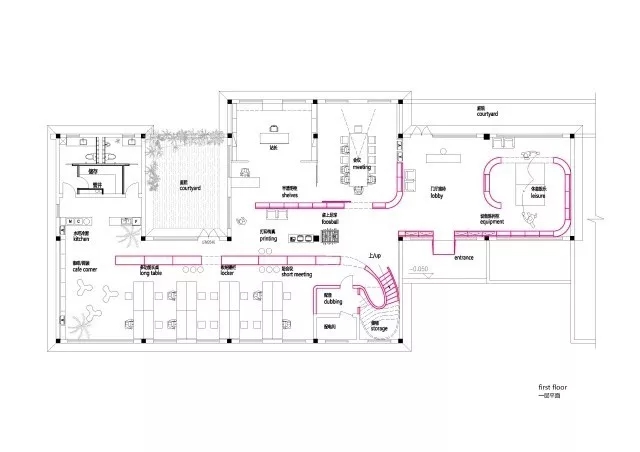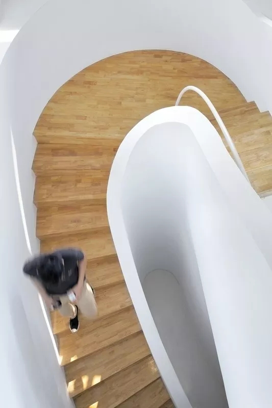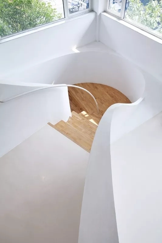 虽然基地拥有良好的室外自然景观条件,但原有建筑内部阴暗压抑:已有结构的1层层高3.3m,梁下高度2.6m, 空间比例相对低矮;2层空间的高度具有优势,但1,2层的联系较弱,原有建筑的双层特点也并没有展现出来。因此设计一开始考虑的是如何让上下层联系起来,不只是在空间上,也是在未来使用者的心理感知层面上。让楼上和楼下的人都能感觉另一部分成员的存在,营造出团队感。在氛围上希望营造出完全开放,具有空气感的流动空间。不止是单层平面的流动,还是上下层之间的流动感。如果我们把空间里的家具看成物体(object),把墙体,楼梯等结构看成背景(canvas),通过让家具(object)和结构(canvas)同化,连接,与人的身体最易发生关系的家具就会把这种流动感传递给人体。楼上的空间因为结构和家具的同化,也与楼下联系在一起。