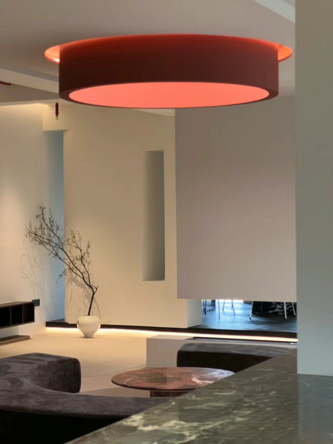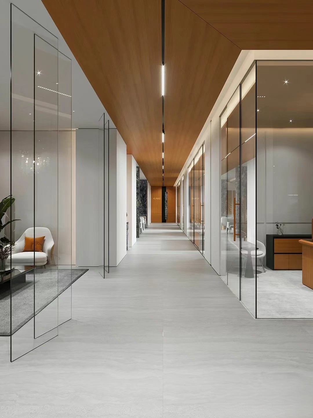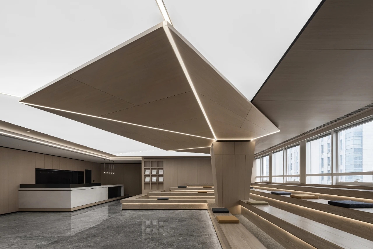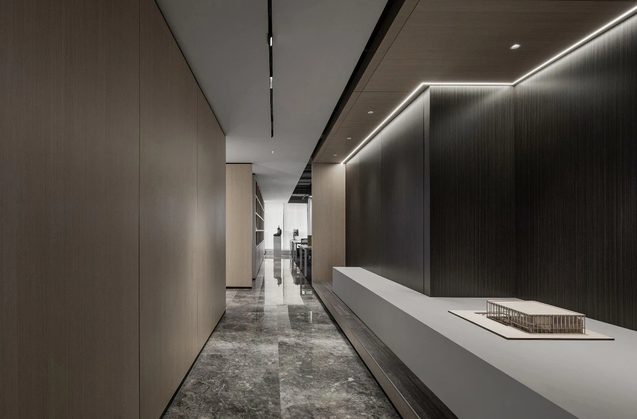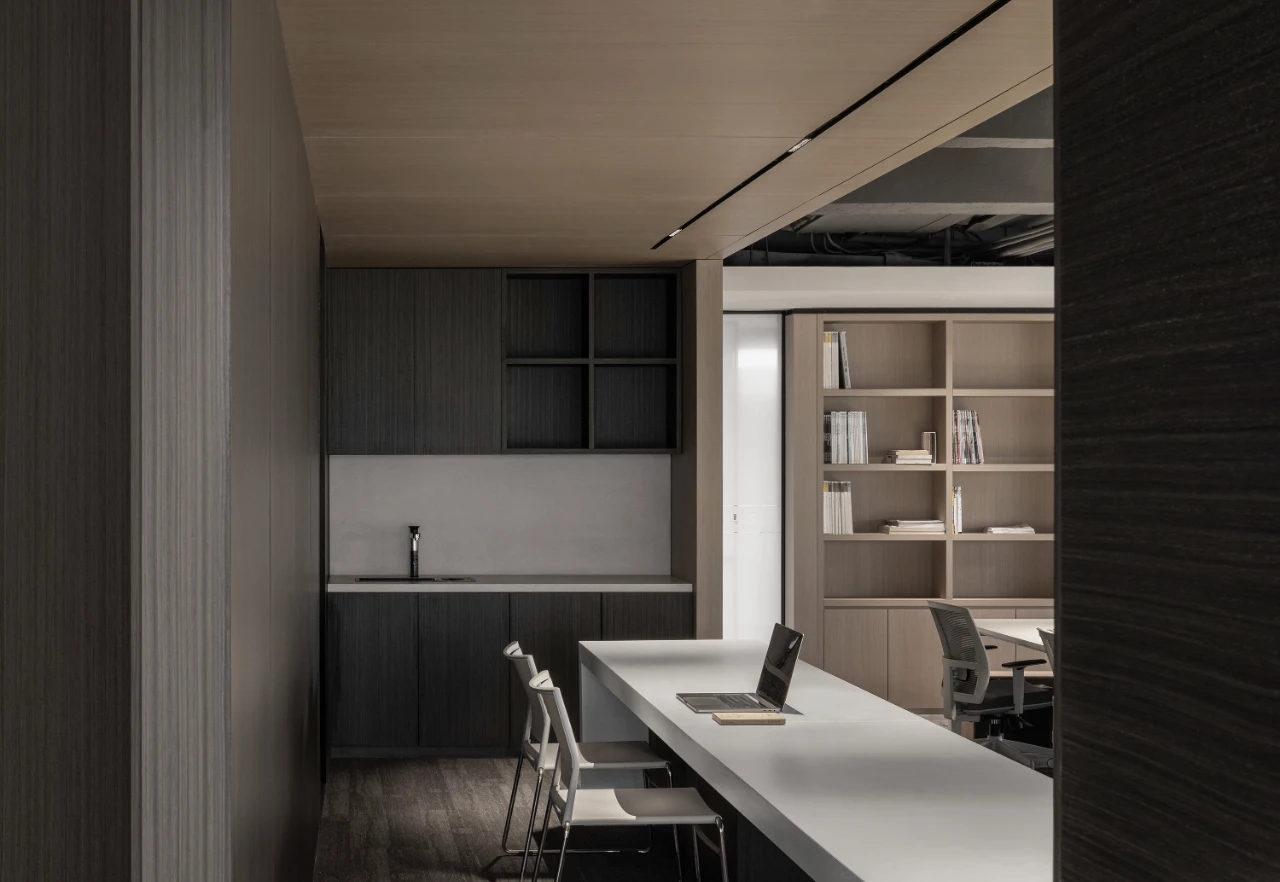 在光影变幻下,材料的本质显而易见。木作、大理石、金属、岩板等现代材料语⾔,以不同的表⾯质感演绎出多样空间表情。为更好地服务于空间里的人,设计团队做出了更多趣味性的探索,比如书架式墙体设计、手稿展示墙等。诸如此类的设计,一方面可以巧妙地稳定空间使用者心理情绪,另一方面也为品牌的长足发展起到不言而喻的作用。