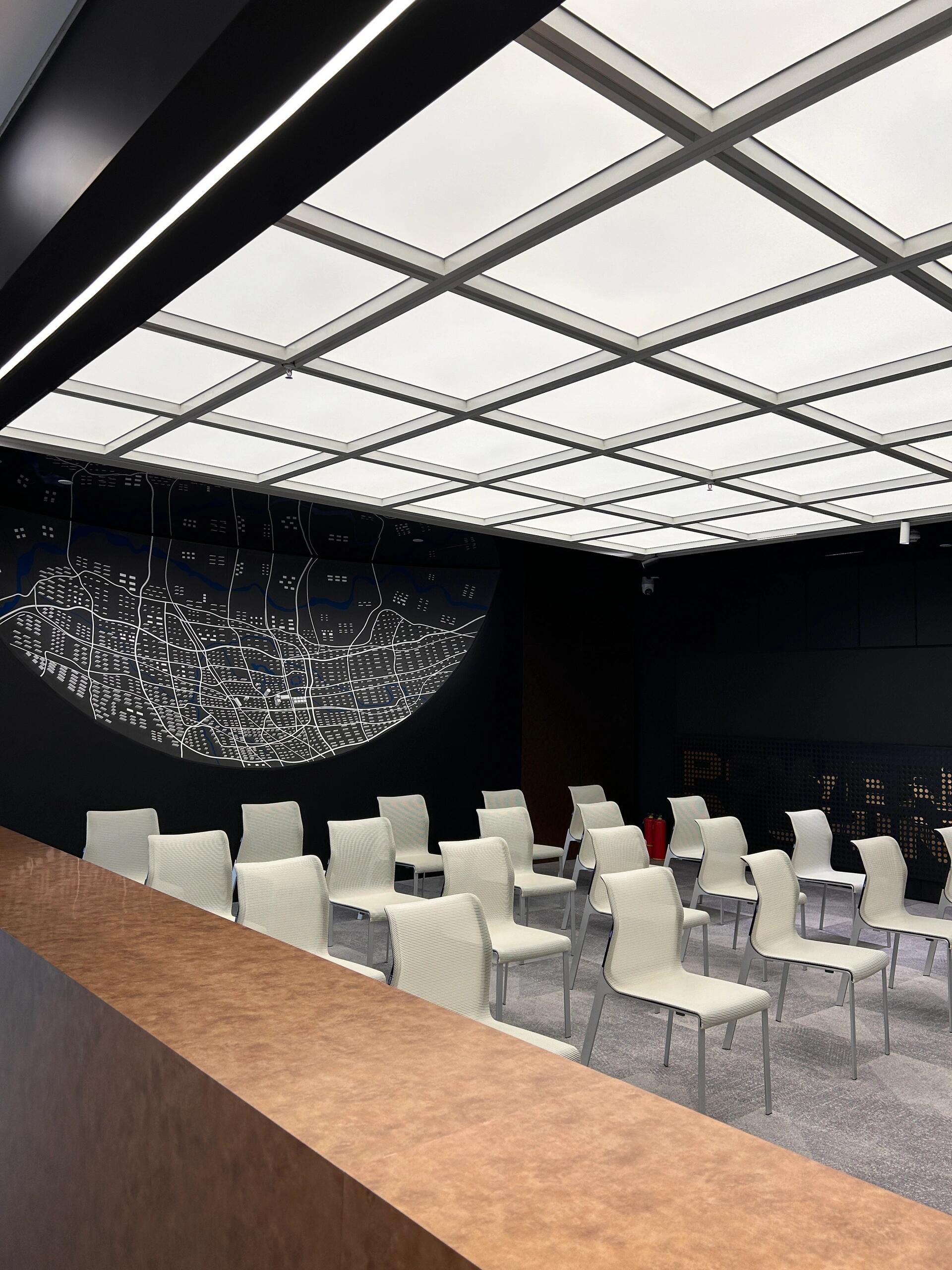 办公室的布局采用开放式的圆形设计,作为一个动态的连接点,巧妙地将不同功能区域连接在一起。无论是办公室、非正式协作空间,还是培训室,都被设计成能够无缝过渡的空间。开放的圆形布局打破了空间的隔阂,让整个办公室充满活力和流动性。通过使用磨砂玻璃和开放式隔墙,每个区域得以区分,但又不会造成封闭或压抑的感觉,保持了空间的通透感和舒适性。