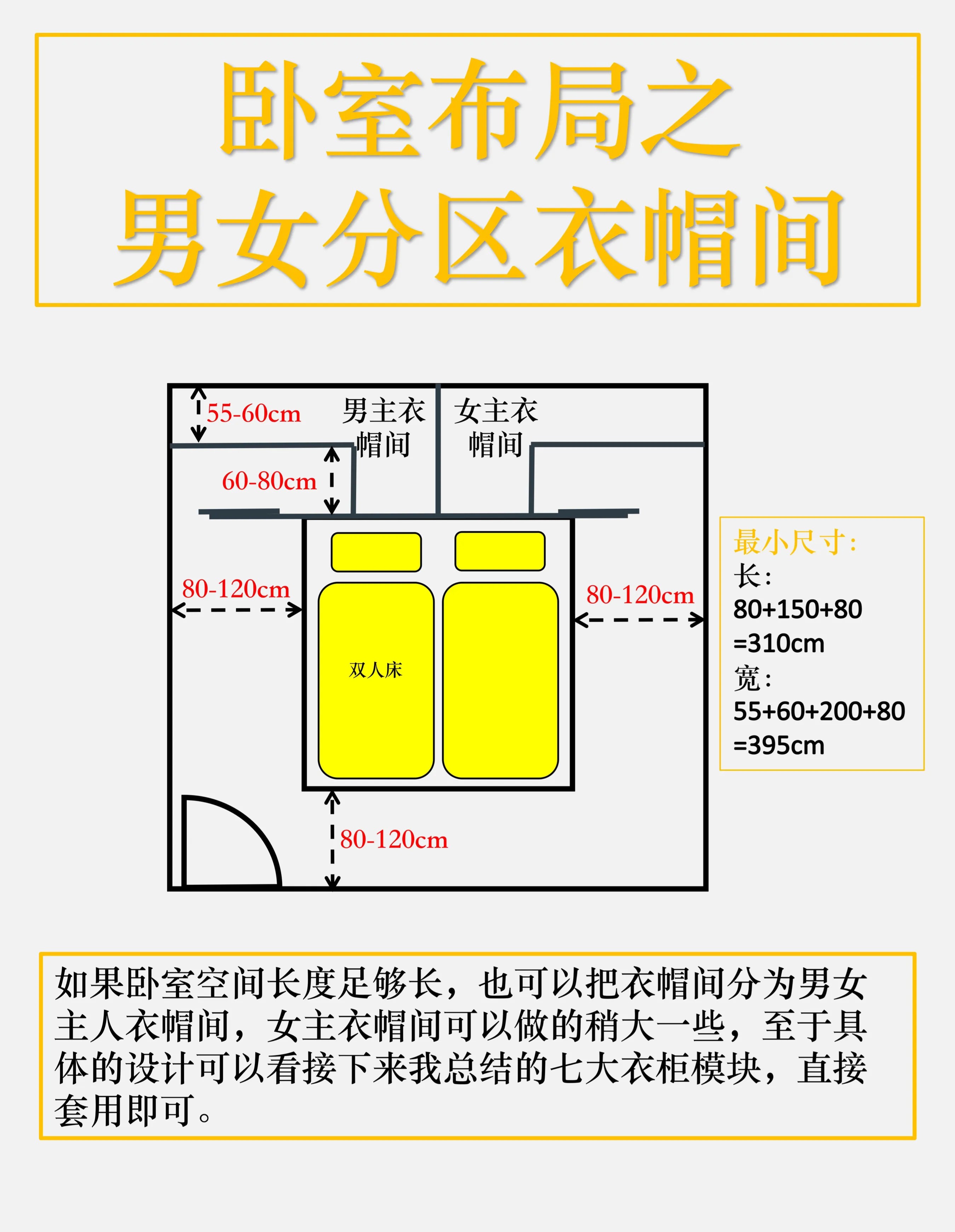 如果卧室空间长度足够长,也可以把衣帽间分为男女主人衣帽间,女主衣帽间可以做的稍大一些,至于具体的设计可以看接下来我总结的七大衣柜模块,直接套用即可。