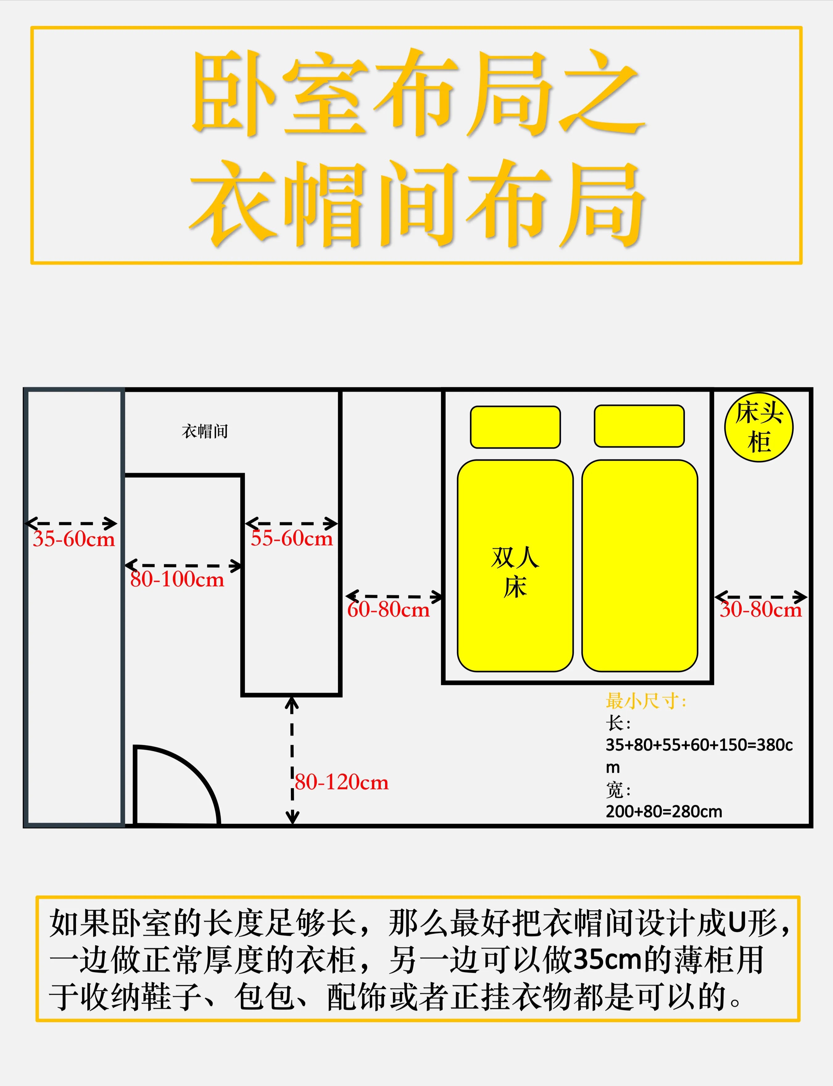 如果卧室的长度足够长,那么最好把衣帽间设计成U形,一边做正常厚度的衣柜,另一边可以做35cm的薄柜用于收纳鞋子、包包、配饰或者正挂衣物都是可以的。