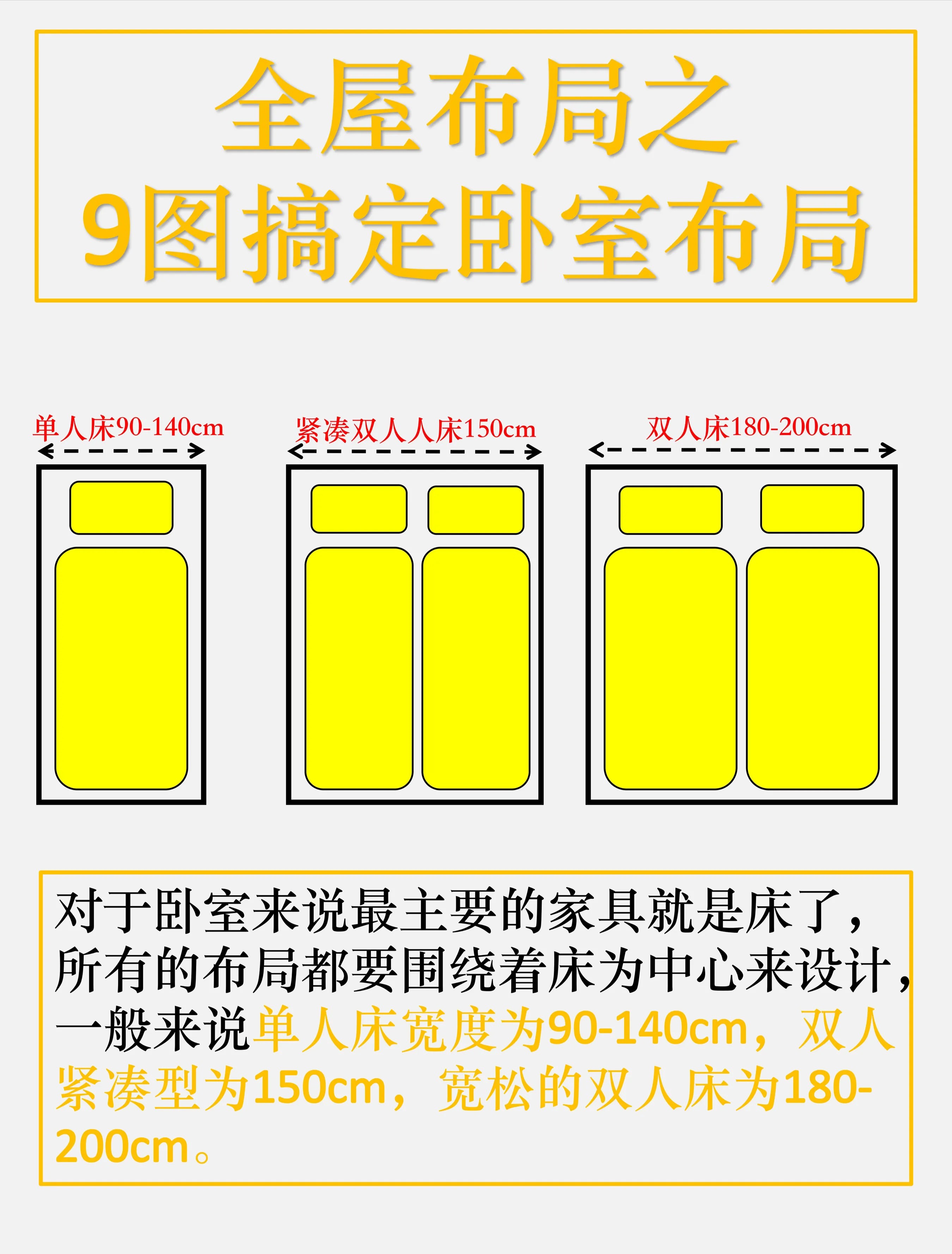 对于卧室来说最主要的家具就是床了,所有的布局都要围绕着床为中心来设计,一般来说单人床宽度为90-140cm,双人紧凑型为150cm,宽松的双人床为180-200cm。