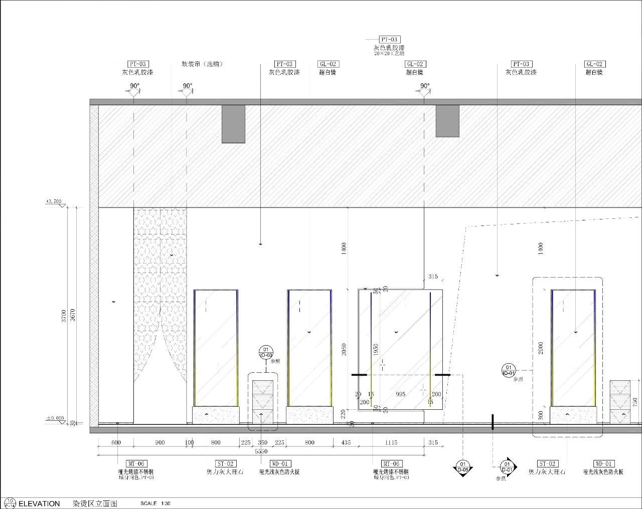 店铺现有沿室内商业内街的“沿街面”,从外部形象上采用了极简的处理手法——通过设置包含入口的四个矩形窗洞,形成了有序的对外表情。材质力求简洁干净,大量使用面砖、岩板和不锈钢,结合大面积超白玻璃材质,并通过黄色烤漆色彩进行调和。形成spa空间的专业、洁净调性。