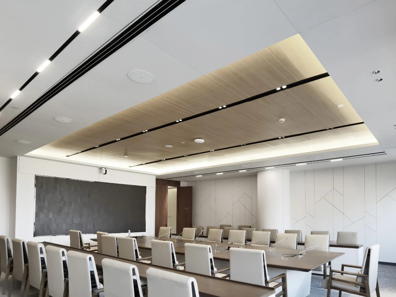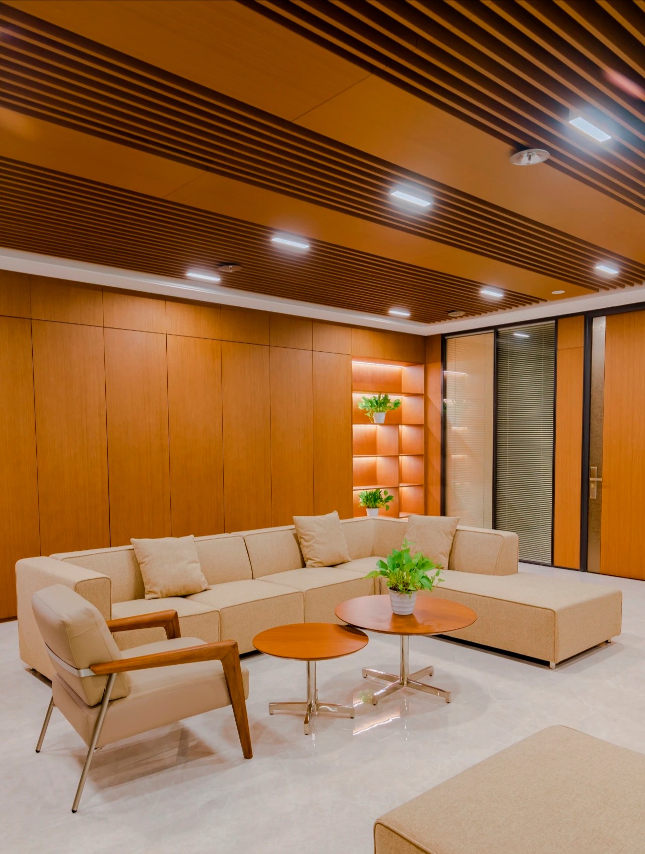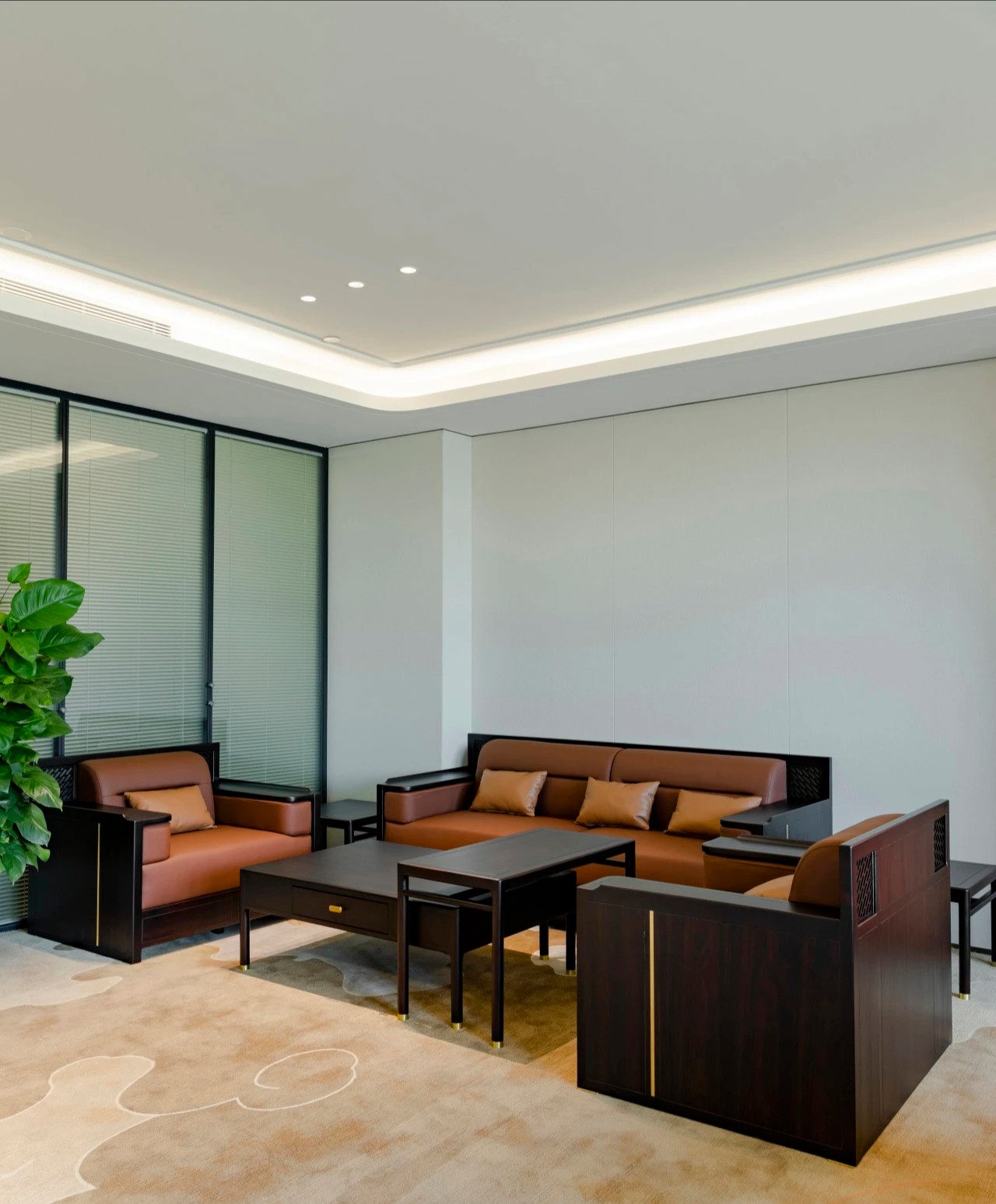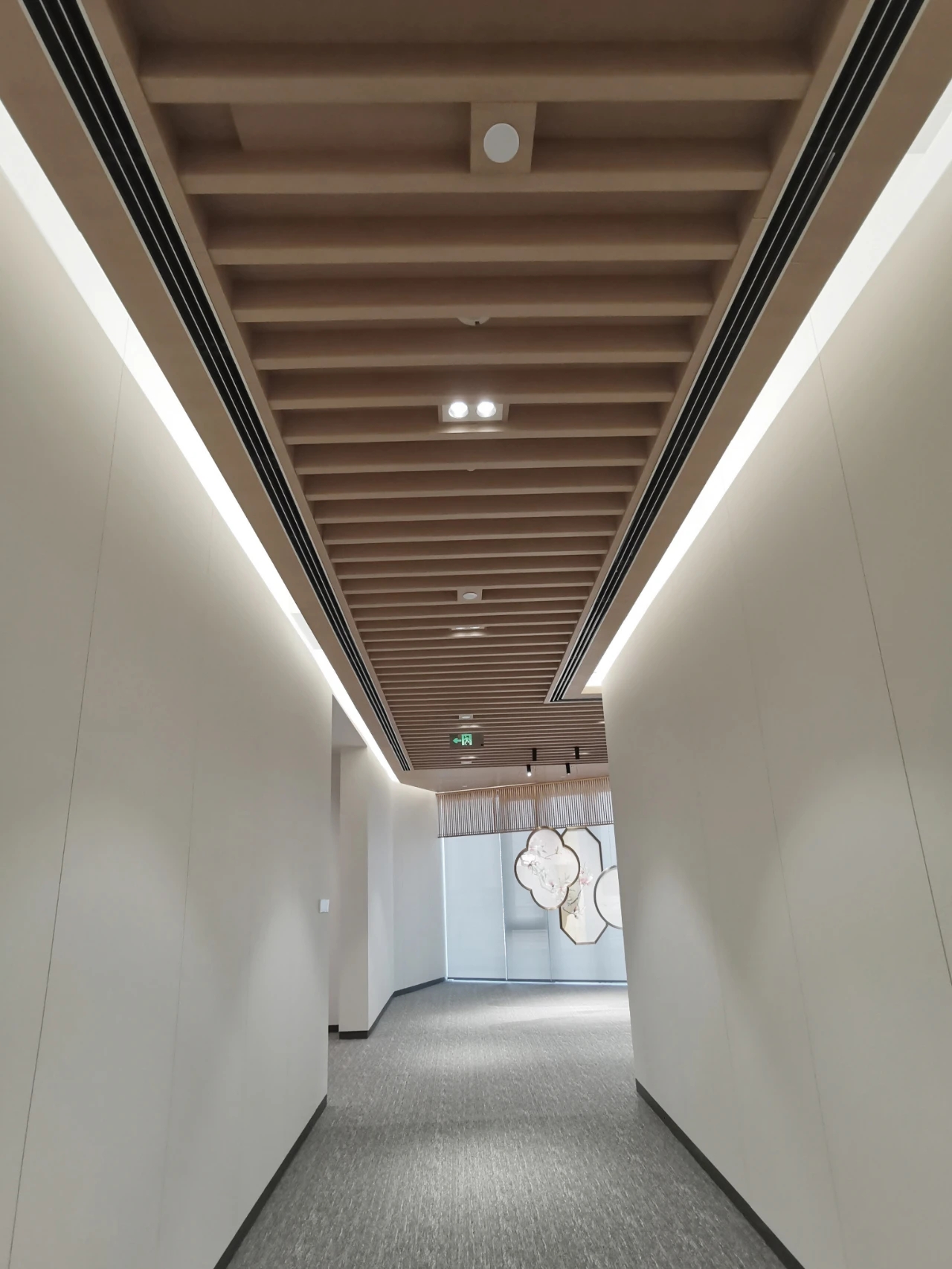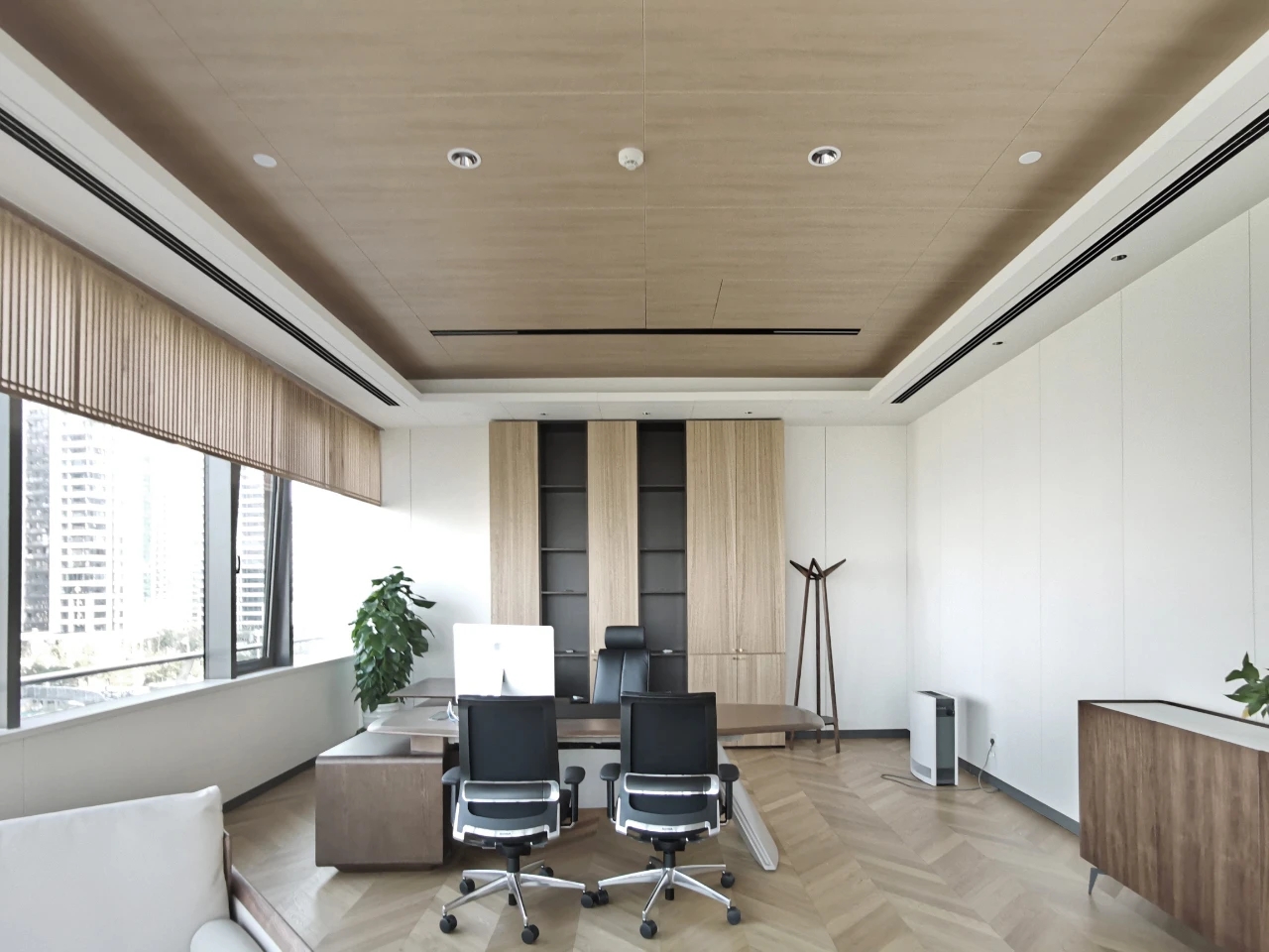 项目全部采用了创建空调的防结露条形风口。整体空间装饰以实木为主元素,打造自然、舒适,又不失传统质感的办公空间。穿过宽敞的回廊通道,便是总经理办公室,明亮有温度的木饰风格,空间在两侧风口的延伸之下显得格外宽敞。