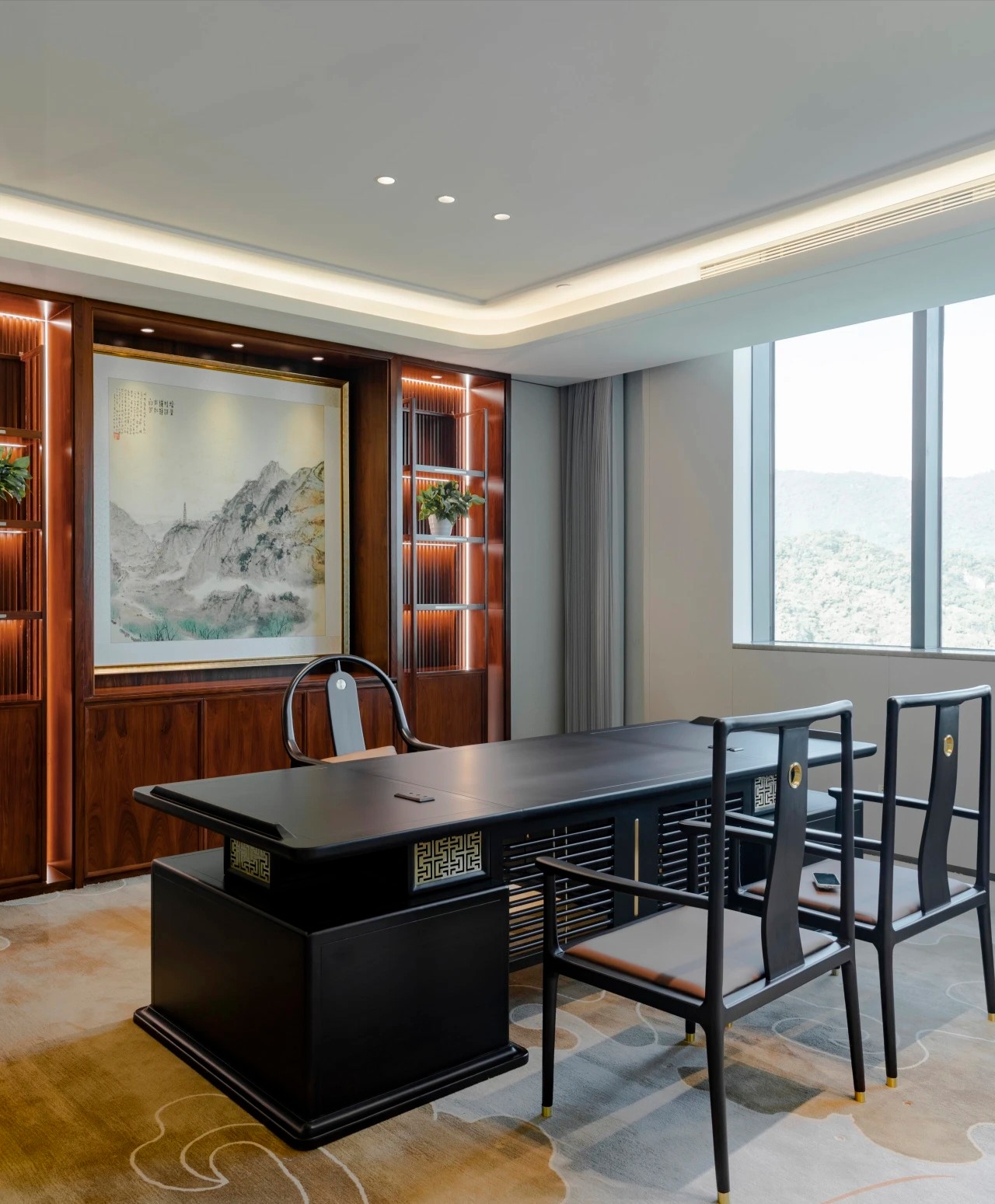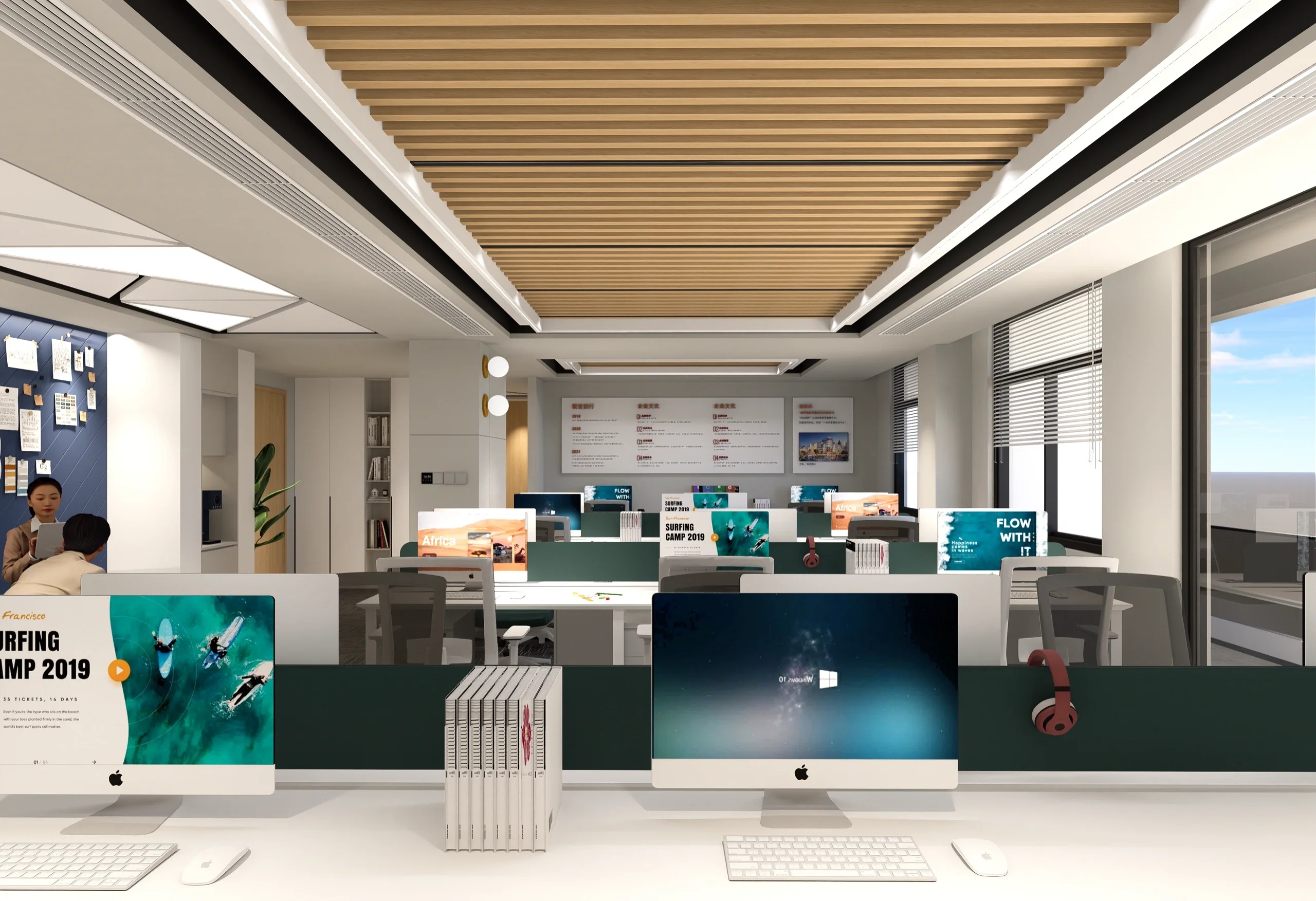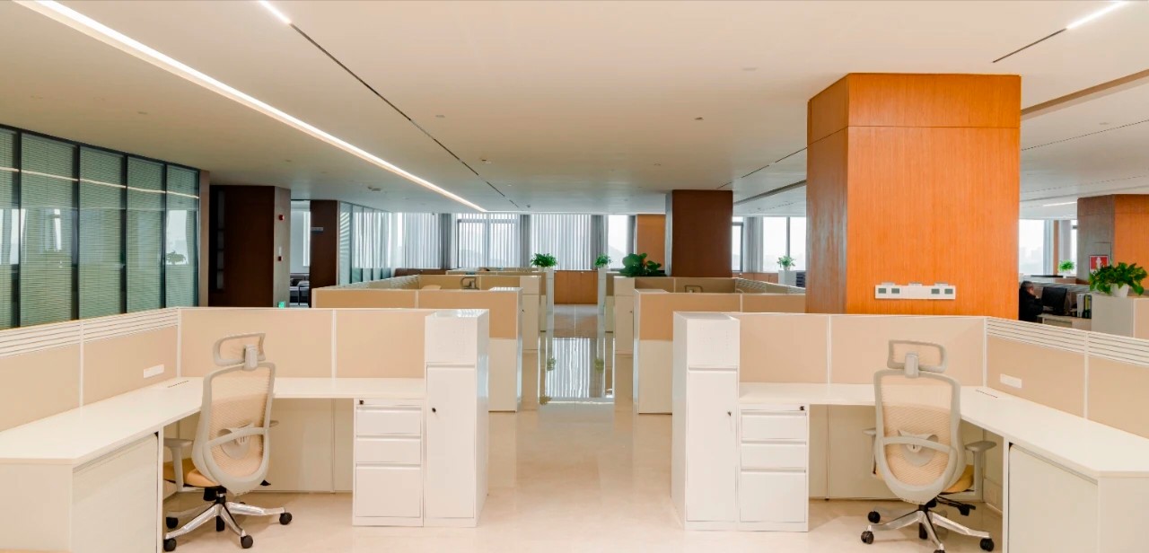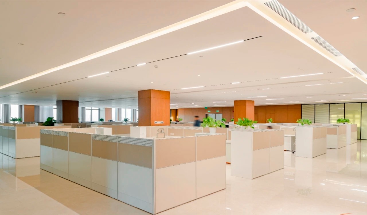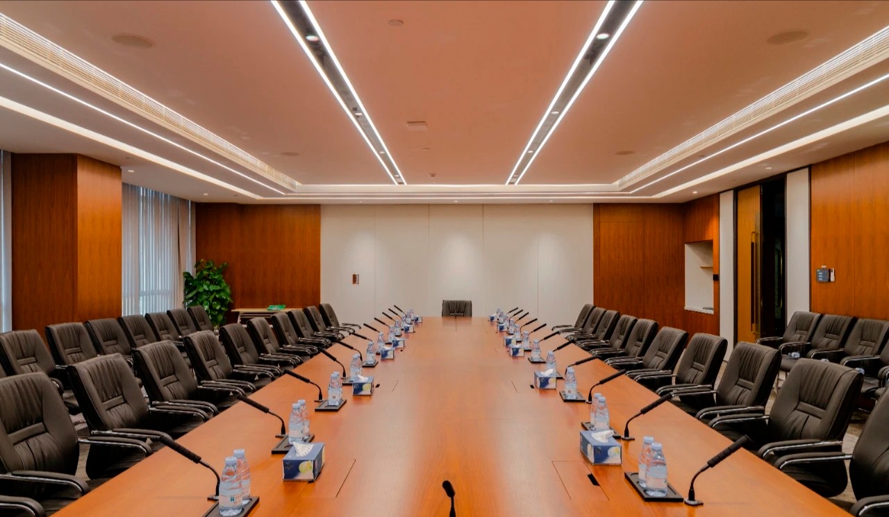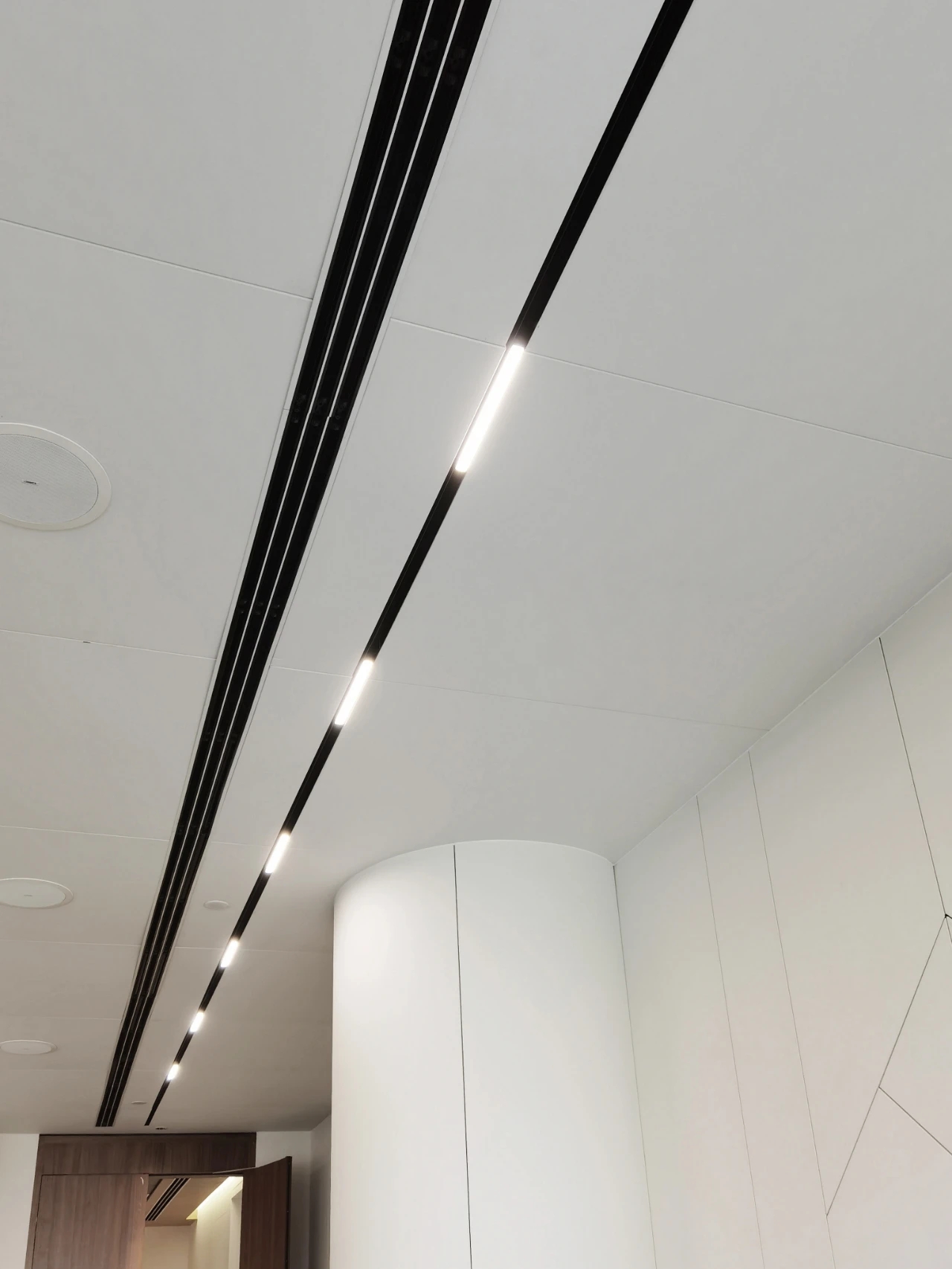 项目全部采用了创建空调的防结露条形风口。整体空间装饰以实木为主元素,打造自然、舒适,又不失传统质感的办公空间。穿过宽敞的回廊通道,便是总经理办公室,明亮有温度的木饰风格,空间在两侧风口的延伸之下显得格外宽敞。