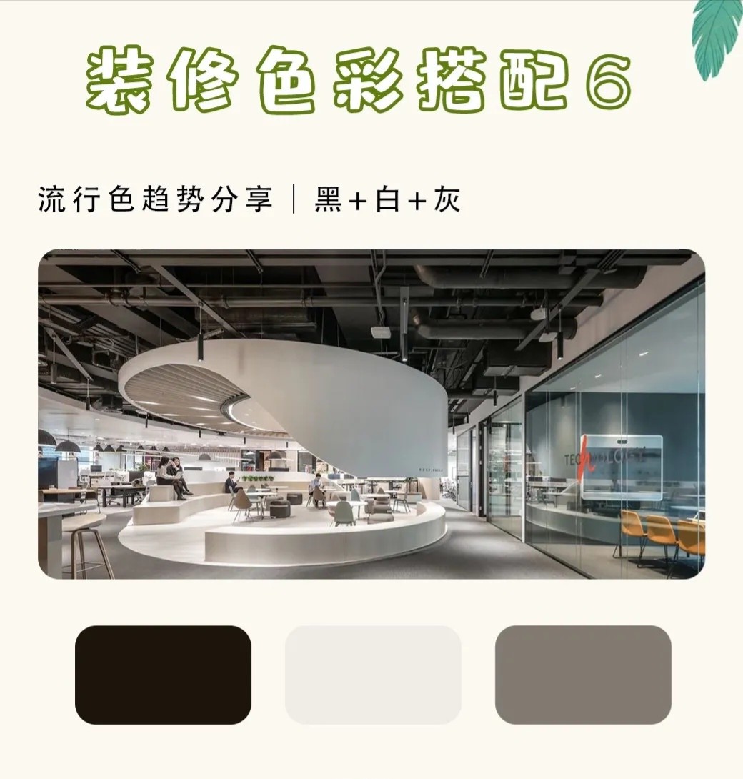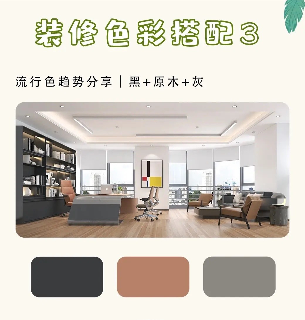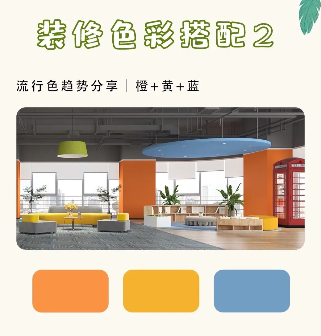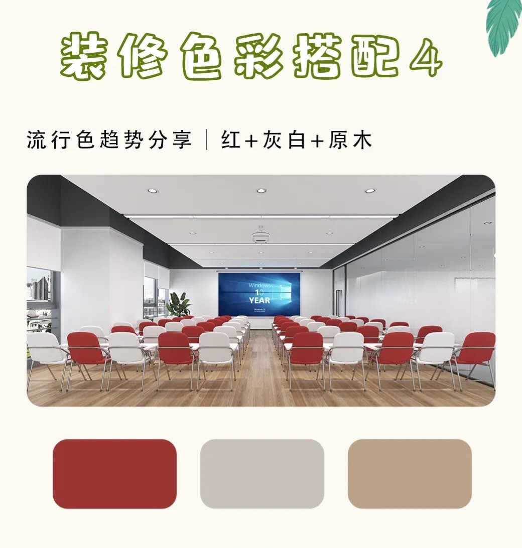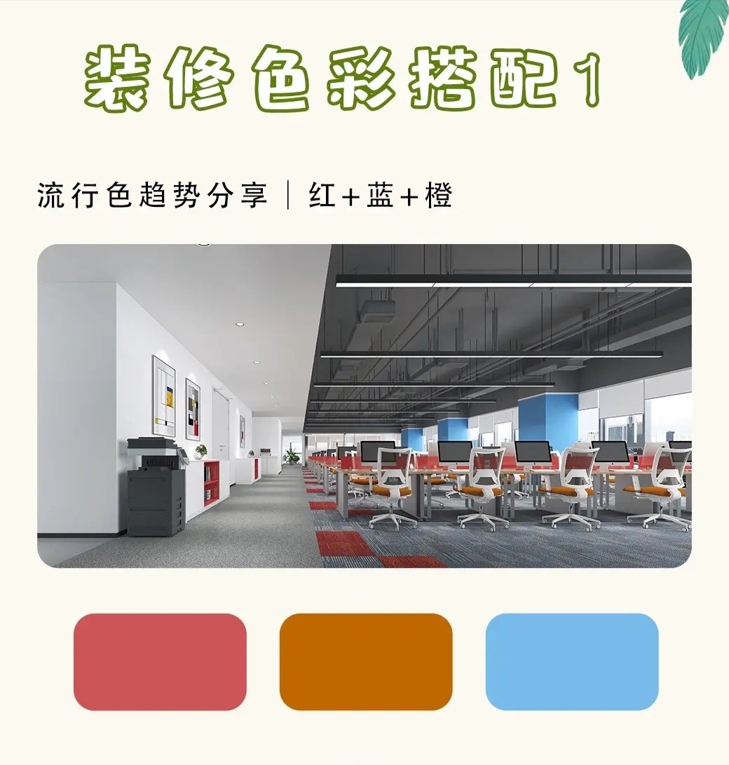 红蓝橙 | 在活力与激情中展现沉稳与专业橙黄蓝 | 空间氛围活泼又不失质感黑木灰 | 营造质朴自然感的办公空间红白木 | 红色点缀灰色调凸显时尚优雅蓝银黑 | 科技感中增添神秘而高雅气息黑白灰 | 经典配色带有浑然天成的高级感