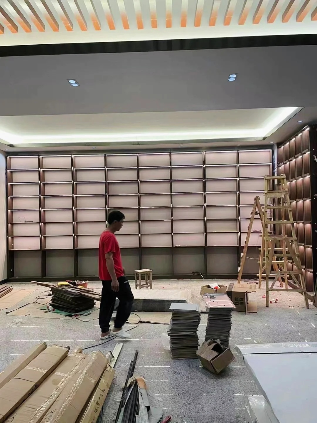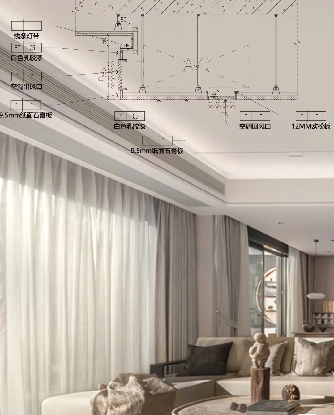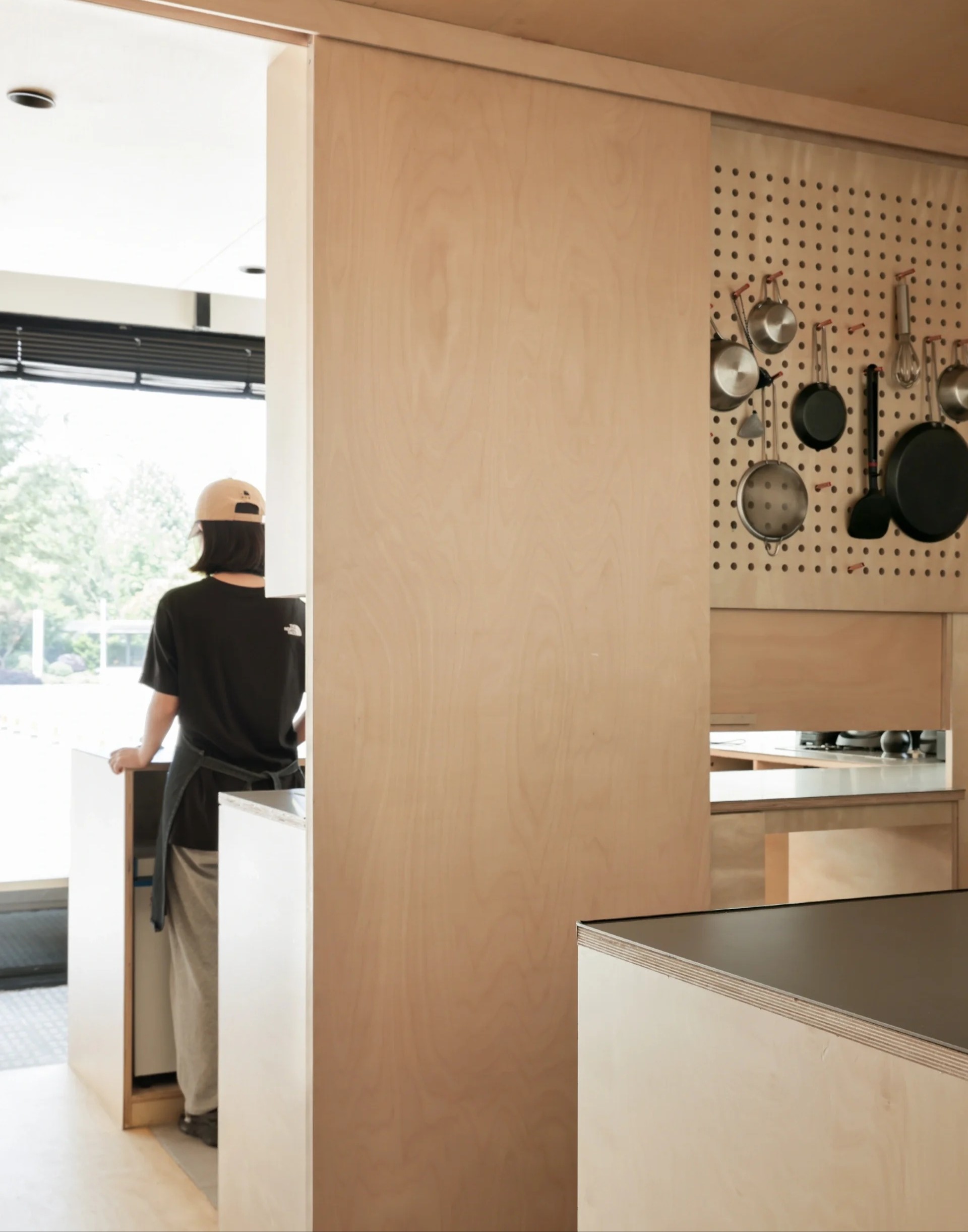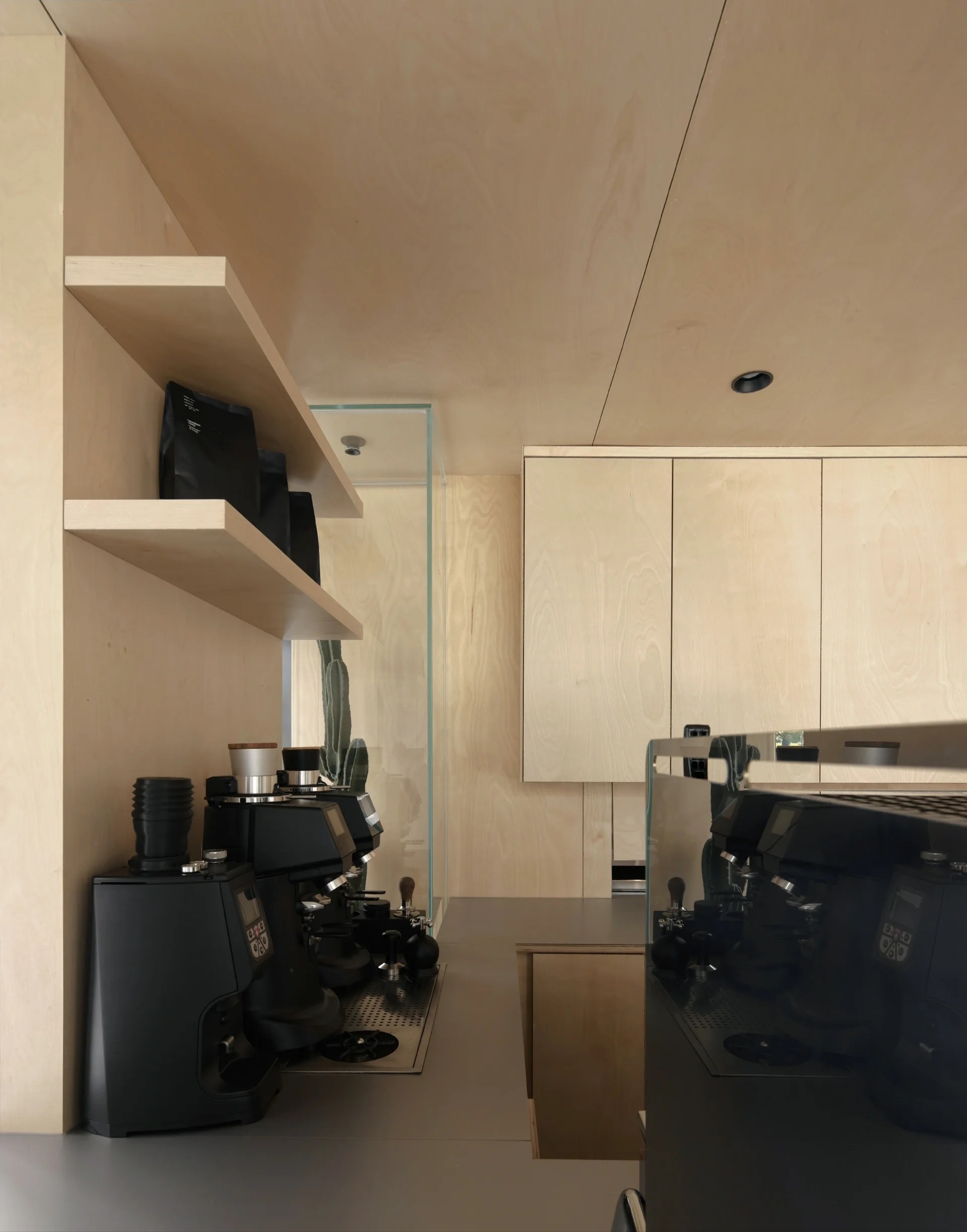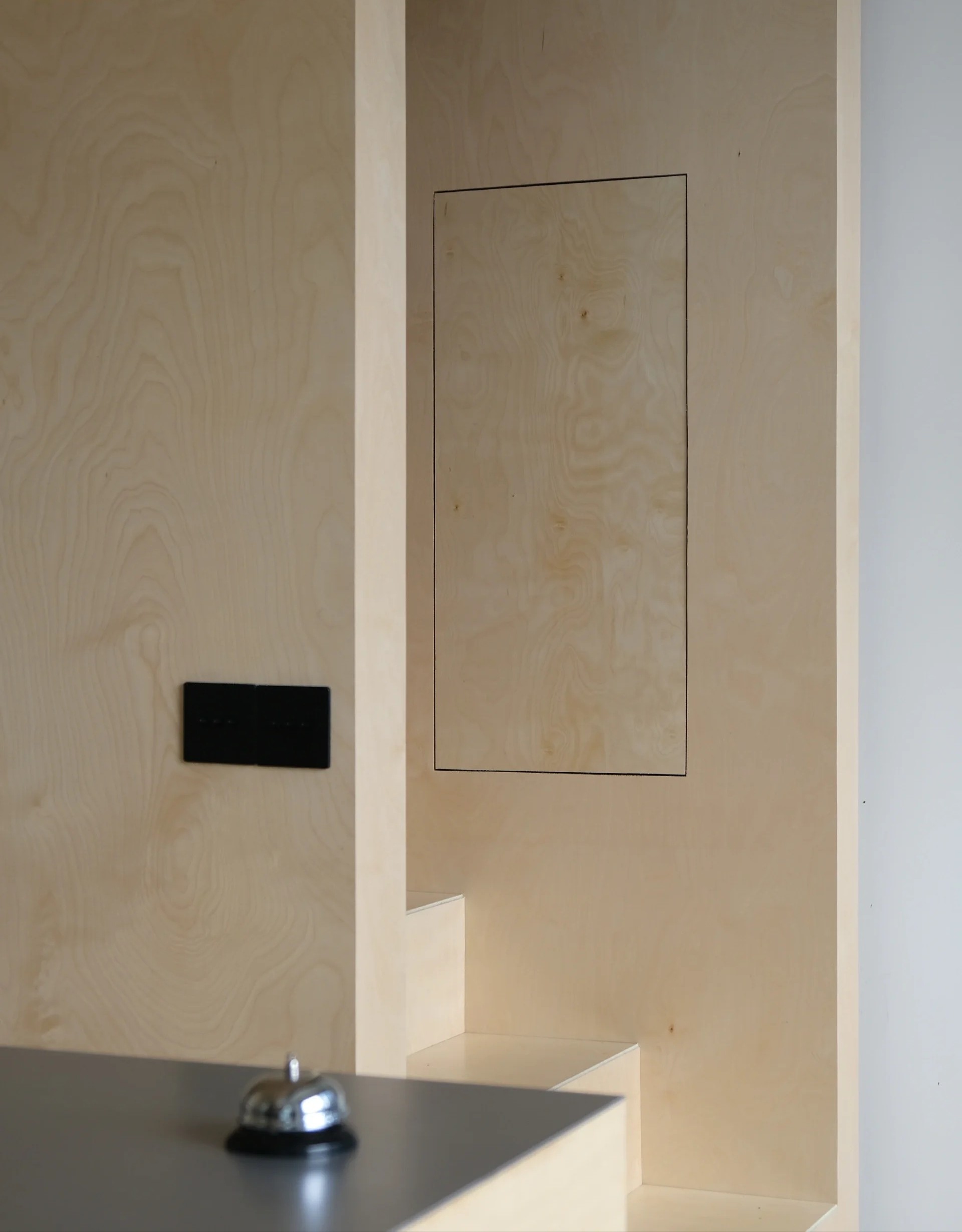 在空间中用到了大面积的桦木板材料,以实景为参考分享一下它的工艺细节及收口方式·主要用到三种厚度的桦木板:18mm(地面、橱柜、楼梯)3mm(顶面)12mm(部分墙面)·收口方式:45度密拼—这种收口方式相对美观,阳角看不到缝,板材在工厂提前做了UV保护层以及“45°”切角加工,由师傅在现场切割密拼