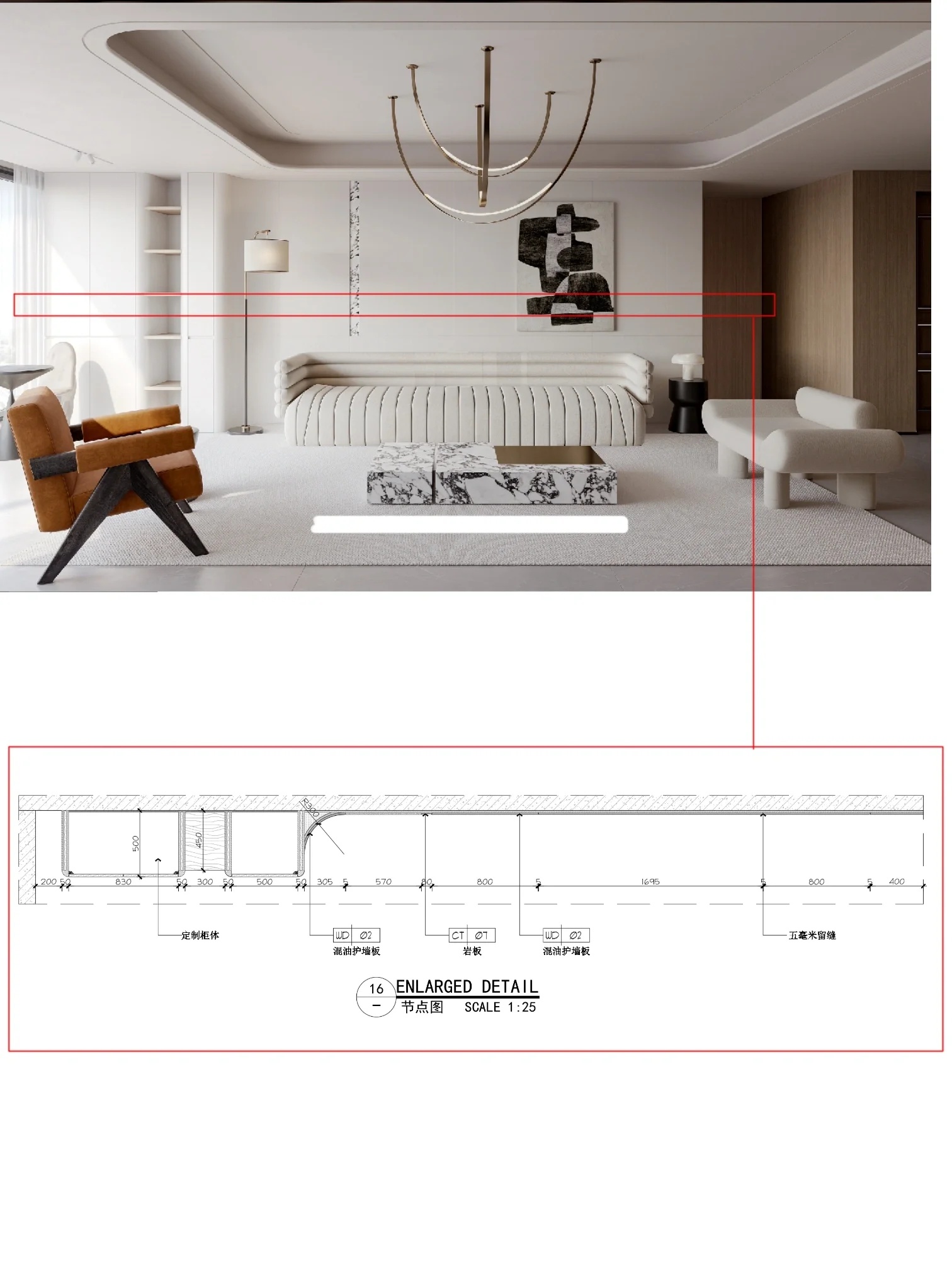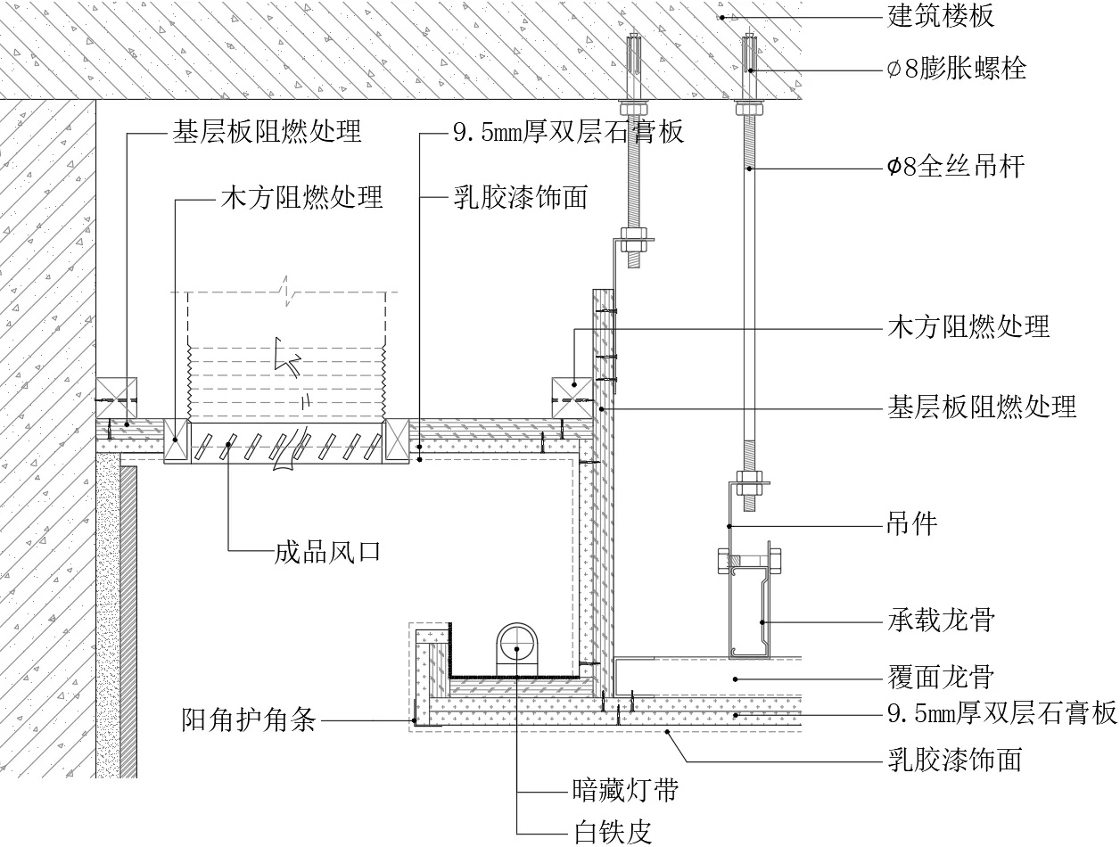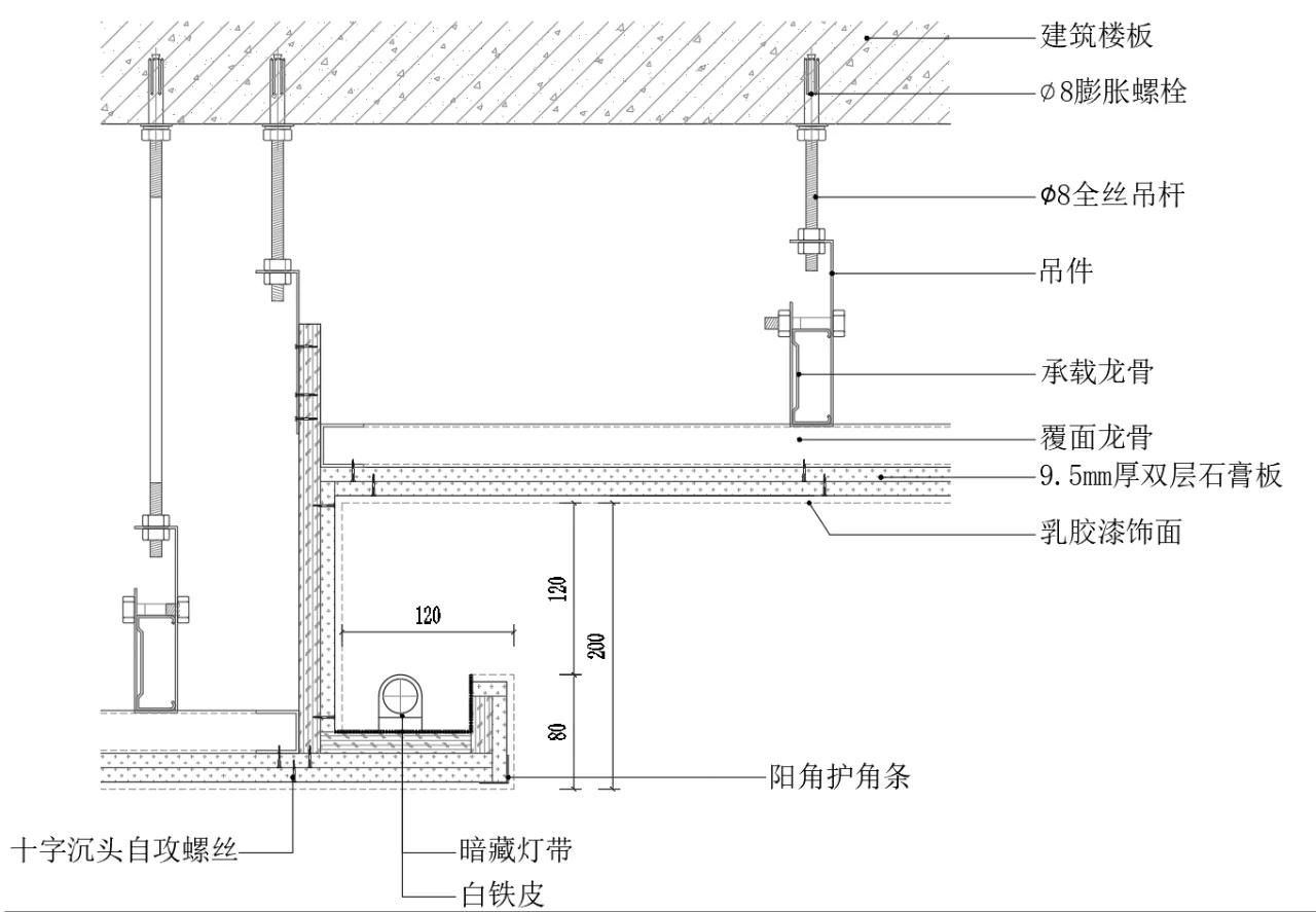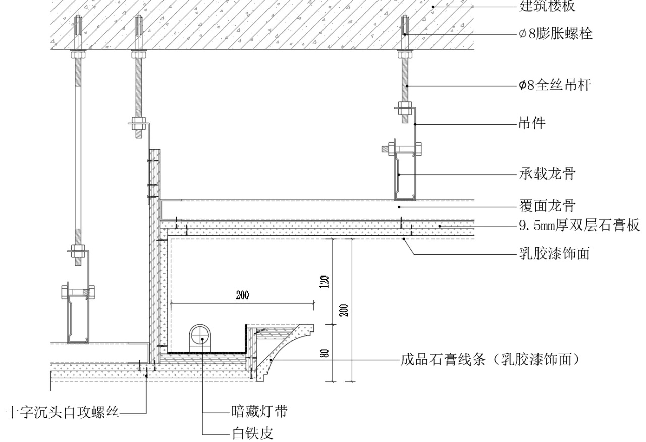 室内常见五种吊顶灯带施工图节点大样分享图一:(常规灯槽造型节点图)图二:(带石膏线灯槽造型节点图)图三:(弧形石膏线灯槽造型节点图)图四:(靠墙风口带灯槽造型节点图)图五:(灯槽带风口造型节点图)