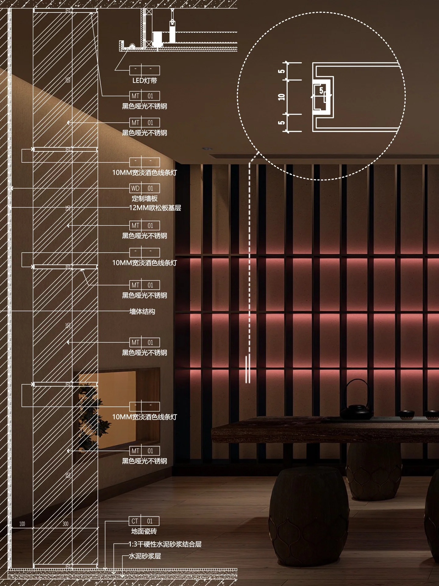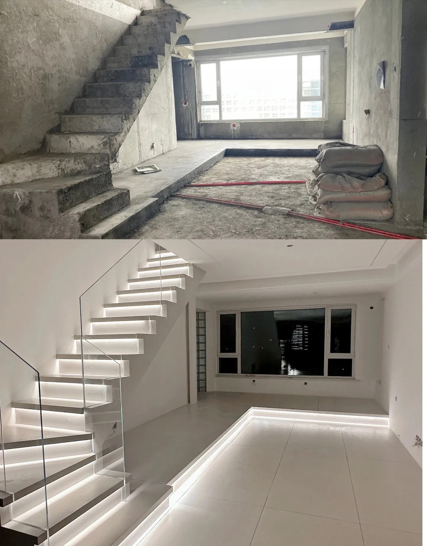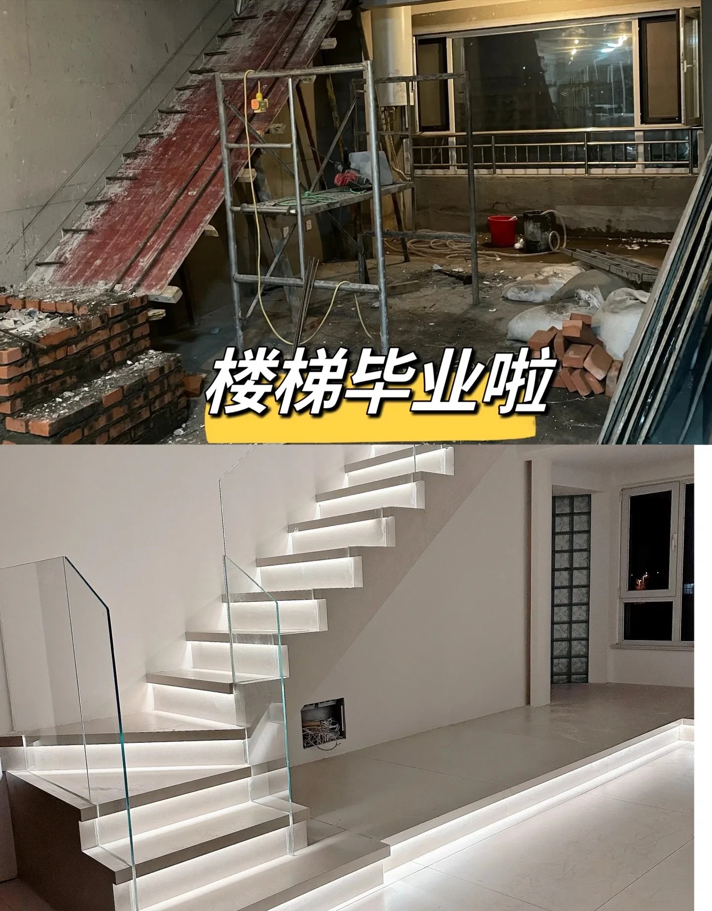 量尺寸,画图纸,两位师傅研究整整了一下午,订下尺寸10天左右就到货了。岩板可不是现场可以加工的,是在工厂里用水刀工艺切割,这样不易崩瓷。到货后师傅用结构胶icon进行铺贴,看似简单方便,实则两位师傅干了两三天。岩板铺贴完后又把灯带给粘上了,当初量尺寸的时候每个踏步预留的灯带凹槽是lcmx1cm的,灯带是0.8mm,需要嵌入在内
