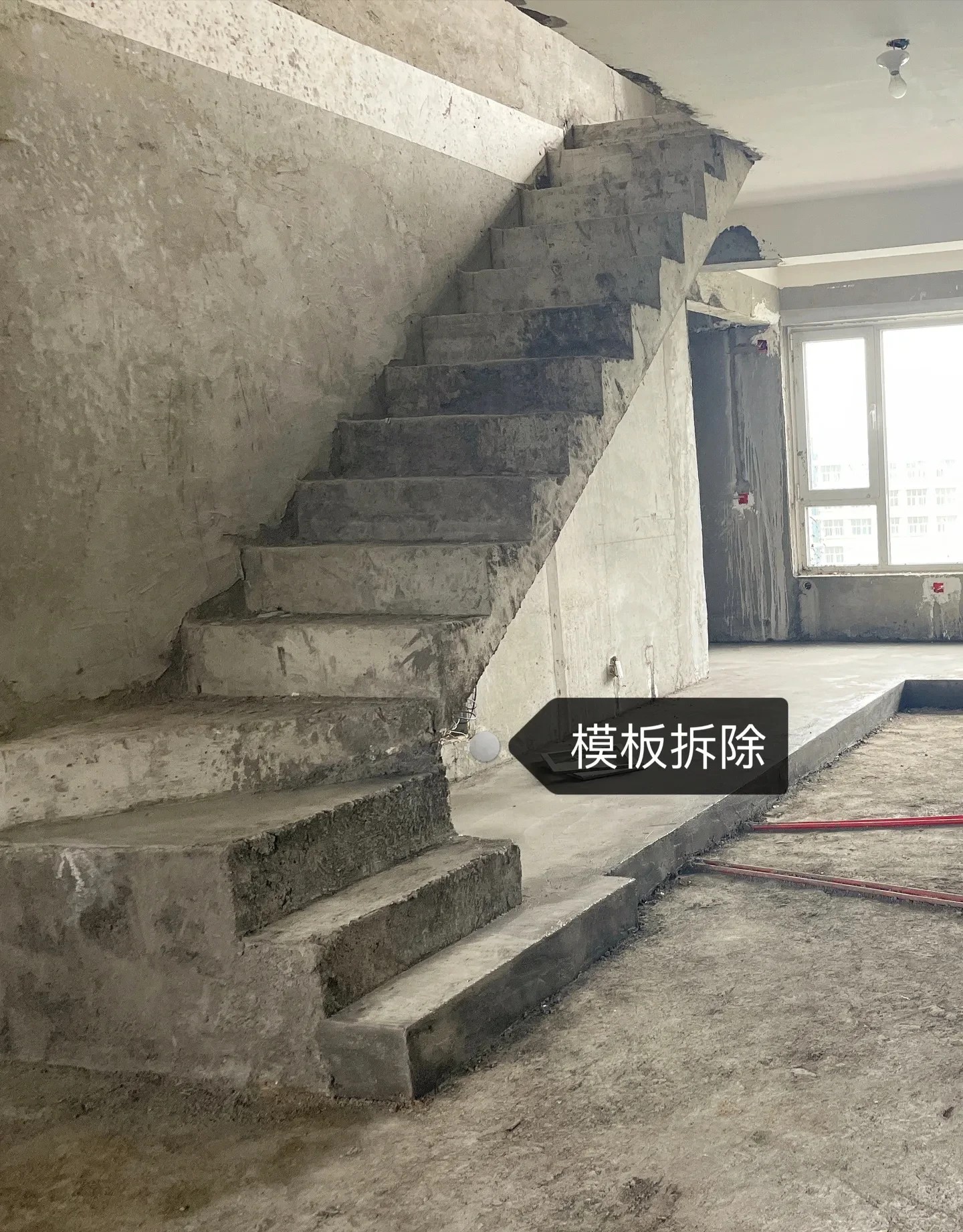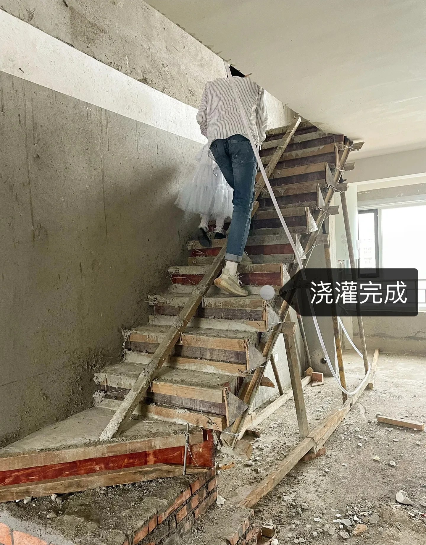 先用板子固定楼梯位置,钢筋均匀的铺在板架上,然后钢筋绑扎,打好模板,把混泥土浇灌进模。两三天就可以走啦,这个过程期间要勤浇水!