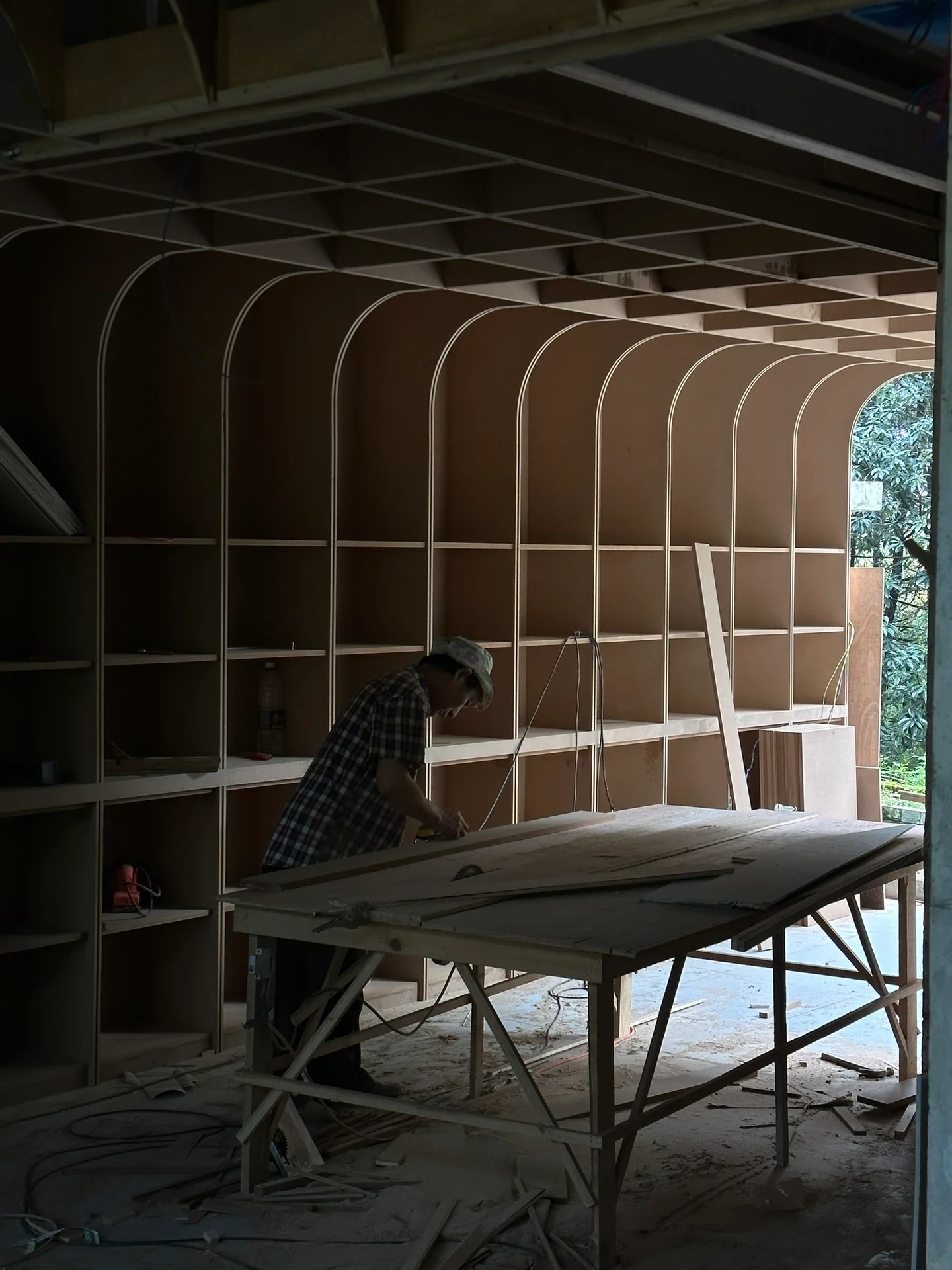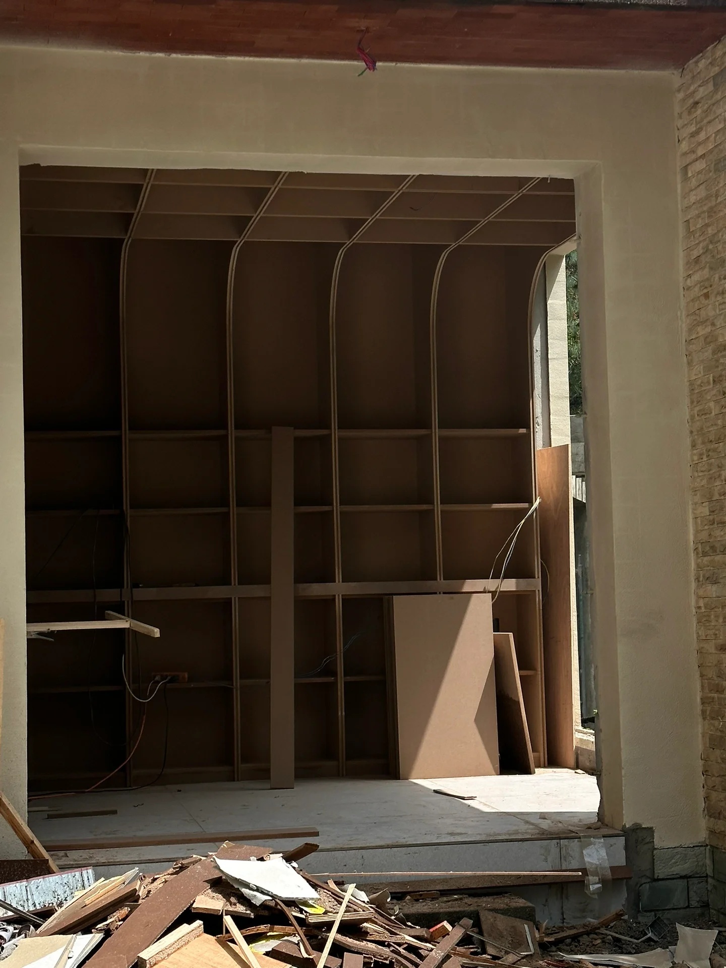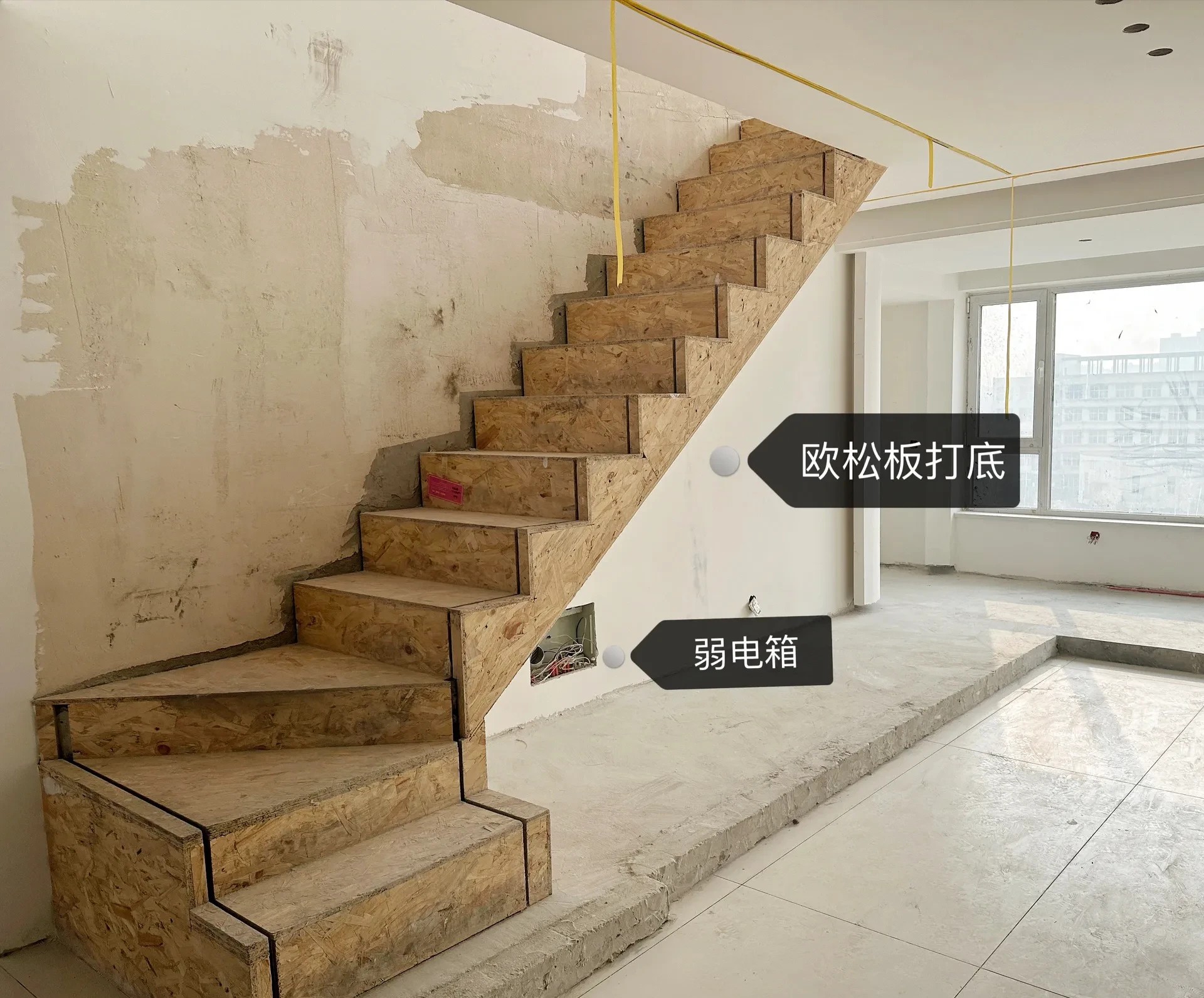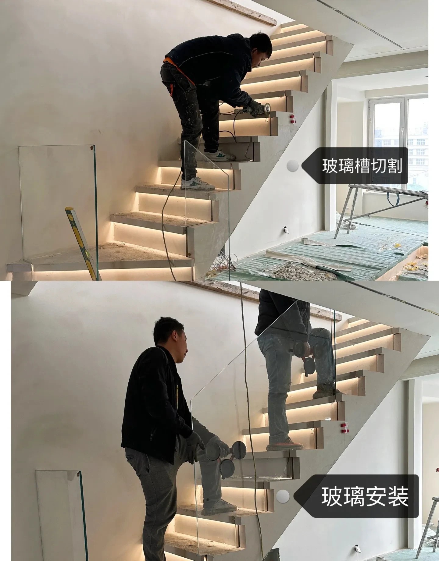 大家可能会发现家里装修都会用欧松板icon打底,楼梯也不例外,因为欧松板易加工,防潮性好,推钉力强,易贴合,而且欧松板能做到精找平,在这个阶段就要确定扶手位置,预留好玻璃槽的厚度,这套是1cm厚的超白玻,一般要预留2cm