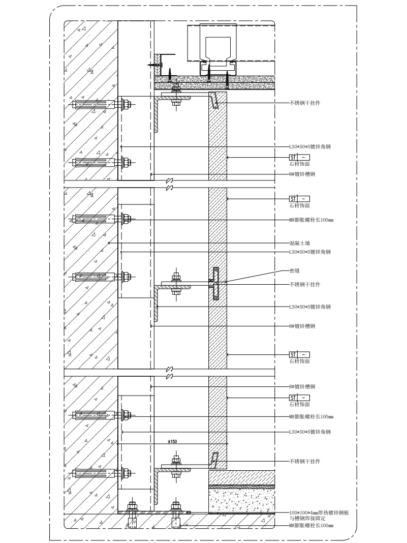 干挂石材节点|||干挂石材是一种常见的建筑外墙装饰材料,其施工工艺采用耐腐蚀的螺栓等柔性连接件,将石材直接挂在建筑结构的外表面,形成墙面。