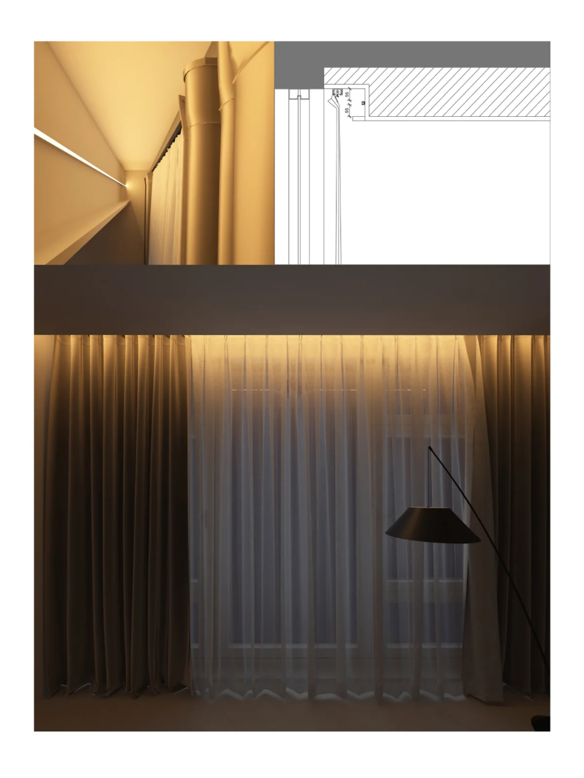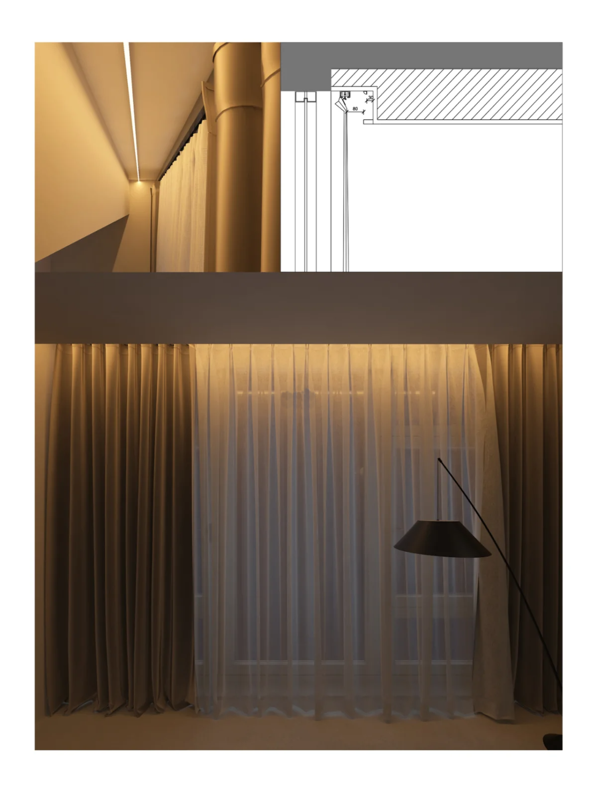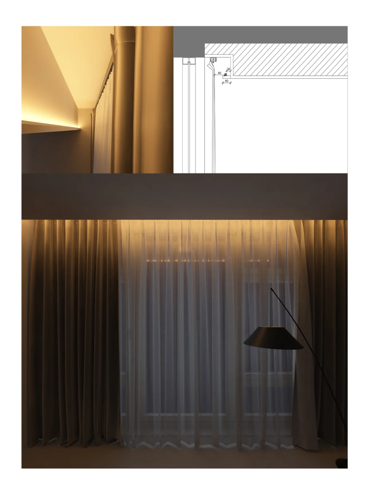 ,完整呈现窗帘轮廓。但要注意灯带离窗帘至少预留80mm。