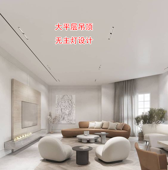 无主灯大平天花吊顶无主灯的大平天花吊顶是指没有安装主灯,天花没有高低跌级的吊顶。效果:平整的天花令视野开阔,让人感到非常舒适大气。通用施工结构:轻钢龙骨结构+石膏板+乳胶漆。