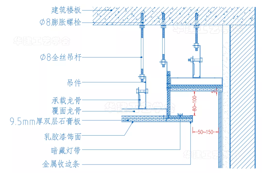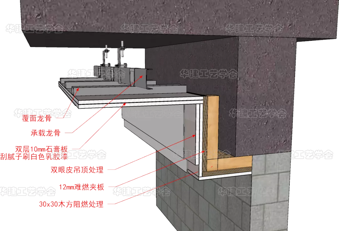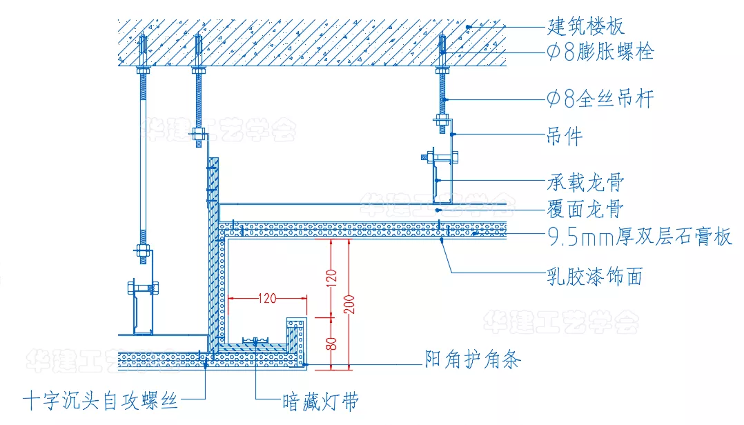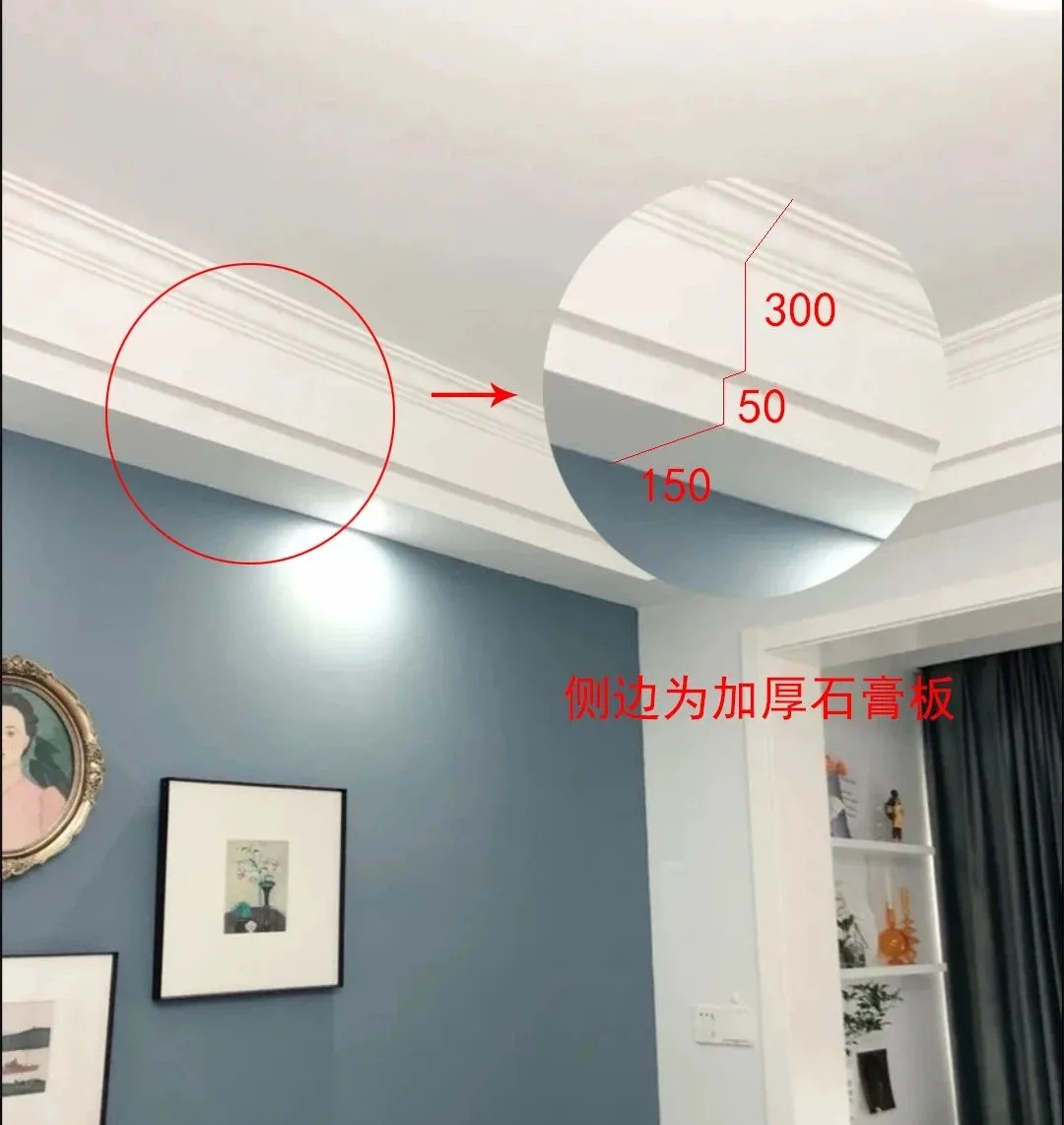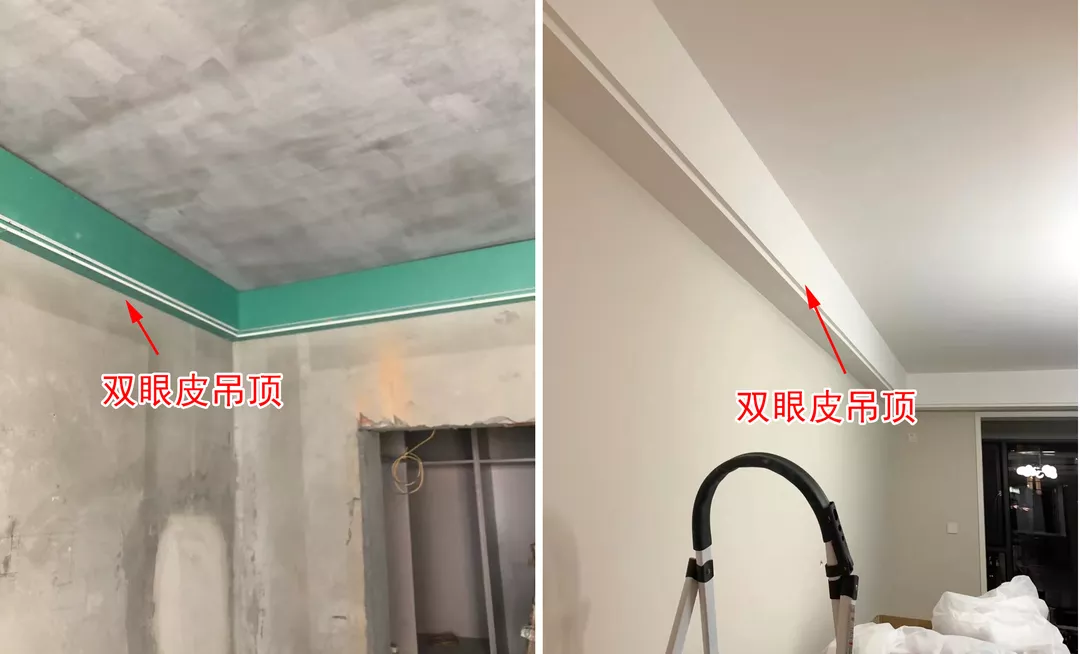 双眼皮天花吊顶双眼皮吊顶称为“叠级”分层吊顶、分层天花,是指在墙边或单边出现的装饰吊顶,为了不单调,在阳角在进行小角度分级装饰。效果:空间没有压迫感,又可将各管道进行遮挡装饰。简单而不单调的装饰空间。通用施工结构:轻钢龙骨结构+难燃夹板+石膏板+乳胶漆。