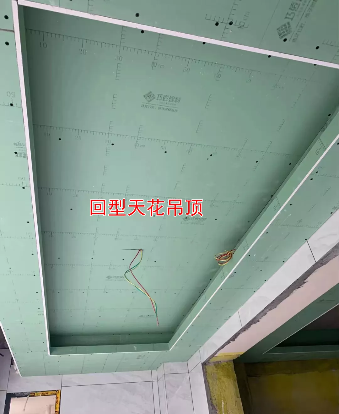 回型天花吊顶回型天花吊顶是指四边低中间高,四周可用作藏管线,安装筒灯、射灯,回型天花吊顶最为经典、是使用最多吊顶之一。效果:四周线性灯向上出光,回型光效大气高级。