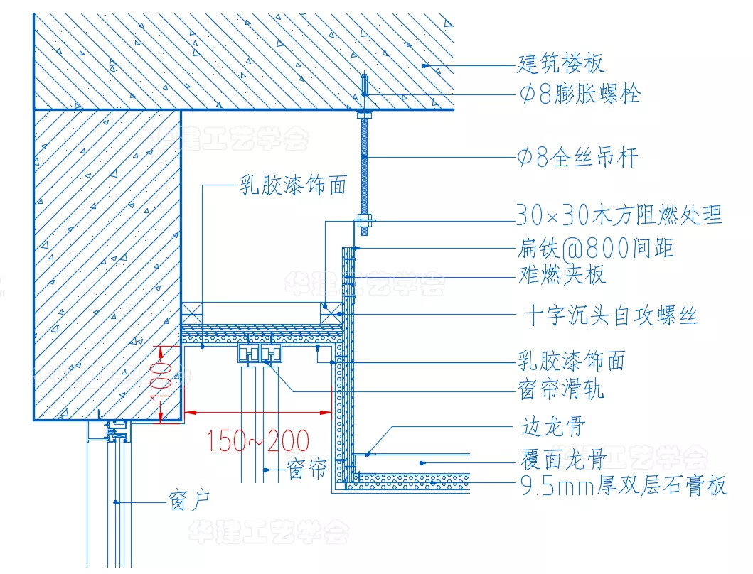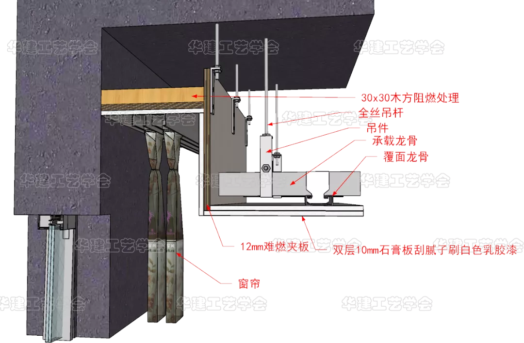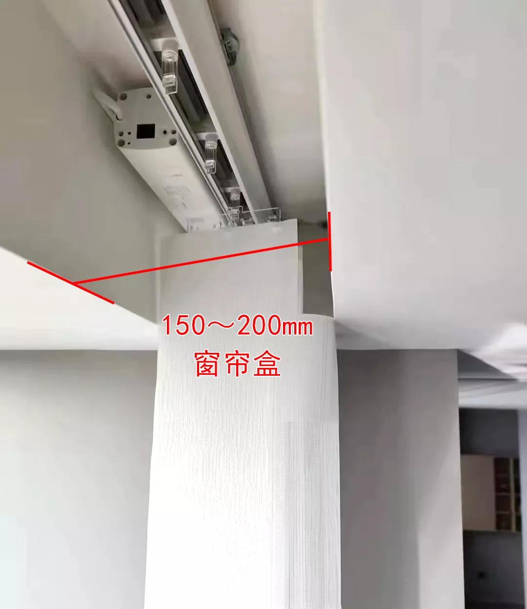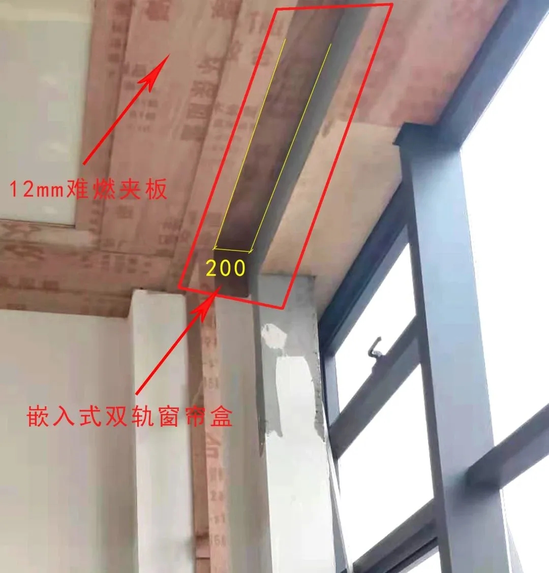 窗帘盒窗帘盒是指在靠近窗户的天花上向内的凹槽,用来安装窗帘轨道。效果:窗帘盒可隐藏窗帘头,使空间达到美观的效果。通用施工结构:轻钢龙骨结构+难燃夹板+木方+石膏板+乳胶漆。注意:双轨窗帘的凹槽宽度宜为150~200mm,高度宜为100mm,否则会影响安装效果。