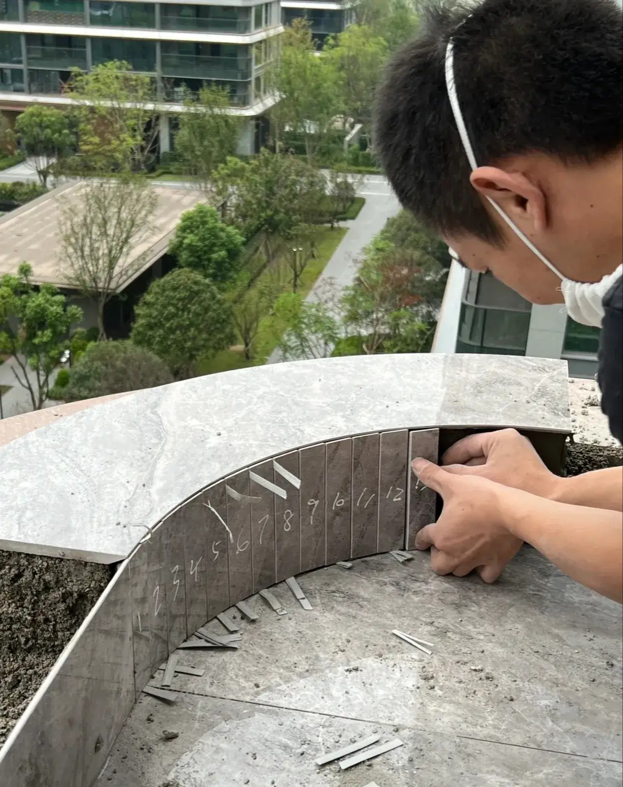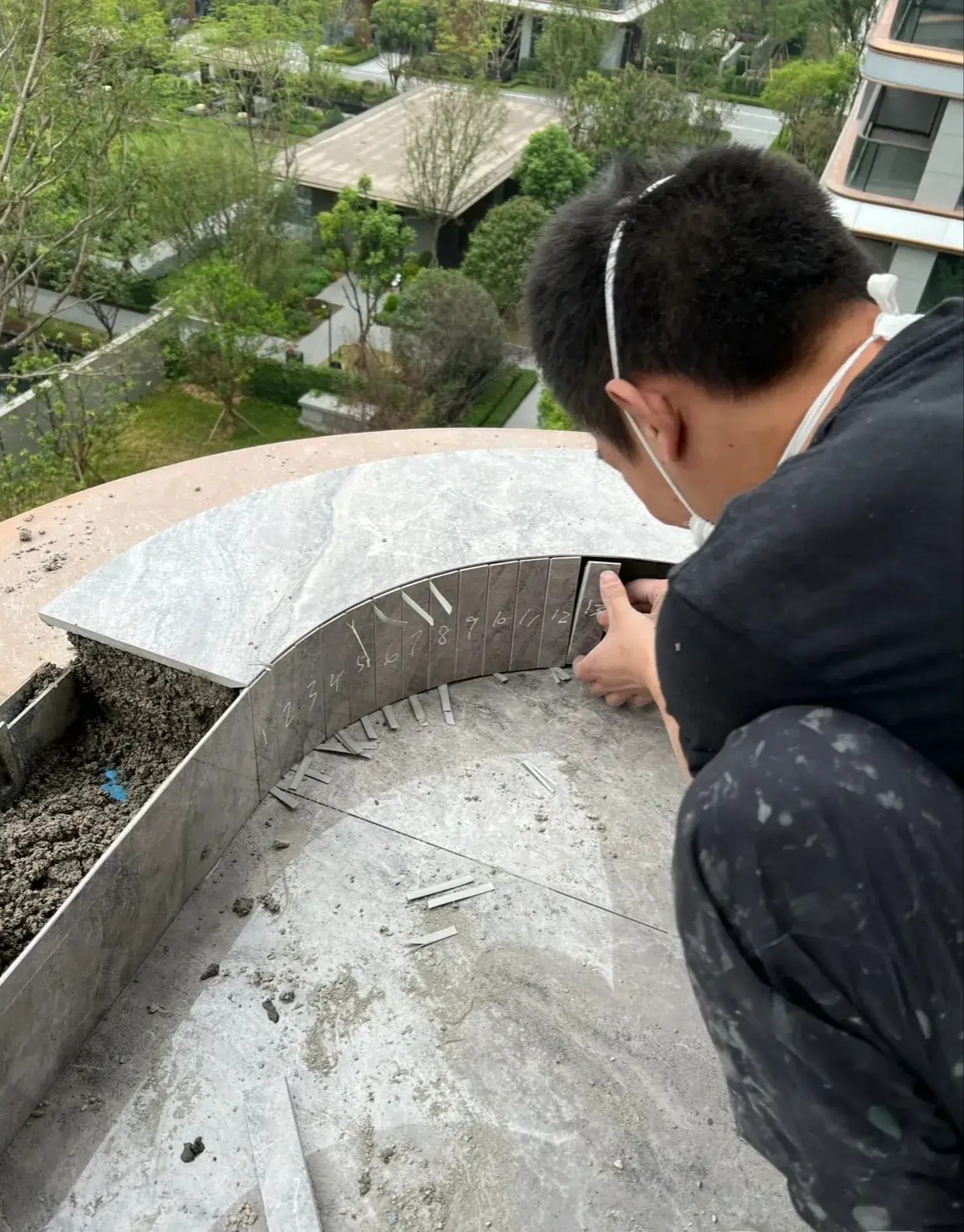 弧形工艺!放线~切割~拼贴弧形的造型工艺,耗时多,人工高,而且还需要细致,一般瓦工人还不愿意接这样的工作。同样的工作量,直角拼接早完成了。所以装修报价高,工艺也是重要的一环。