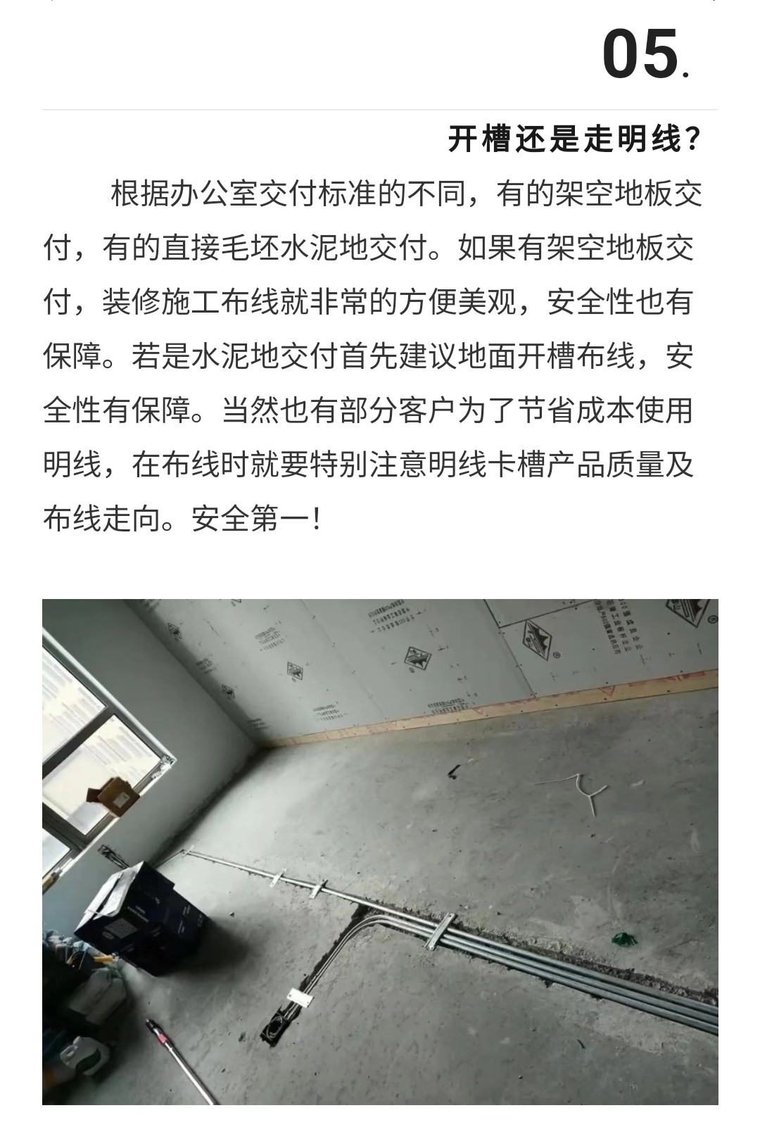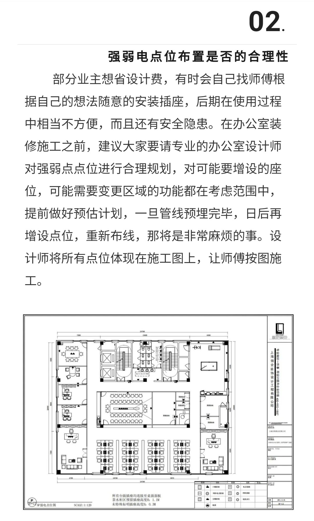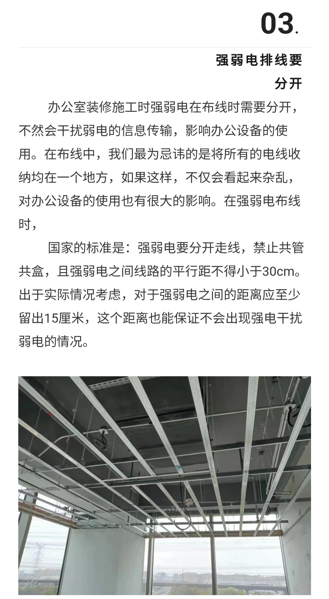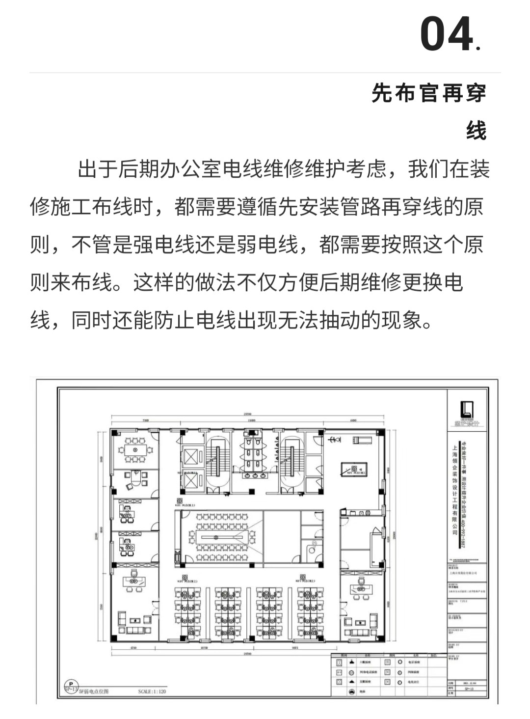 在办公室装修设计之中,安全性是非常需要重视的,尤其是强弱电布线这一部分,通常我们把电话线、网络线、视频线及音响线等称之为弱电线,其他则称为强电线),前期办公室布线设计好对后期的施工提供了坚韧的基础,也会影响着办公室的整个装修的质量和美观性的效果。办公室设计装修的布线也是有很多的设计施工技巧及注意事项的,办公室装修设计时强弱电布线有哪些施工技巧?注意事项什么?