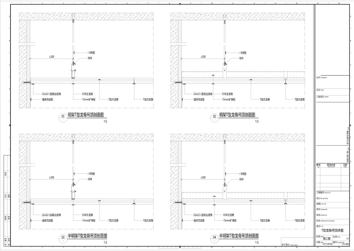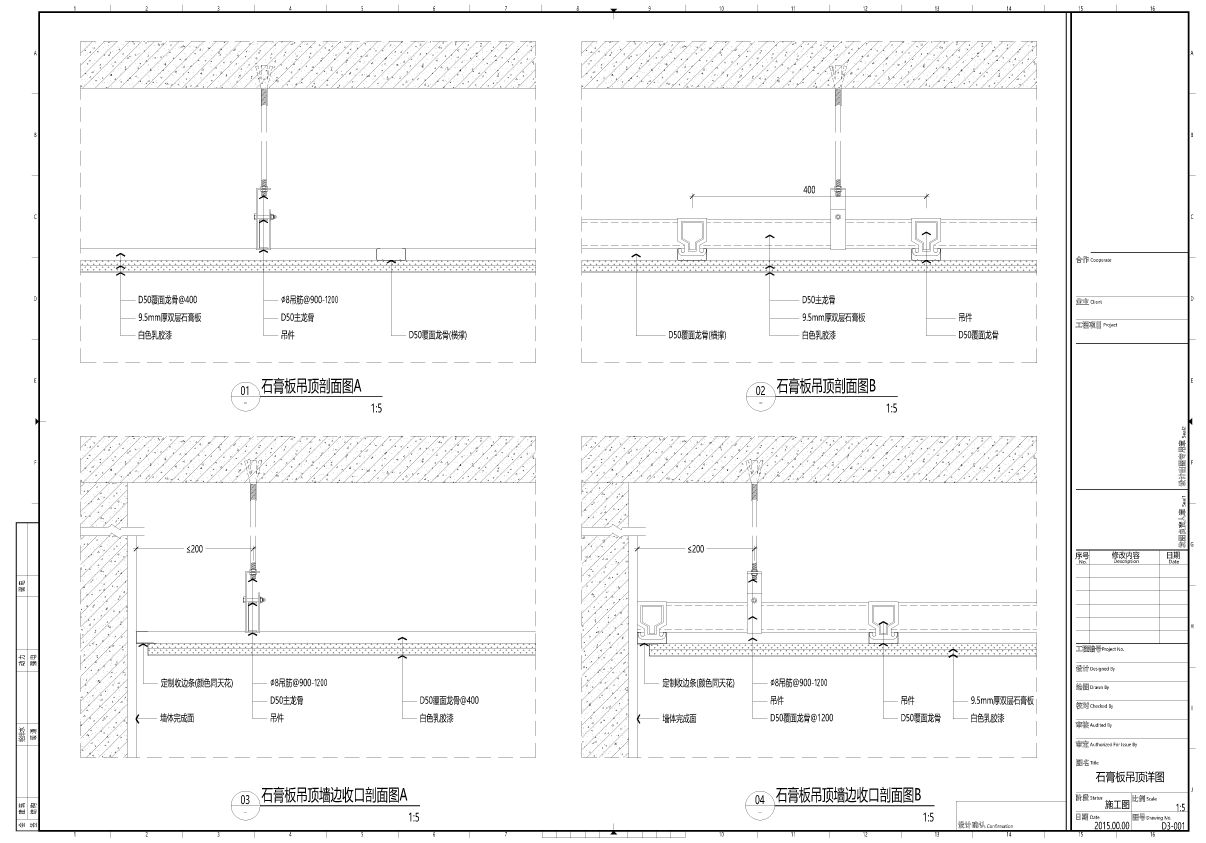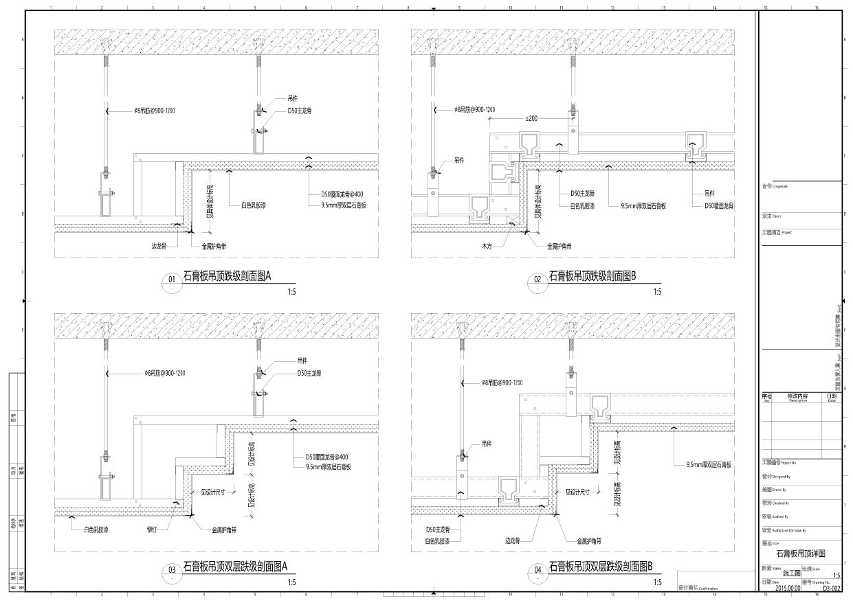 本次节点图包括石膏板吊顶,矿棉板吊顶,金属板吊顶,干挂石材吊顶,木饰面,GRG吊顶,玻璃吊顶,软膜吊顶,收口做法等