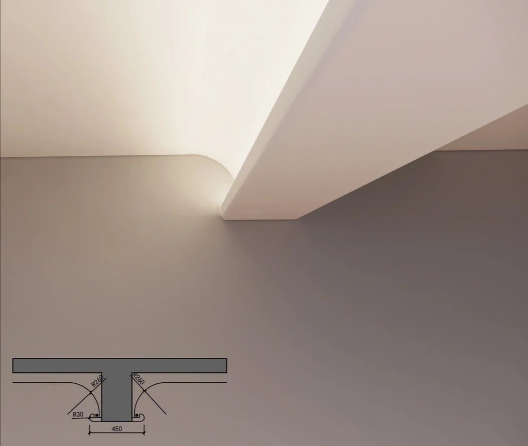 户型优化:解决天花梁的五种设计手法。第一种:圆弧包裹藏光,材料延伸墙面.第二种:圆弧柔化过过渡空间.第三种:两边藏光,材质造型化处理.第四种:圆弧加线性光处理.第五种:双边圆弧藏光,模糊空间处理.