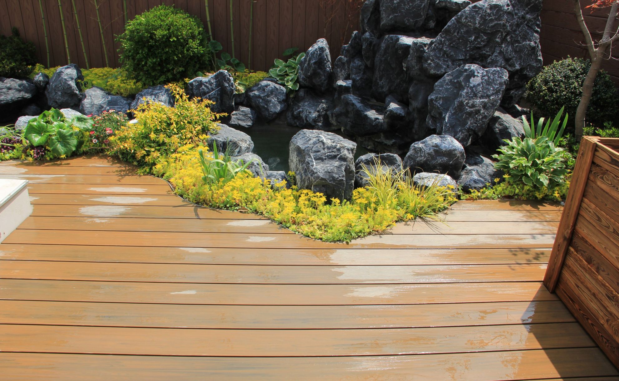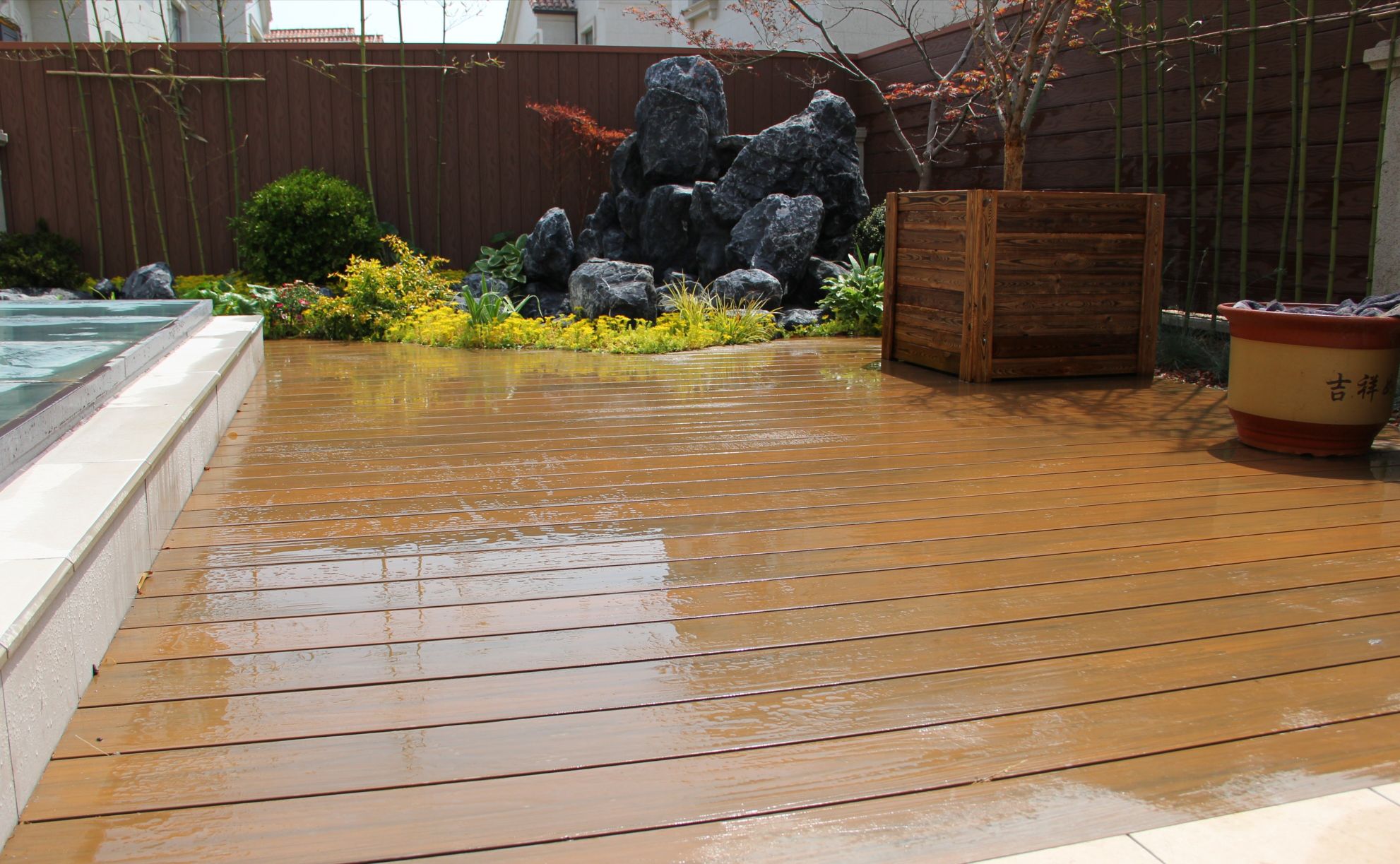 橡木色木塑地板颜色稳重柔和,共挤地板防水防潮,夏天暴晒不易褪色,铺在庭院中的效果美极了。