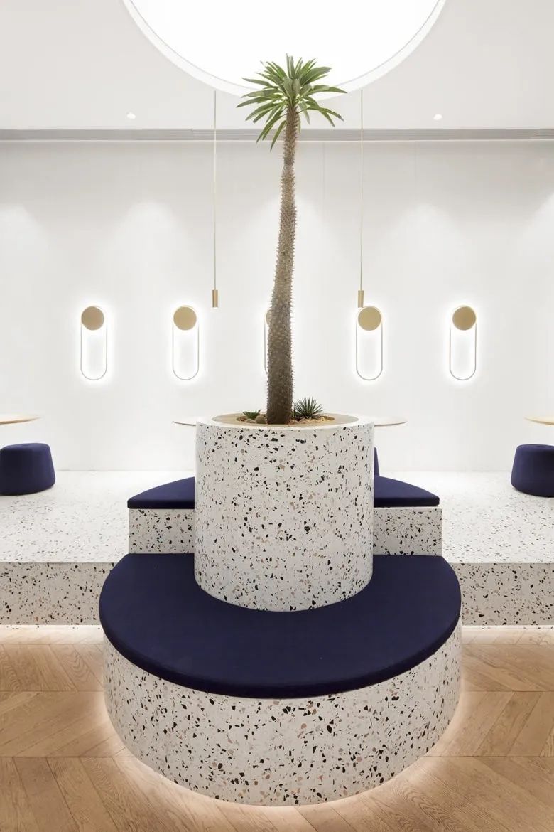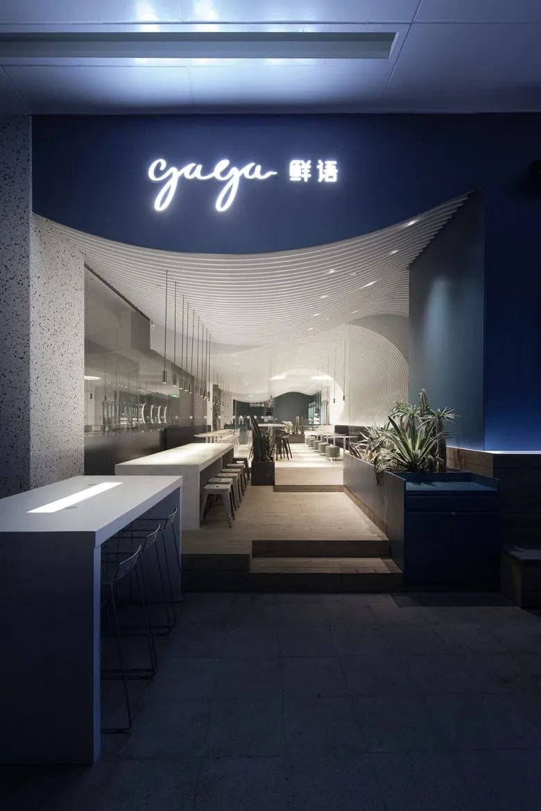 “冷色调”餐厅,金属质感的设计凸显高级,室内的天花板上悬挂着一系列被弯曲的钢板,在打破天花网格的同时也呼应了餐厅的logo设计,这些弯曲的钢板不仅具有装饰功能。还能够在不同季节和不同时间捕获光线,从而使空间的氛围产生不同的变化。