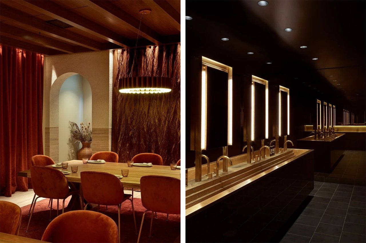餐厅空间以木、石材为主要材料,这也是日本匠人常用的材料。前台区域的木格天花与灯笼墙上下呼应着,规整悬挂的灯笼发出柔和温暖的光,很自然的将客人的视线引入其中。 入口处位于二楼,入口玄关天花较低,墙面设计的处理上以醒目为前提。在入口玄关位置,布设了小巧的枯山水的景观,随处可见的一处一景,让客人们感受到自然、安宁的用餐环境体验。